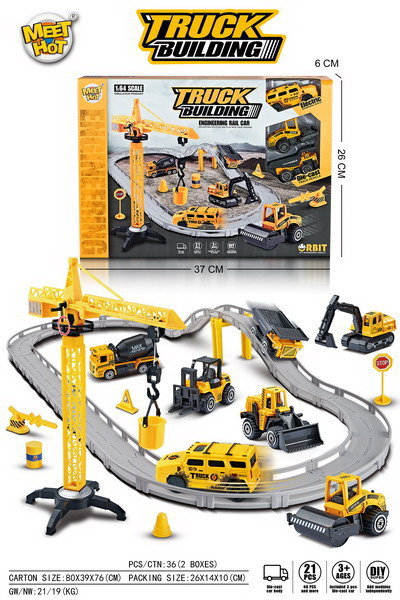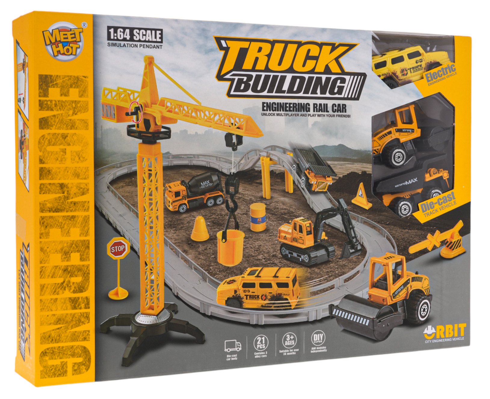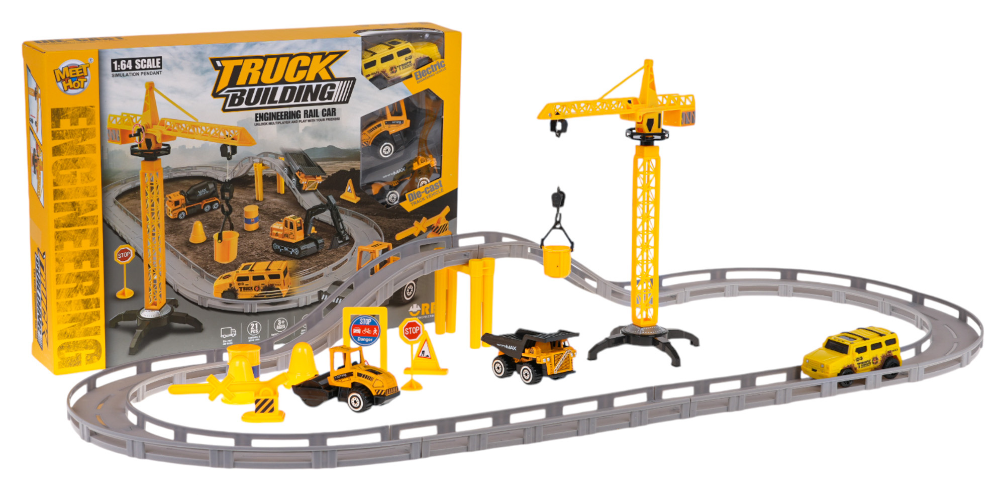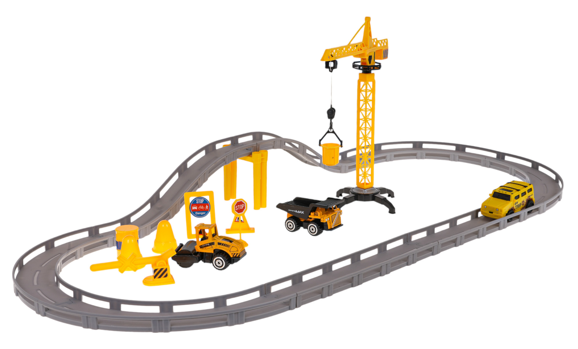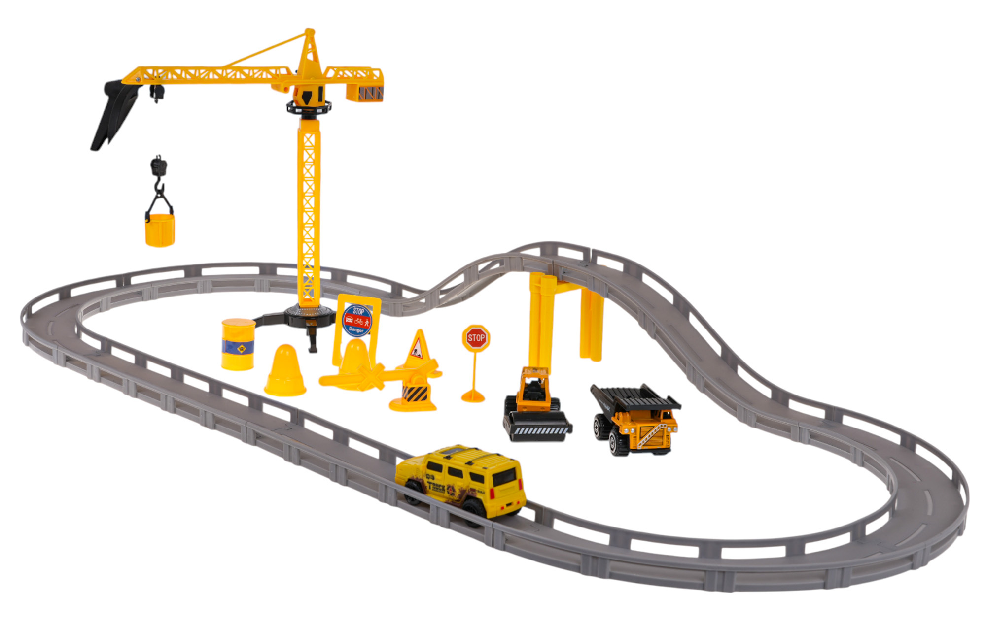 Dráhy jsou vybaveny zábranami, které zabraňují vypadnutí vozidel, a ruční jeřáb s ramenem otočným o 360 stupňů a pohyblivým hákem dodává hernímu zážitku realismus. Díky různým funkcím se děti mohou vžít do rolí řidičů stavebních vozidel a inženýrů a vytvořit si vlastní staveniště.