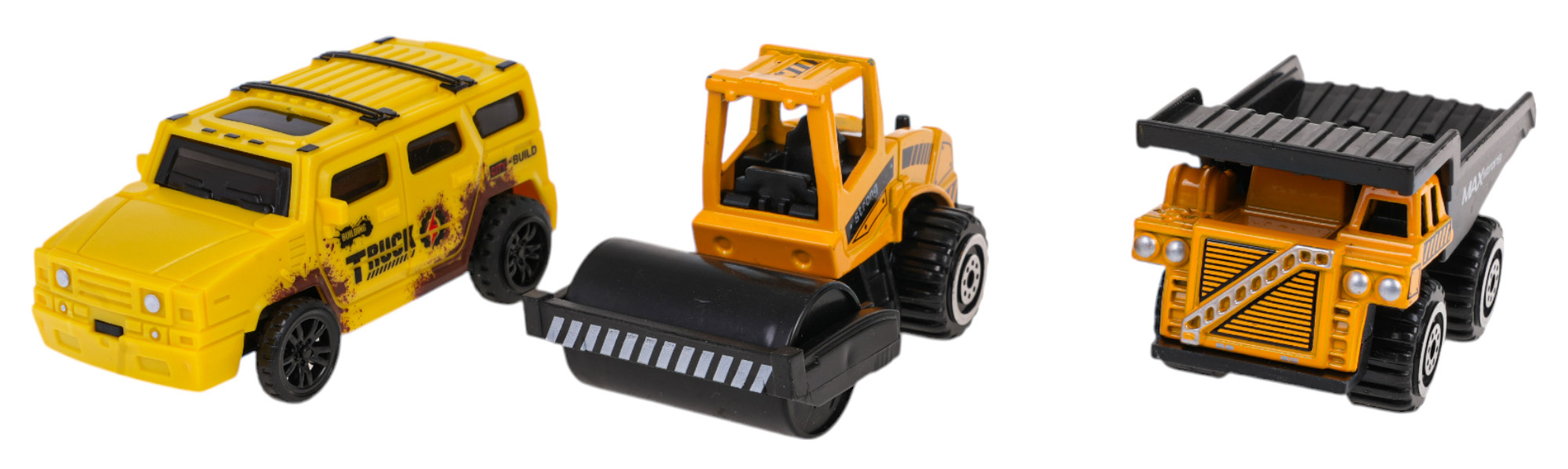Sada obsahuje tři stavební vozidla – sklápěč, válec a elektromobil – která vdechují trať životu. Elektromobil je napájen baterií AA , která není součástí dodávky. Sklápěč má ručně zvedaný přívěs , válec je vybaven otočným bubnem a elektromobil se pohybuje samostatně po trati , což hře dodává dynamický prvek.