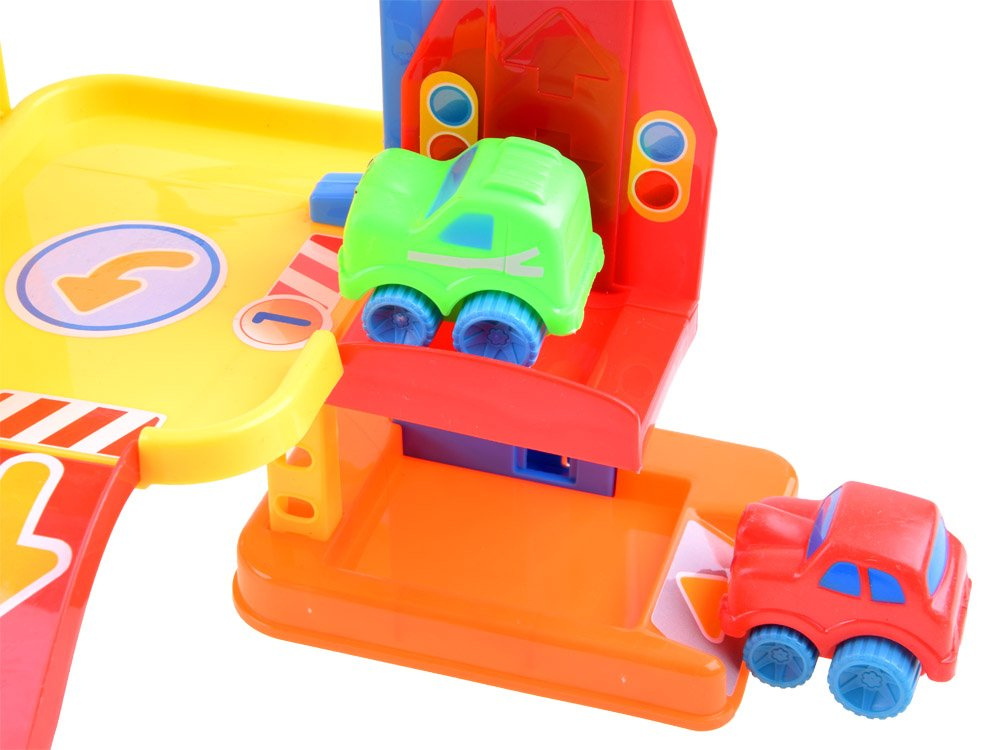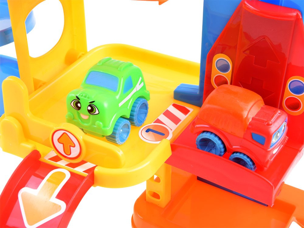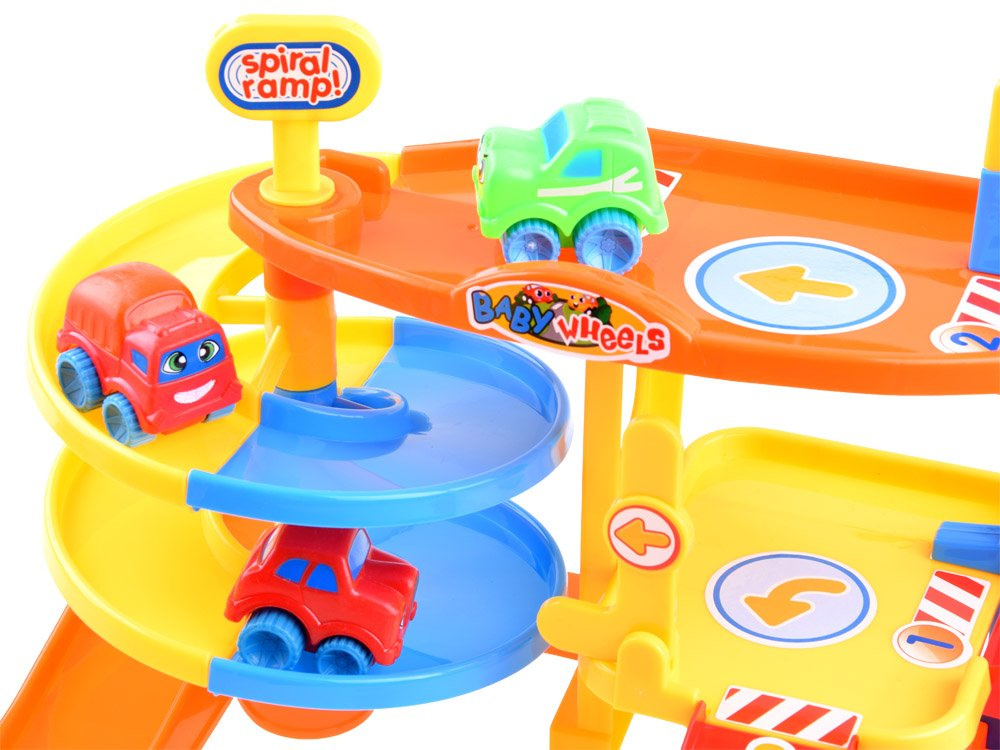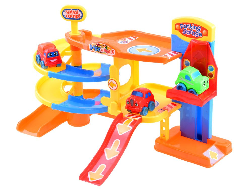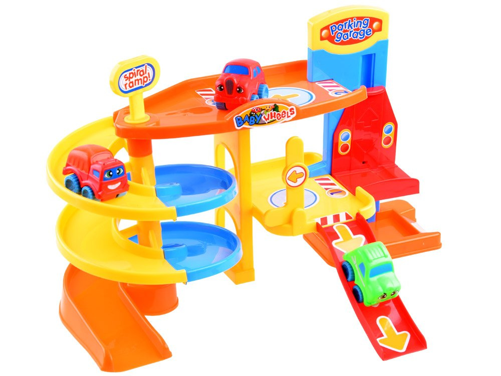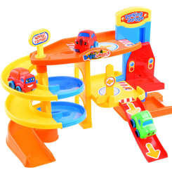 Víceúrovňová garáž zabaví každé dítě na dlouhé hodiny. Hračka je celá vyrobena z plastu v atraktivních barvách. Množství tras, výtah, parkoviště a výjezdy umožní jízdu třemi barevnými vozy. Tvary autíček a kolejí jsou přizpůsobeny malým dětským ručičkám, takže tato hračka je ideální pro každé batole.