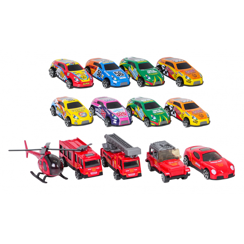 - 12 autíček v sadě a 1 helikoptéra.