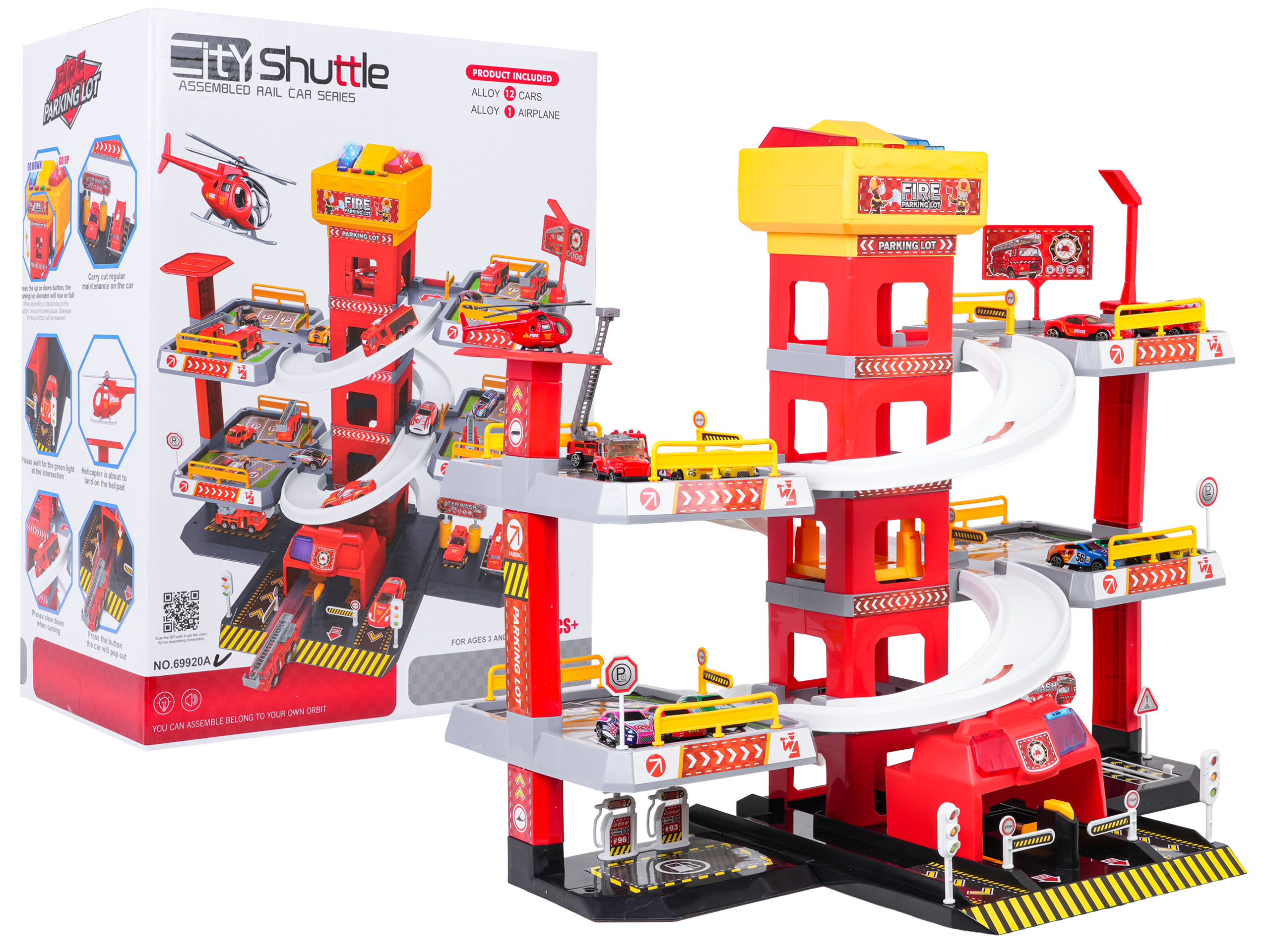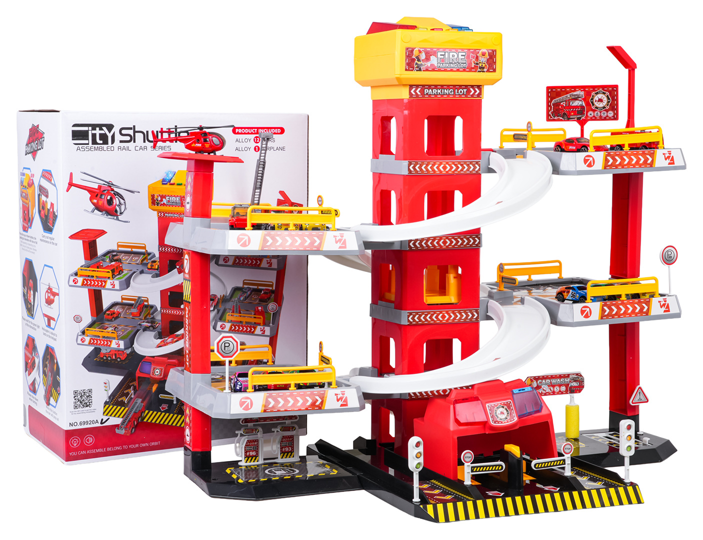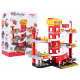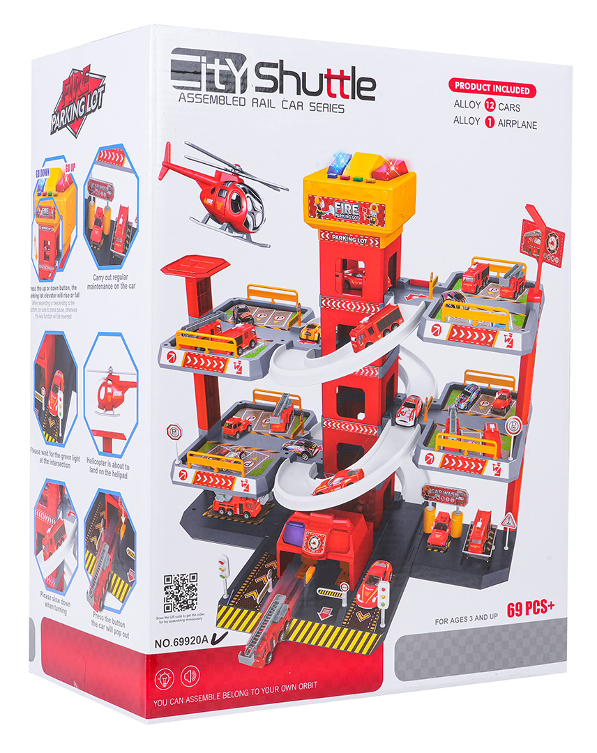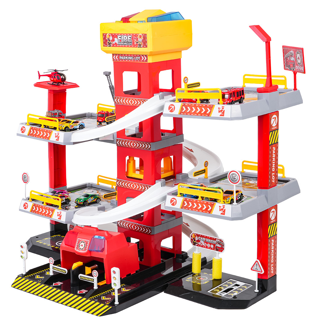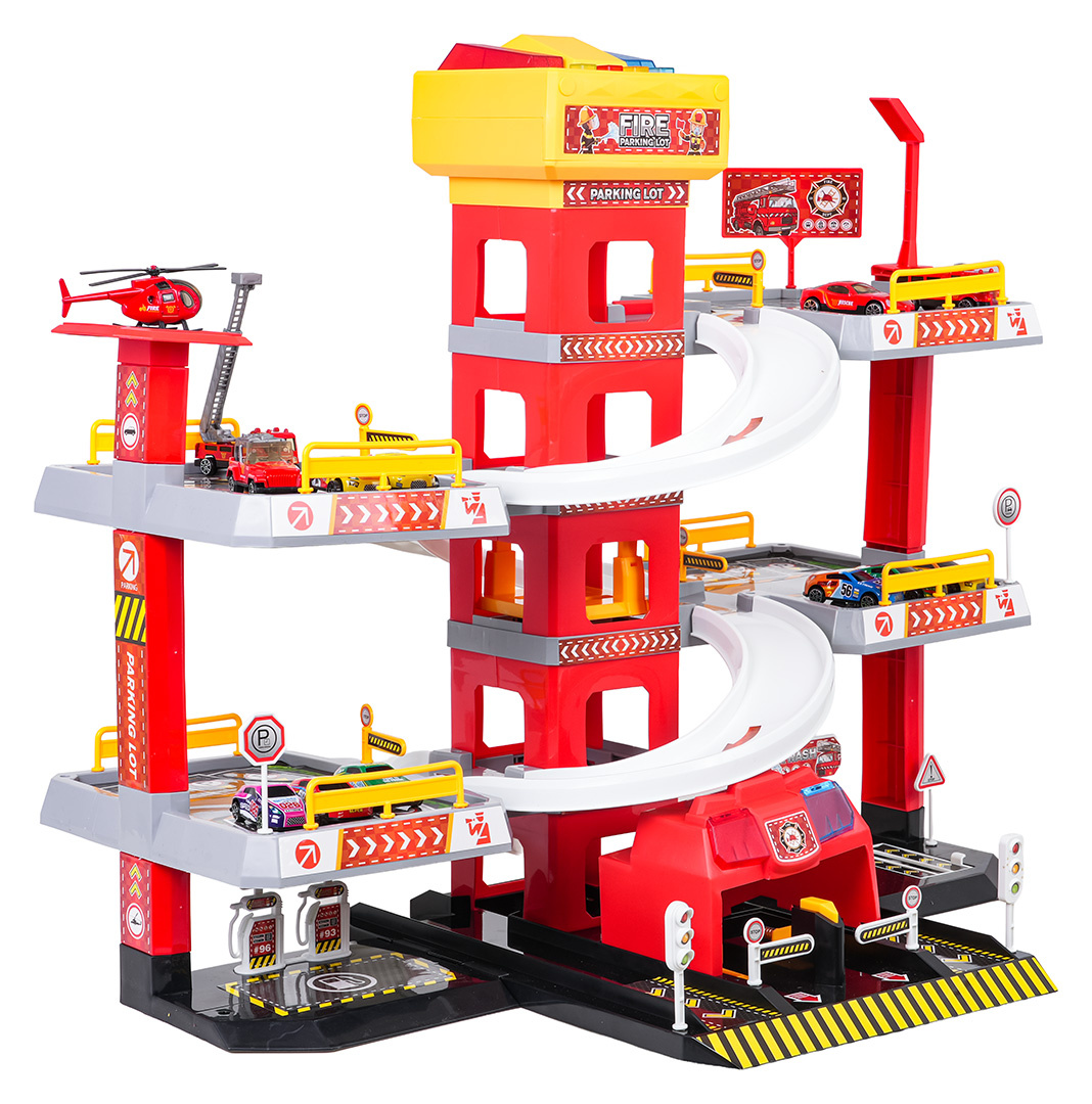 Velké, 3úrovňové parkoviště Hasičského sboru pro děti od tří let. Parkoviště bylo vyrobeno z nejkvalitnějších materiálů v živých barvách. V prvním patře se nachází myčka, dílna, čerpací stanice a výtah, kterým se lze dostat do prvního a druhého patra. Z pater můžeme sjet výtahem nebo skluzavkami pro autíčka. Na vrchu výtahu se nacházejí dvě velká tlačítka a 4 menší. Velká tlačítka ovládají výtah nahoru a dolů, zatímco malá spouštějí zvuky auta, rozjezdu, couvání, zrychlení, brzdění a melodii. Hračka je napájena bateriemi typu 3 x AA 1,5V (nejsou součástí balení).