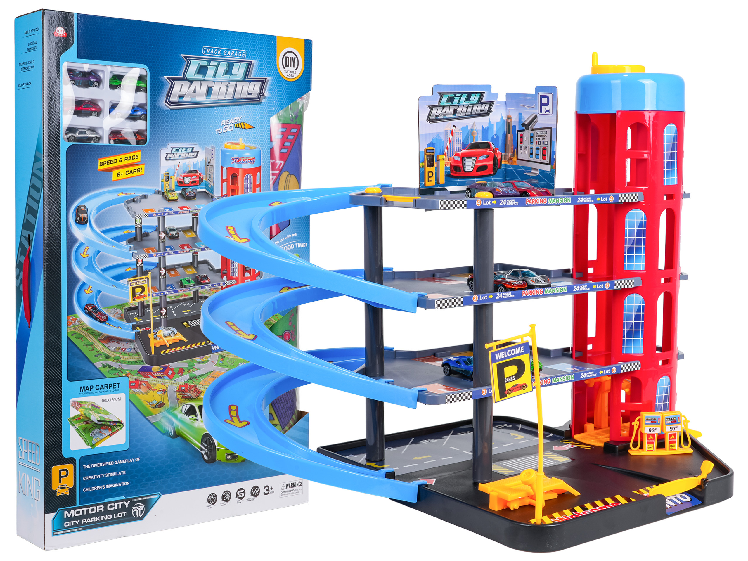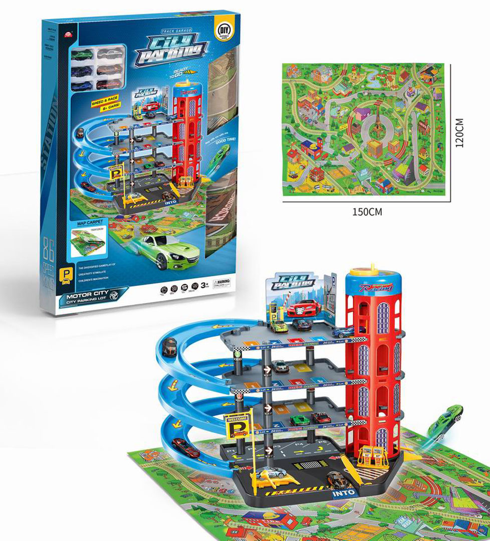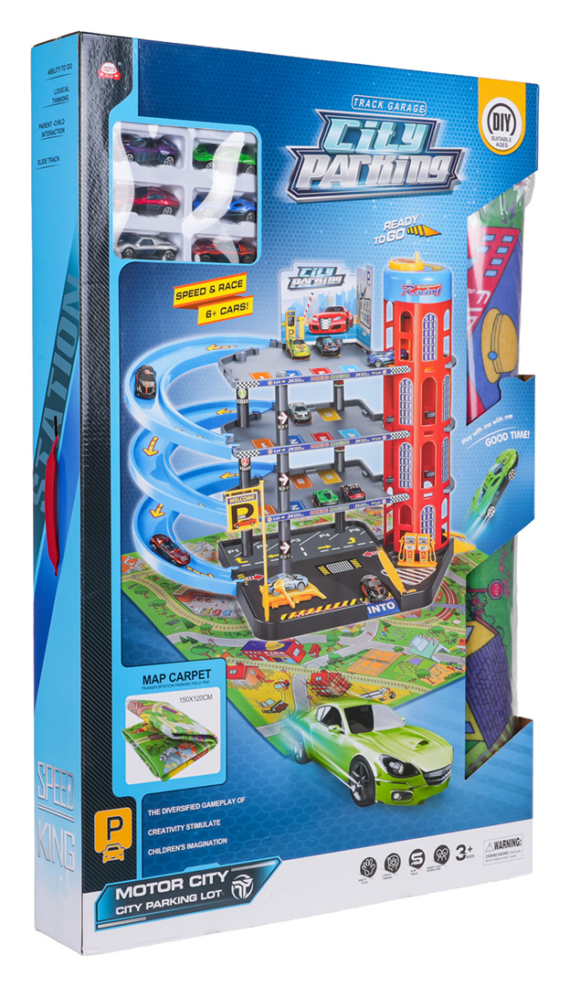 Velké parkoviště s výtahem, skluzavkami pro autíčka a podložkou s cestami je nabídkou pro děti od tří let. Parkoviště má několik úrovní, na které se lze dostat pomocí výtahu. Každá z úrovní je propojena s jinou skluzavkou pro autíčka. Víceúrovňové parkoviště má parkovací místa, čerpací stanici a zvedák pro automobily. Výtah je ovládán ručně (kličkou). V sadě s parkovištěm se nachází také filcová podložka s ulicemi a až 6 vozidel typu angličáky.