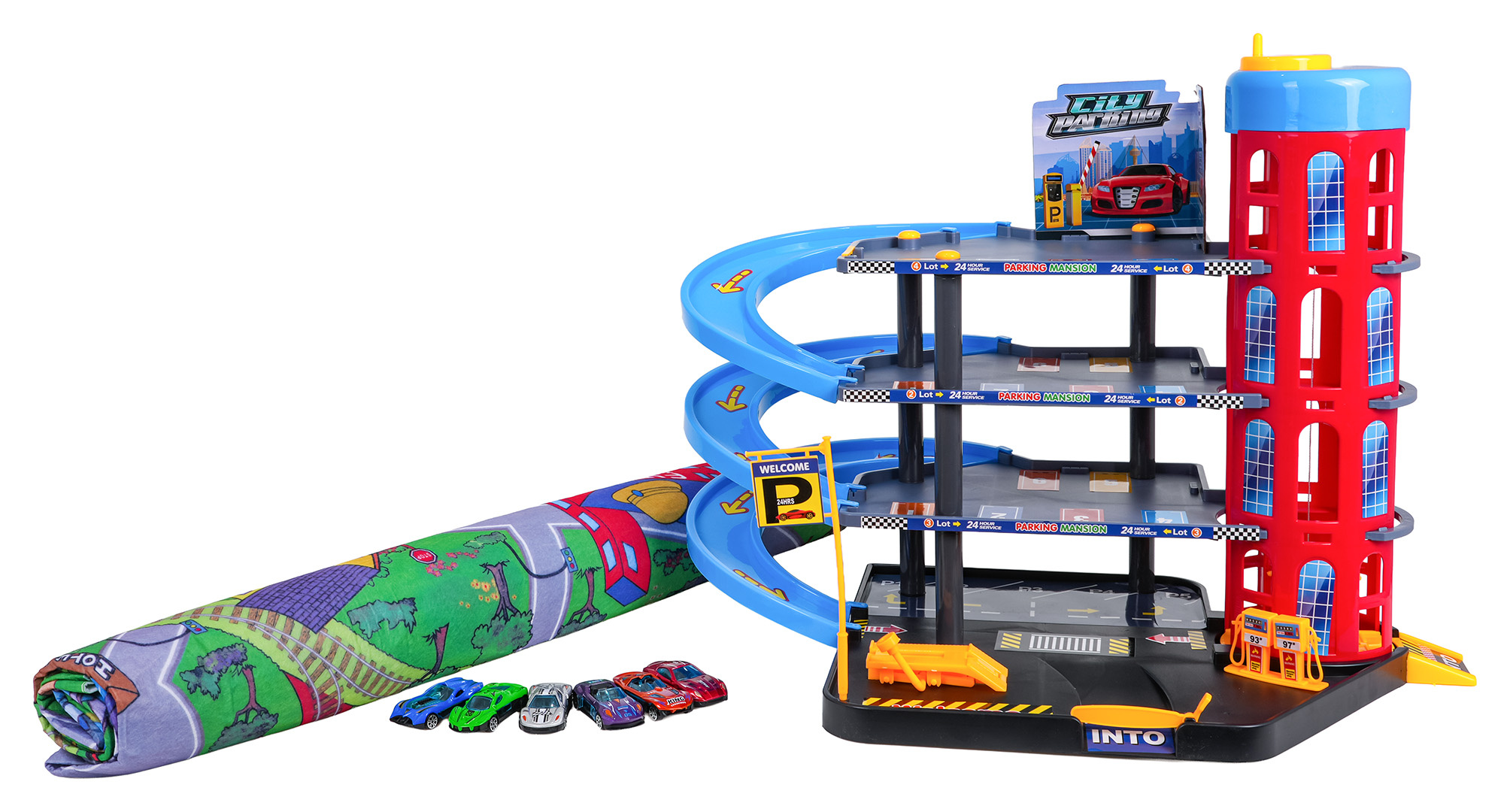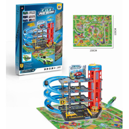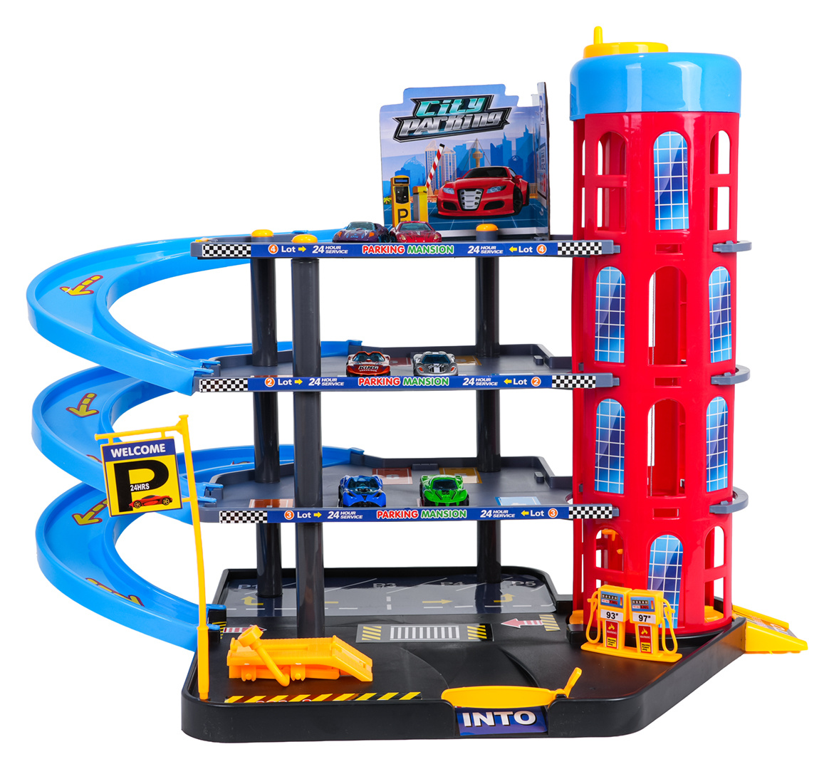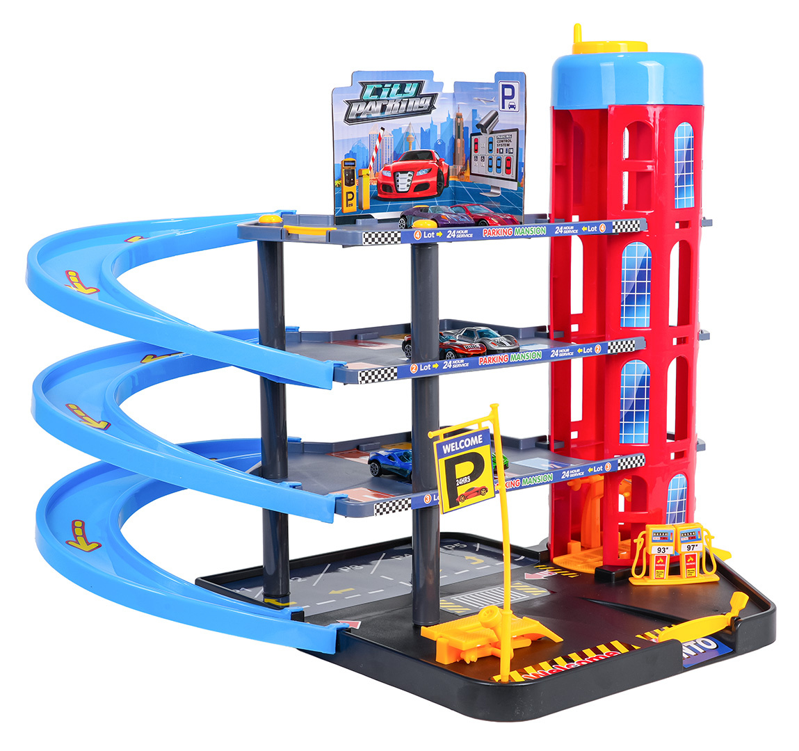 Velké parkoviště s výtahem, skluzavkami pro autíčka a podložkou s cestami je nabídkou pro děti od tří let. Parkoviště má několik úrovní, na které se lze dostat pomocí výtahu. Každá z úrovní je propojena s jinou skluzavkou pro autíčka. Víceúrovňové parkoviště má parkovací místa, čerpací stanici a zvedák pro automobily. Výtah je ovládán ručně (kličkou). V sadě s parkovištěm se nachází také filcová podložka s ulicemi a až 6 vozidel typu angličáky.