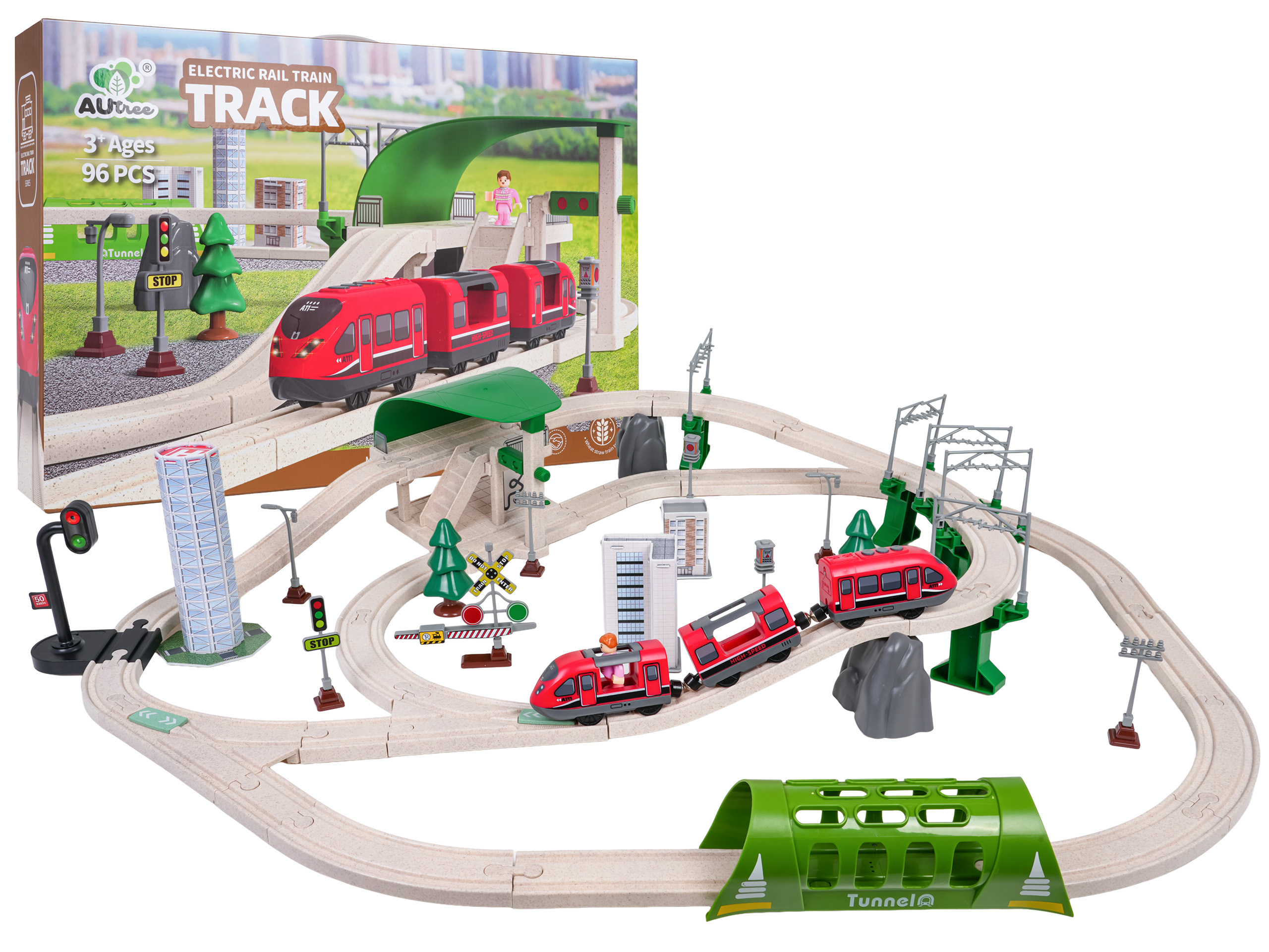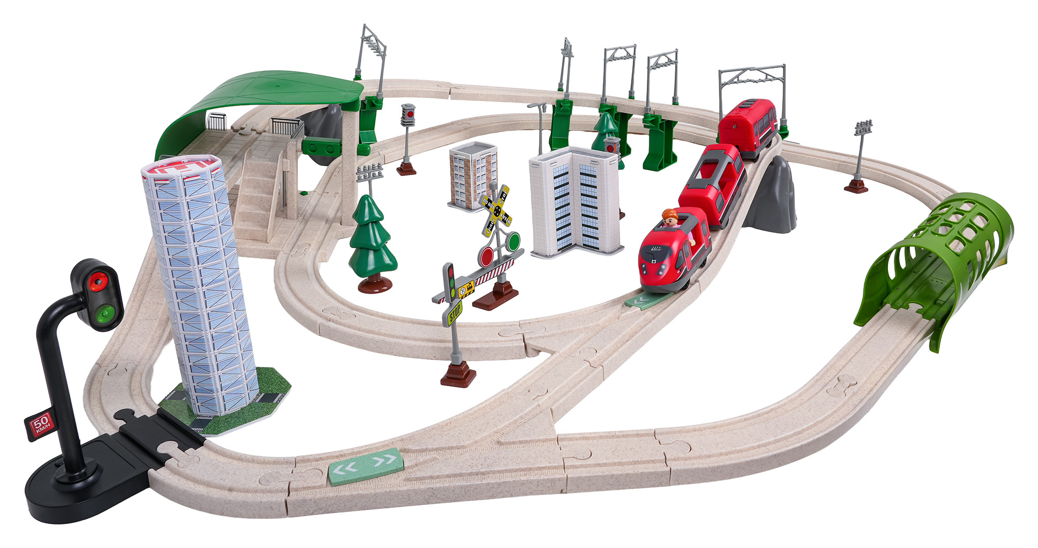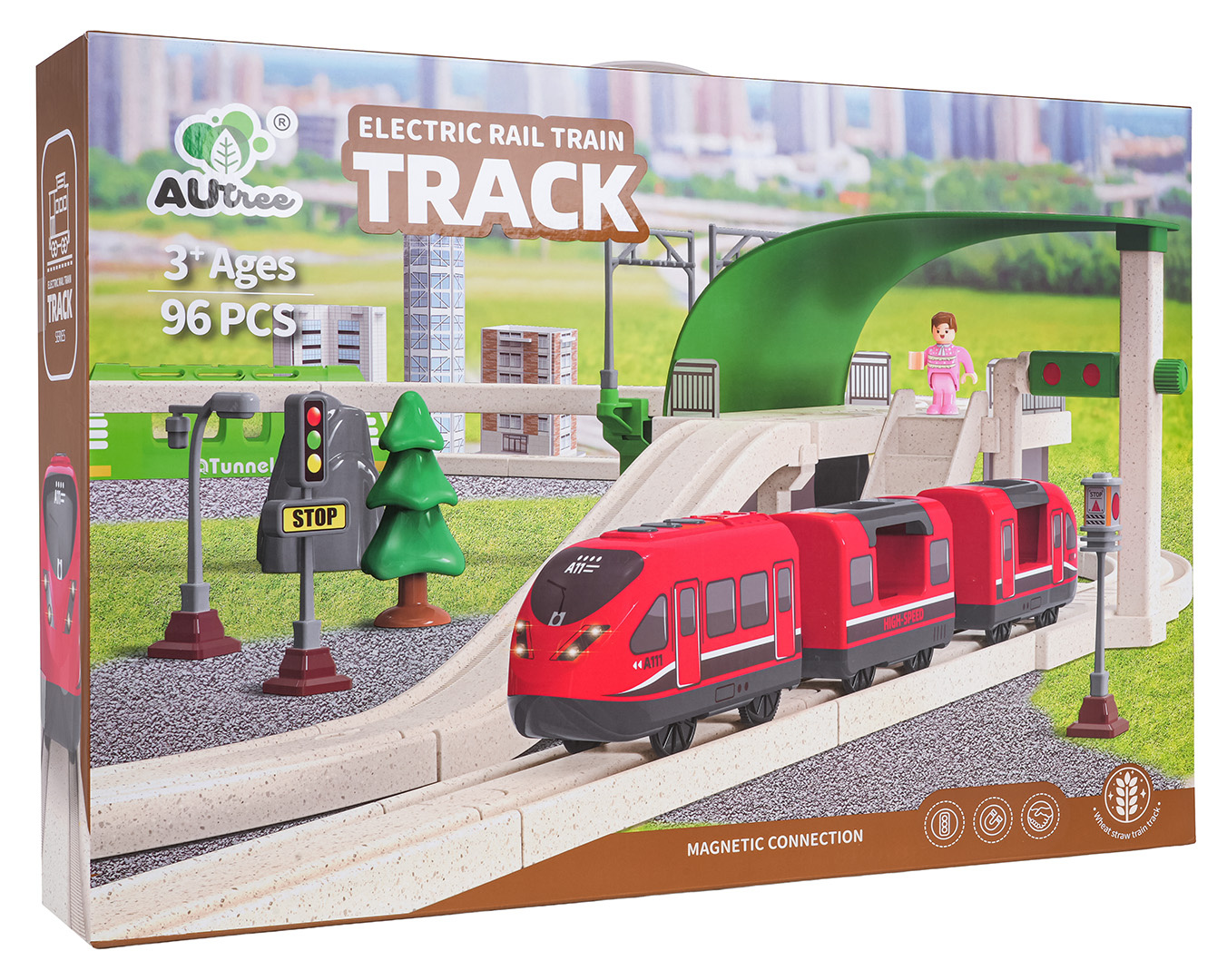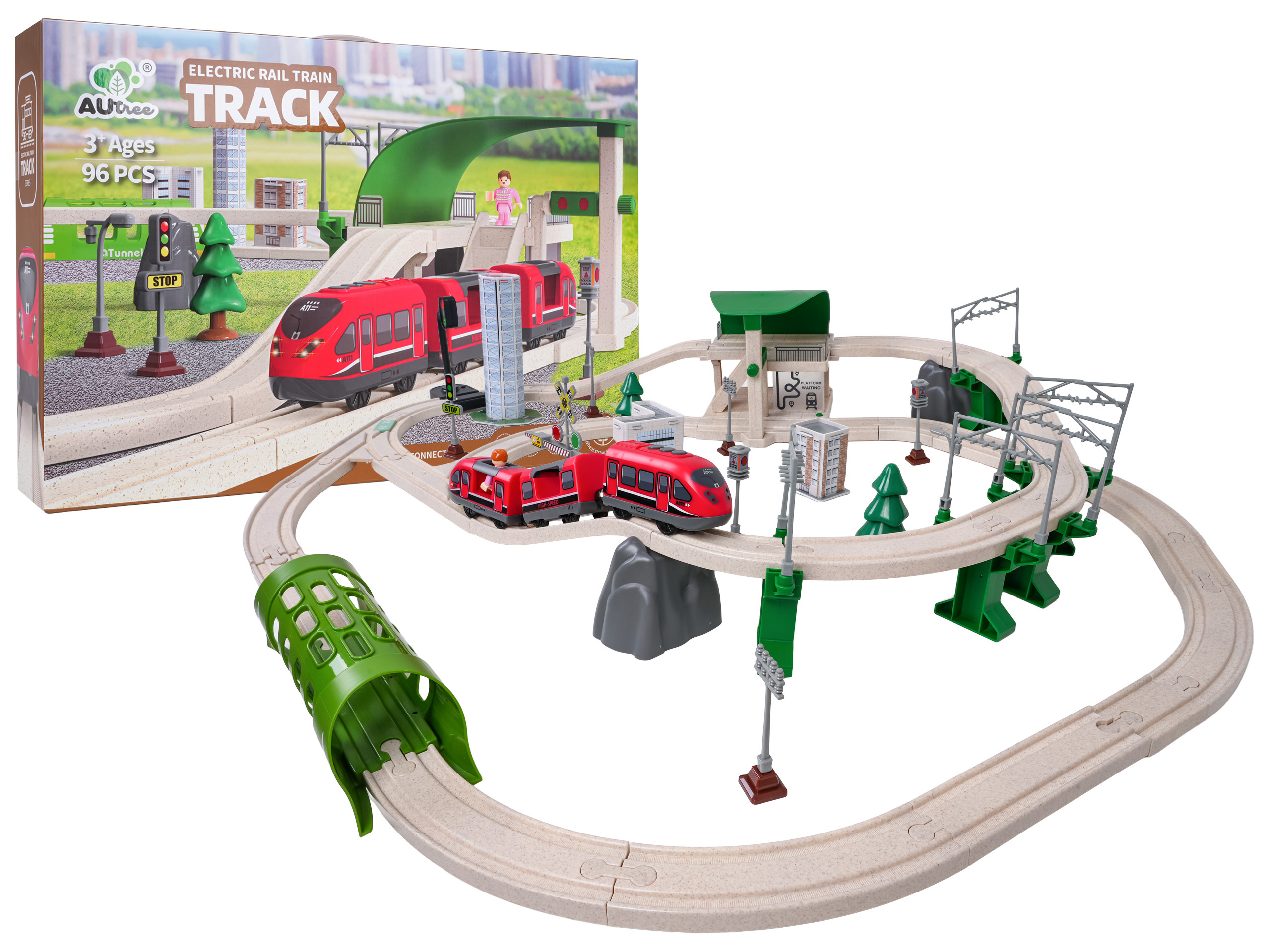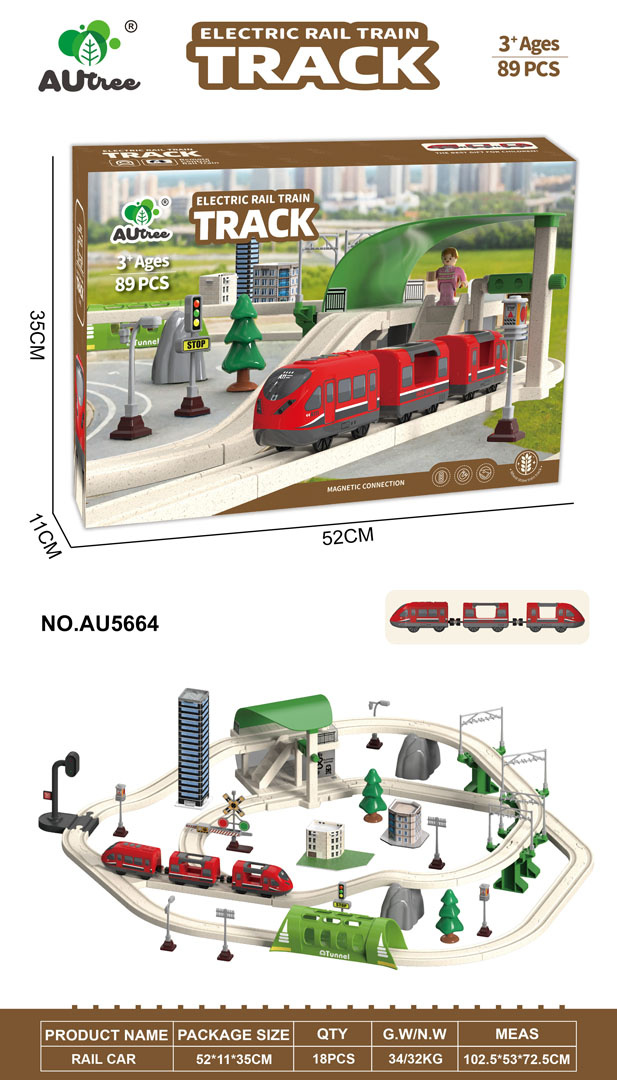 Interaktivní vláček pro děti od tří let. Sada je vyrobena z bezpečných a odolných materiálů, což zaručuje její spolehlivost a dlouhou životnost. V sadě se nacházejí koleje, po kterých se pohybuje vlak, budova stanice, tunel, je zde také semafor. Vybavení zahrnuje také městské budovy, dopravní značky a figurku. Tato sada nabízí mnoho možností kreativní zábavy. Tunel je napájen bateriemi typu 3 x AG13 (v balení), projíždějící vlak spouští zvuky jízdy vlaku a barevná blikající světla. Železniční stanice je napájena bateriemi typu 3 x AG3 (v balení), má podsvícení a vydává zvuky jízdy vlaku. Semafor je napájen bateriemi typu 3 x AG3 (v balení) a má světelné efekty v podobě měnících se světýlek. Vlak je napájen bateriemi typu 2 x AAA 1,5V (nejsou součástí balení), jezdí dopředu a dozadu, vydává zvuky jízdy a má podsvícené přední reflektory.