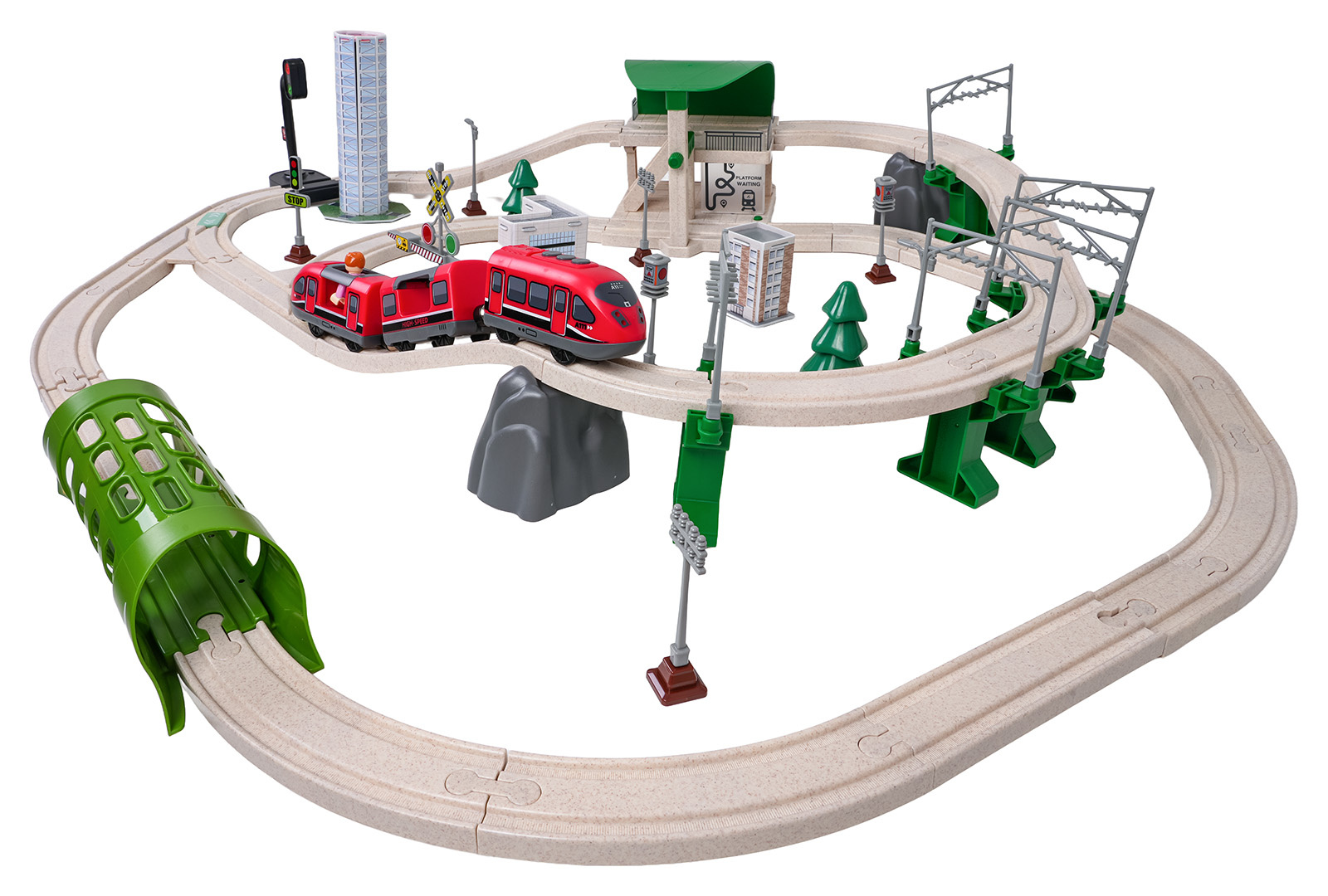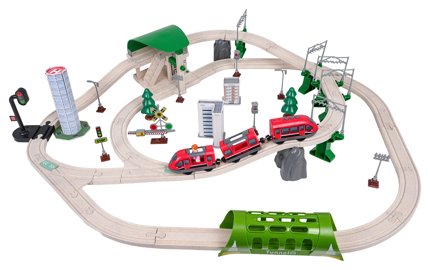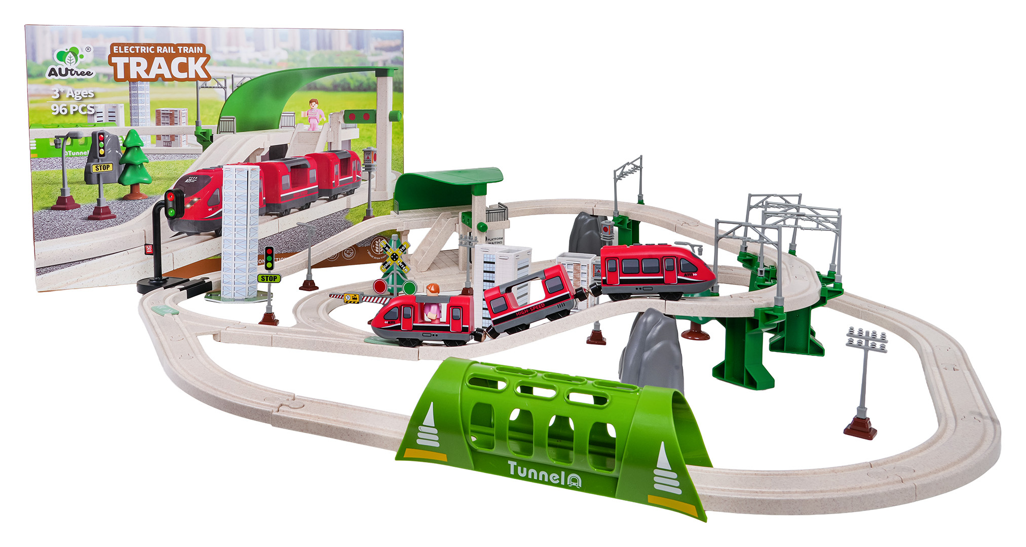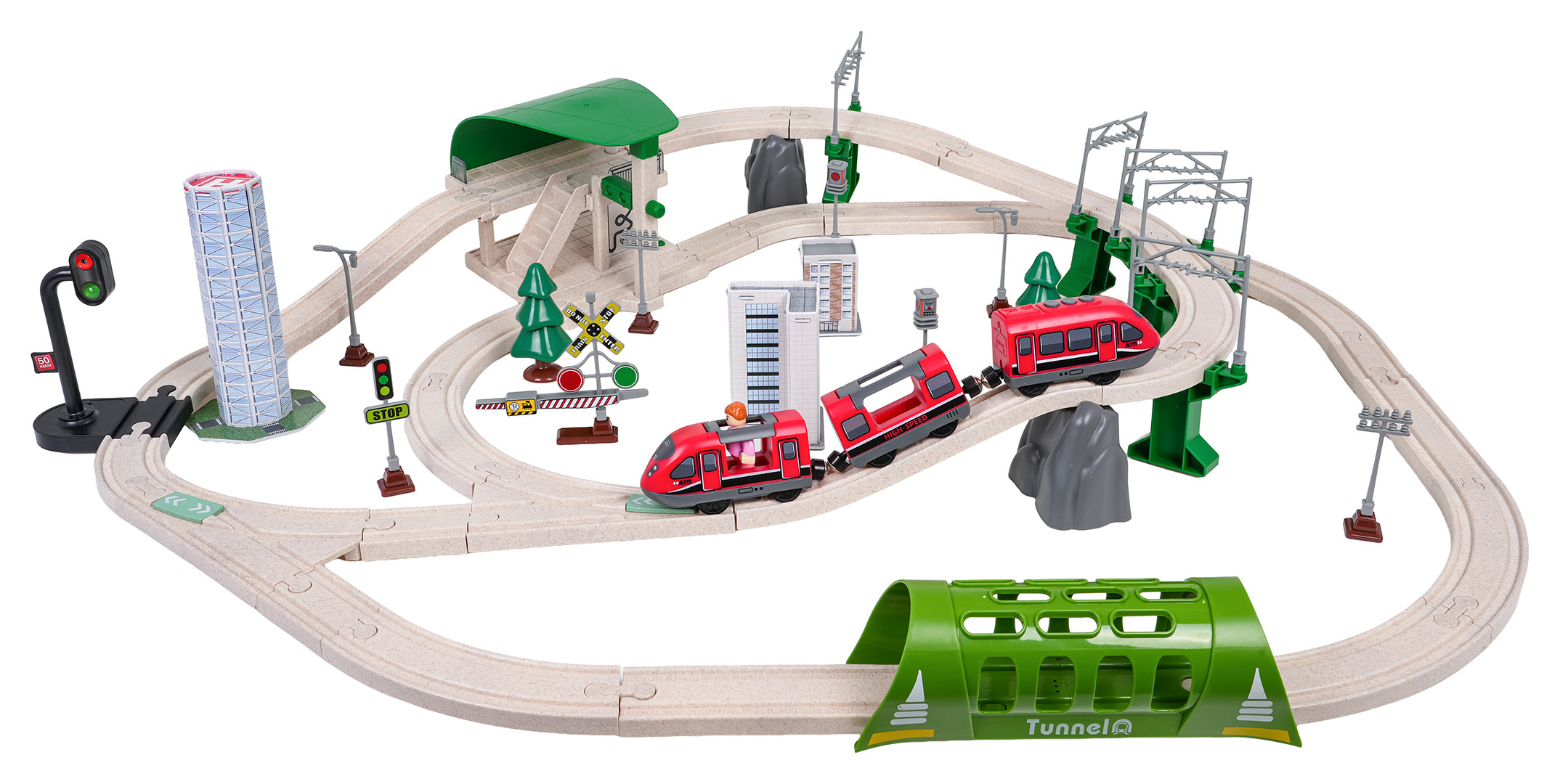 Interaktivní vláček pro děti od tří let. Sada je vyrobena z bezpečných a odolných materiálů, což zaručuje její spolehlivost a dlouhou životnost. V sadě se nacházejí koleje, po kterých se pohybuje vlak, budova stanice, tunel, je zde také semafor. Vybavení zahrnuje také městské budovy, dopravní značky a figurku. Tato sada nabízí mnoho možností kreativní zábavy. Tunel je napájen bateriemi typu 3 x AG13 (v balení), projíždějící vlak spouští zvuky jízdy vlaku a barevná blikající světla. Železniční stanice je napájena bateriemi typu 3 x AG3 (v balení), má podsvícení a vydává zvuky jízdy vlaku. Semafor je napájen bateriemi typu 3 x AG3 (v balení) a má světelné efekty v podobě měnících se světýlek. Vlak je napájen bateriemi typu 2 x AAA 1,5V (nejsou součástí balení), jezdí dopředu a dozadu, vydává zvuky jízdy a má podsvícené přední reflektory.