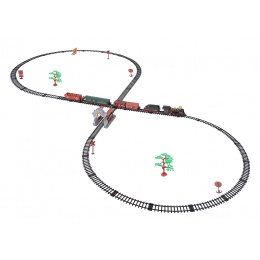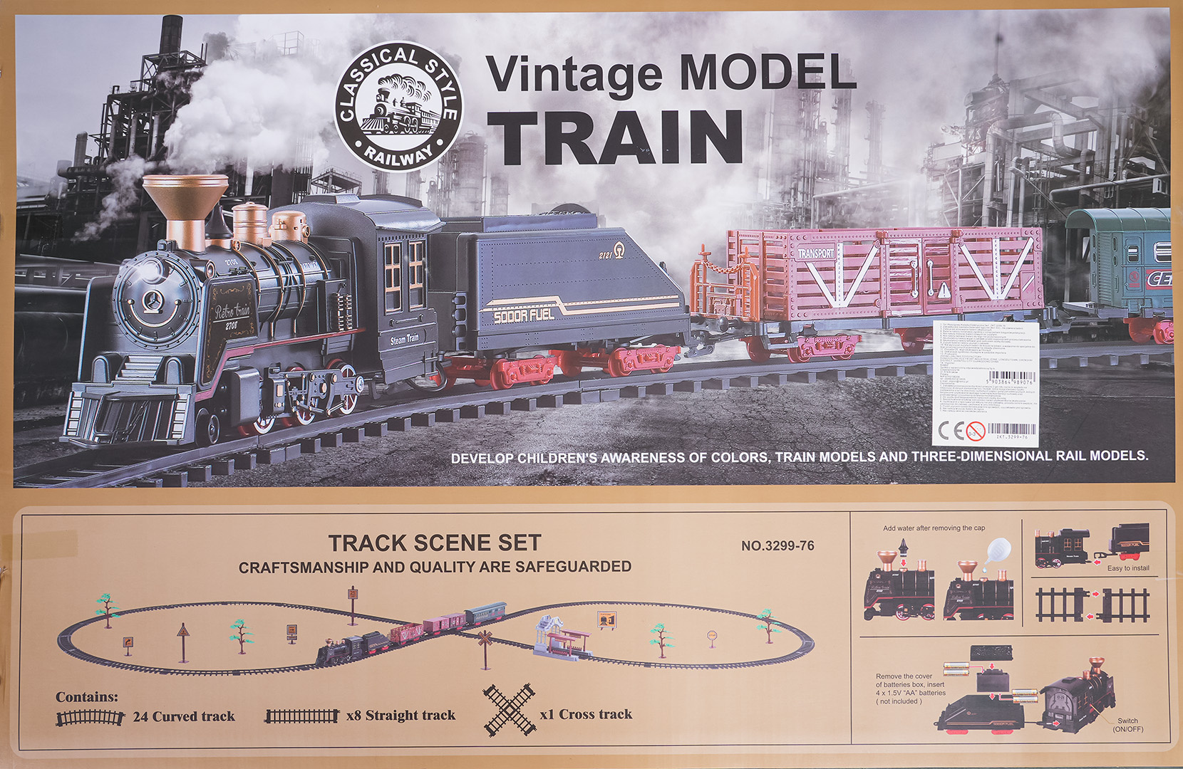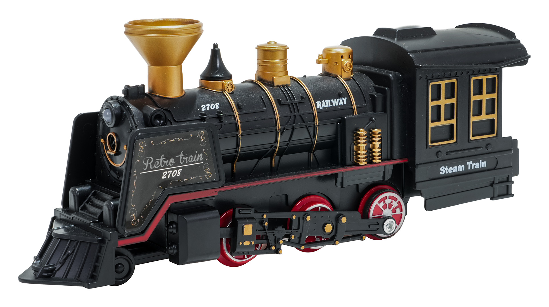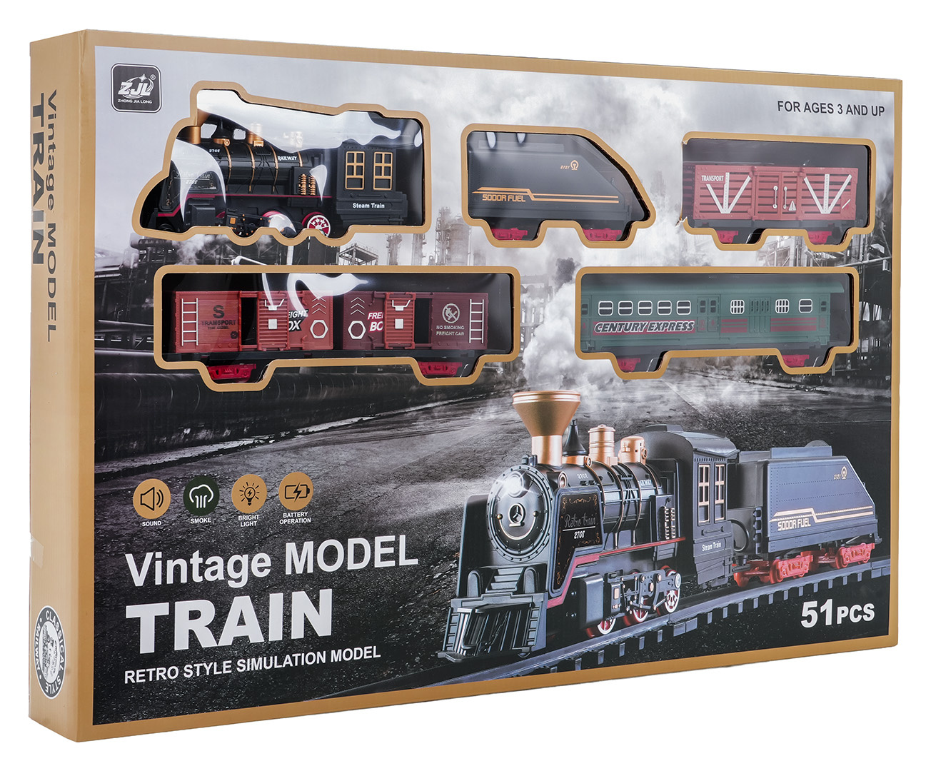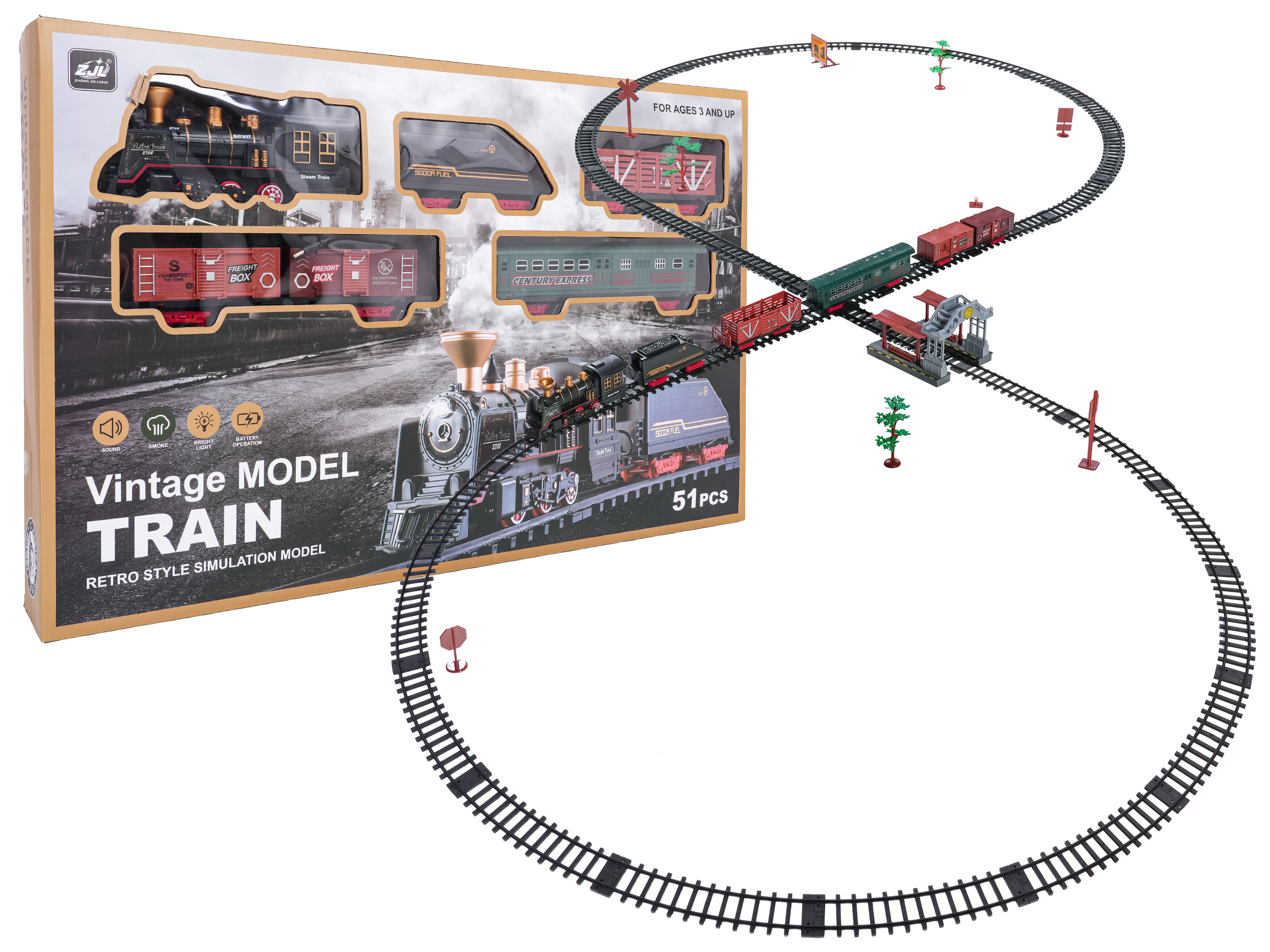 Retro sada, vláček s funkcí kouře, světla a zvuku pro děti od tří let. Hračka je napájena bateriemi typu 4 x AA 1,5V (nejsou součástí balení) - montují se do vagónu s uhlím. Během jízdy lokomotiva vypouští komínem kouř (po předchozím doplnění vodou (pipetka na vodu je součástí sady), svítí přední reflektor a slyšíme zvuky jízdy. Koleje jsou odolné a bezpečné a mají snadný způsob spojování.