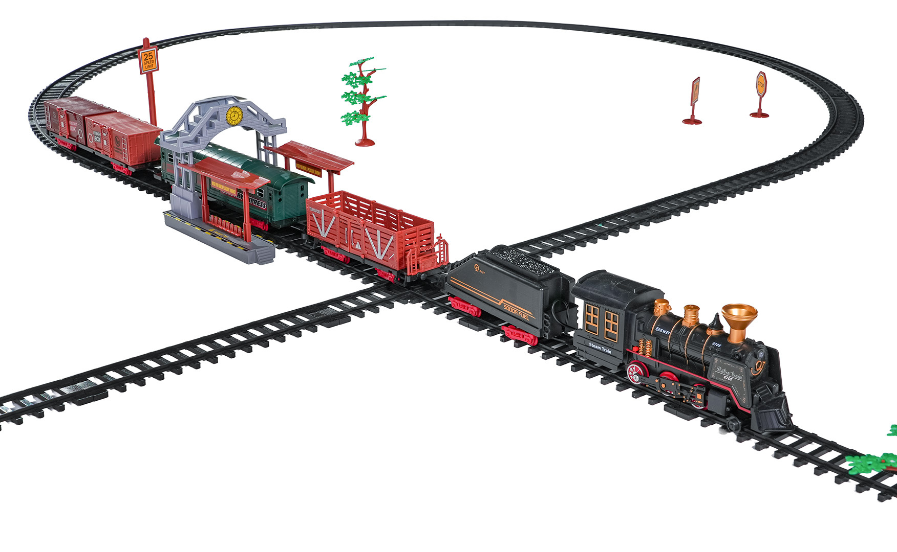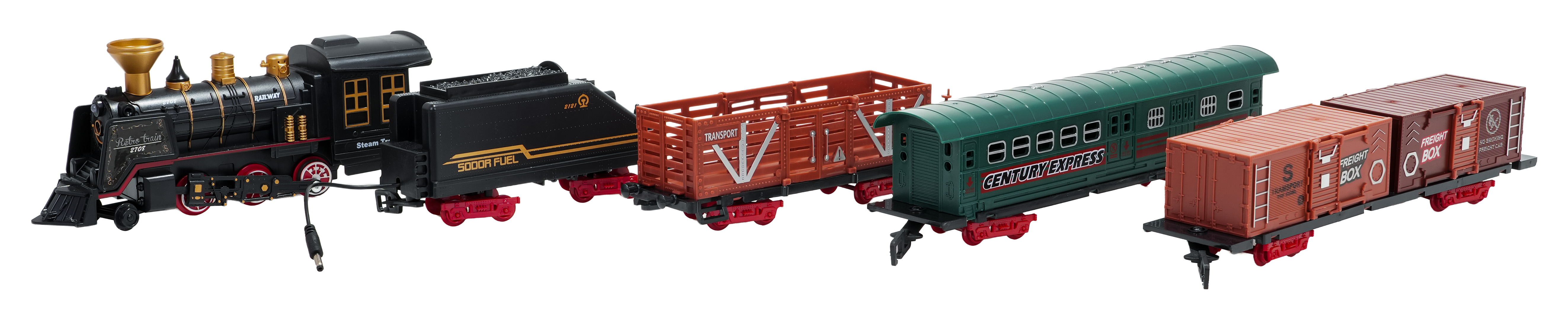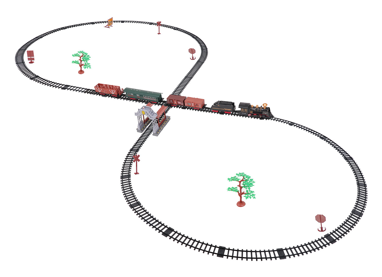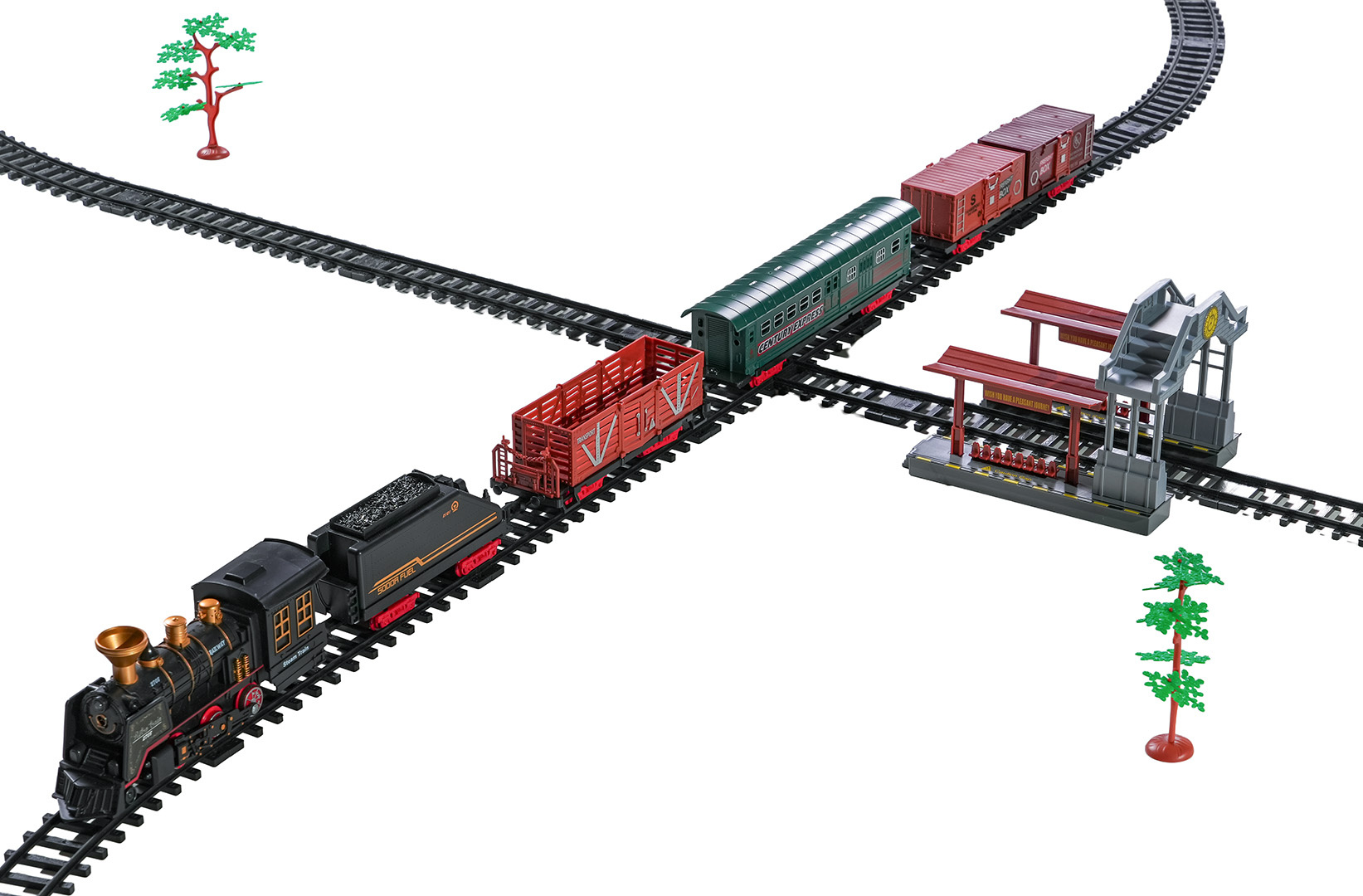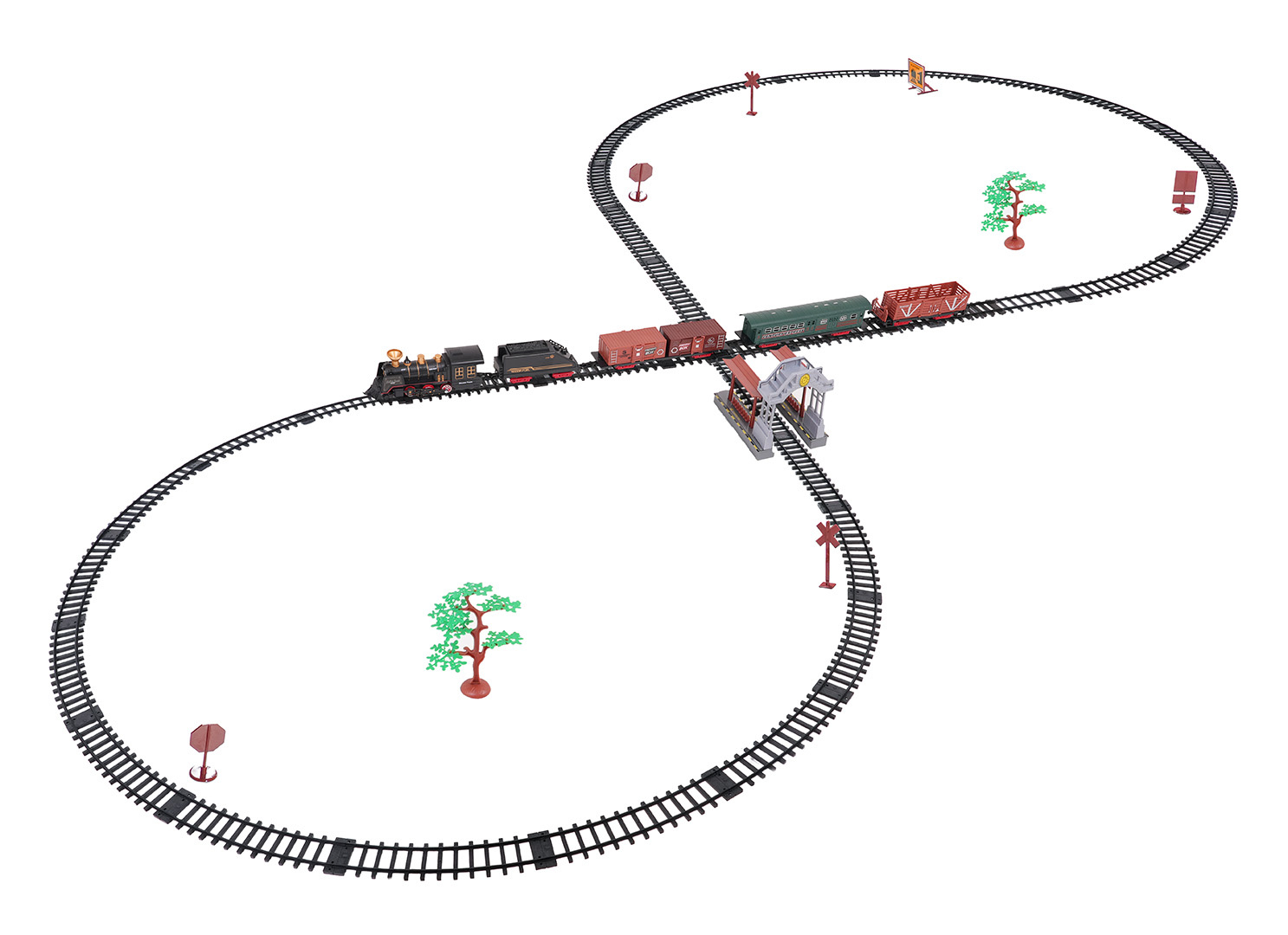 Retro sada, vláček s funkcí kouře, světla a zvuku pro děti od tří let. Hračka je napájena bateriemi typu 4 x AA 1,5V (nejsou součástí balení) - montují se do vagónu s uhlím. Během jízdy lokomotiva vypouští komínem kouř (po předchozím doplnění vodou (pipetka na vodu je součástí sady), svítí přední reflektor a slyšíme zvuky jízdy. Koleje jsou odolné a bezpečné a mají snadný způsob spojování.