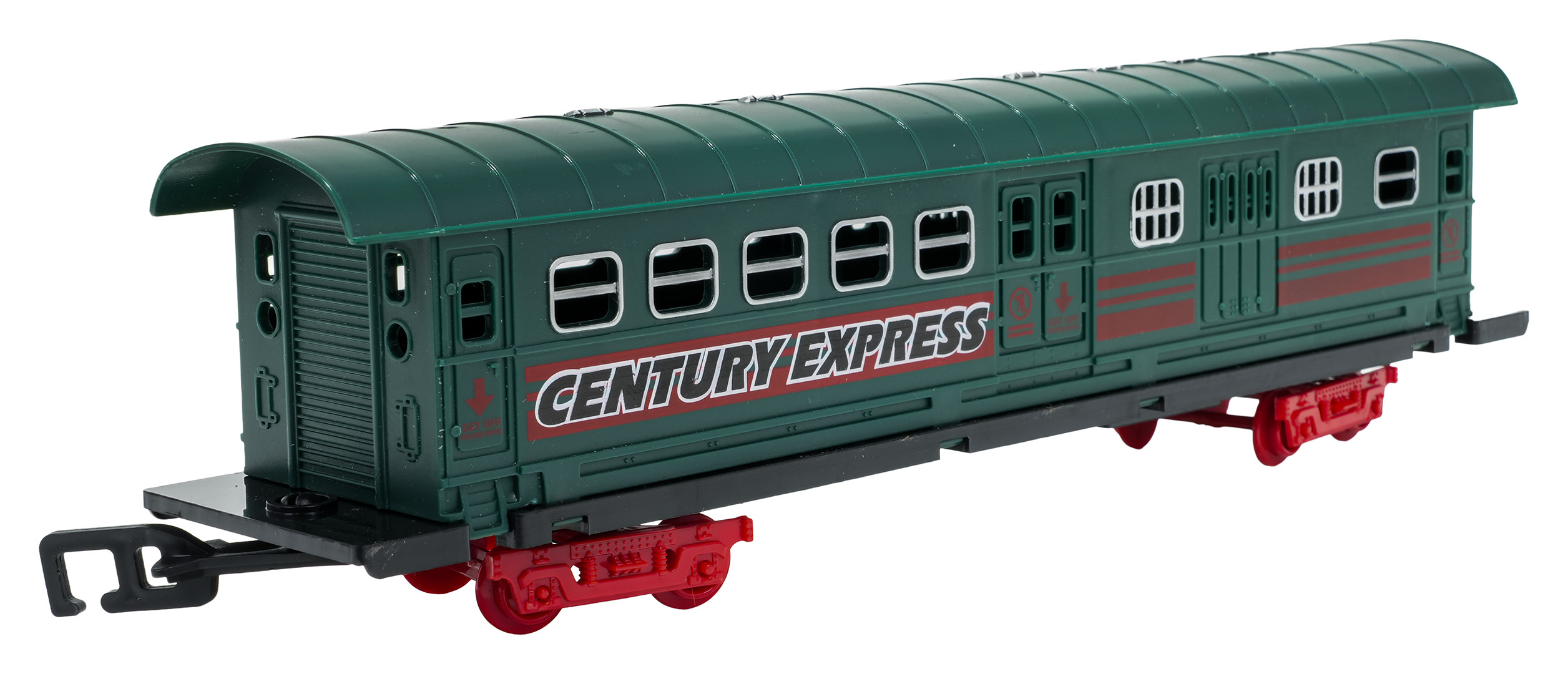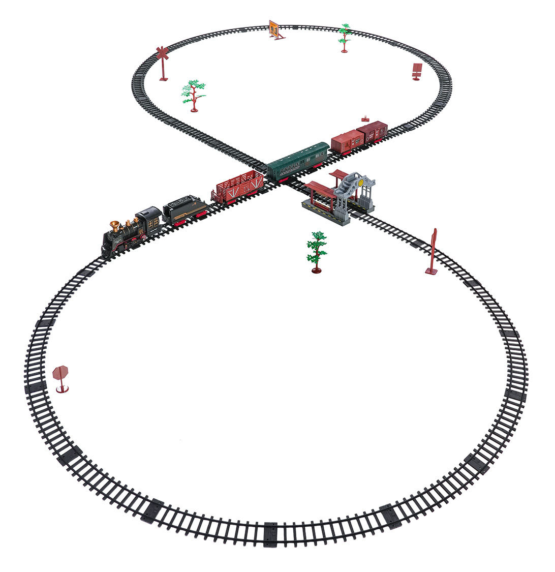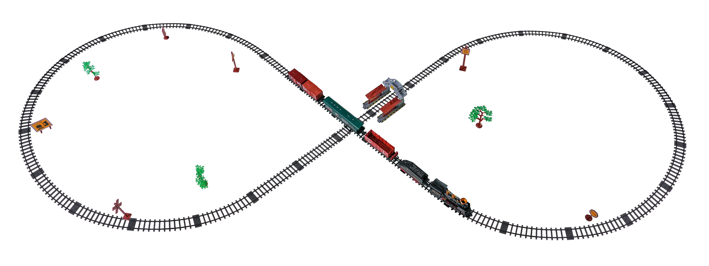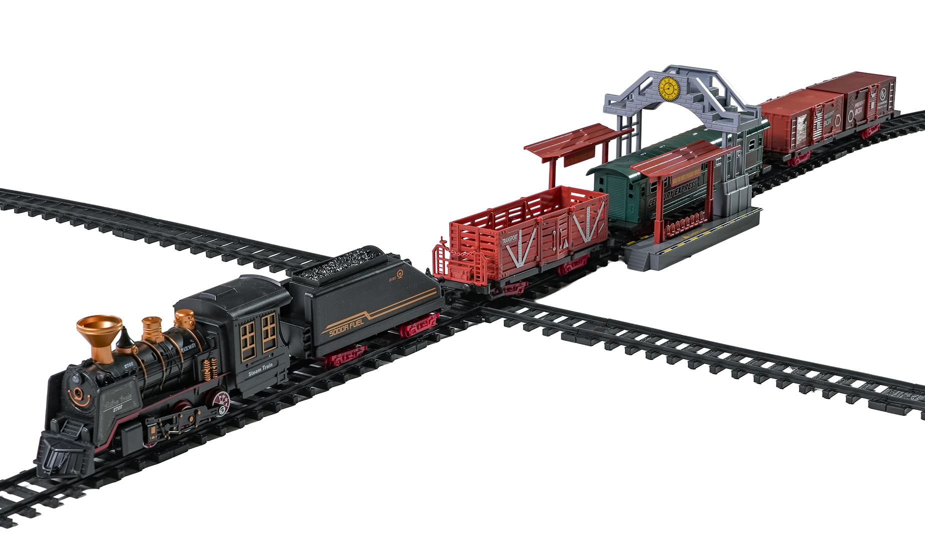 Retro sada, vláček s funkcí kouře, světla a zvuku pro děti od tří let. Hračka je napájena bateriemi typu 4 x AA 1,5V (nejsou součástí balení) - montují se do vagónu s uhlím. Během jízdy lokomotiva vypouští komínem kouř (po předchozím doplnění vodou (pipetka na vodu je součástí sady), svítí přední reflektor a slyšíme zvuky jízdy. Koleje jsou odolné a bezpečné a mají snadný způsob spojování.