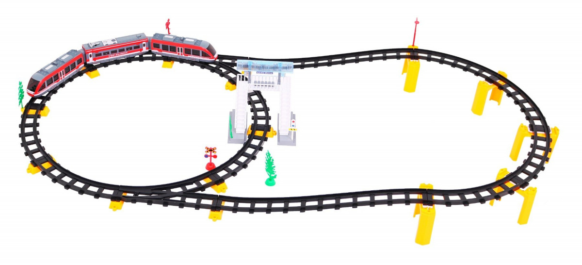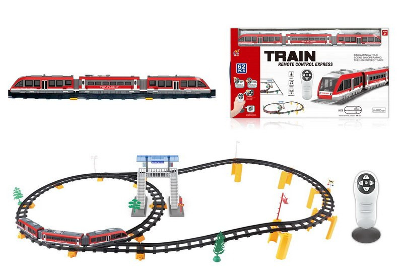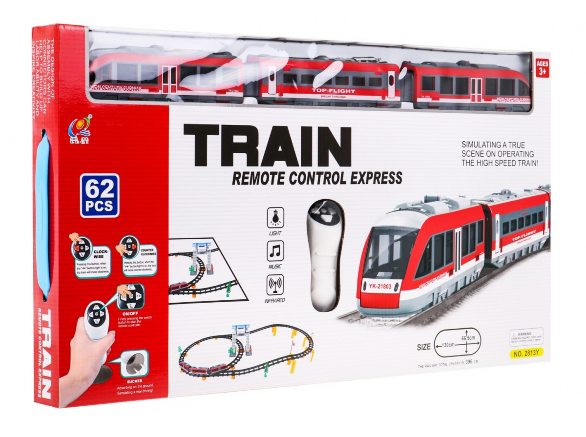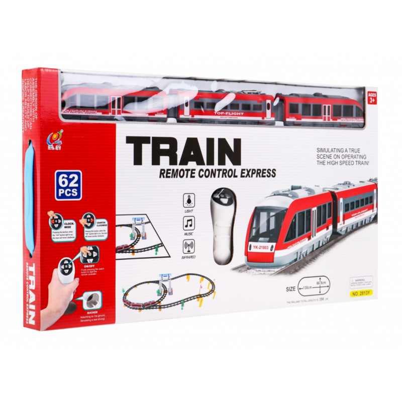 | | Velká vlaková souprava s kolejemi je vhodná pro děti od 3 let. Sada se skládá z 62 prvků, délka dráhy je až 396 cm. Vlak se ovládá dálkovým ovladačem a pohybuje se po směru nebo proti směru hodinových ručiček. Během jízdy se ozývají zvuky - zvuky jízdy - a svítí přední nebo zadní světla - podle směru jízdy. Hračka je napájena bateriemi AA - 2 x 1,5 V (dálkové ovládání) a 3 x 1,5 V (vláček). |