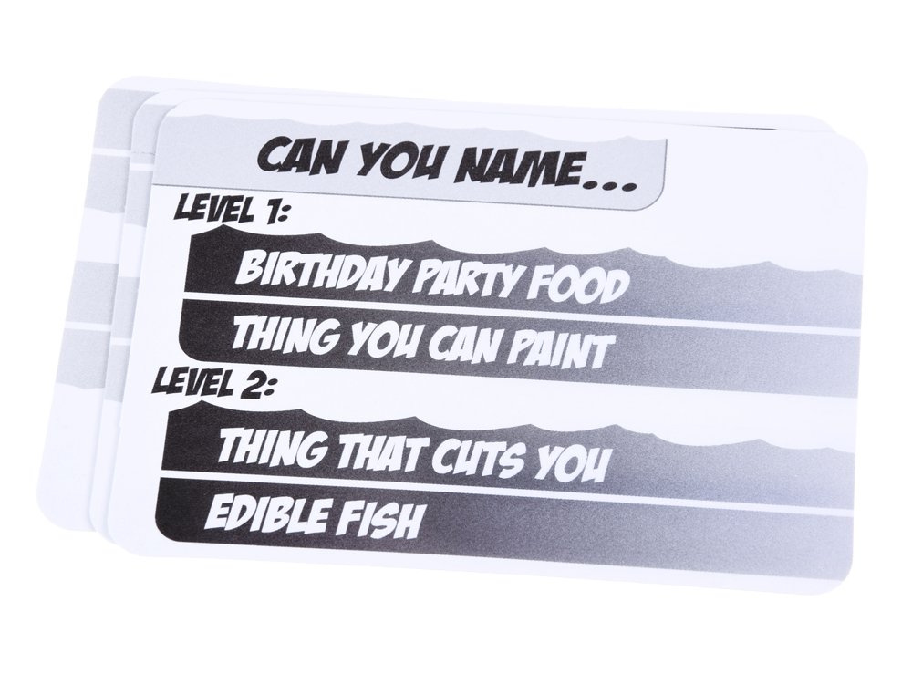 Karty vytáhneme doprostřed, aby k nim měl každý volný přístup. První hráč si vezme jednu kartu, přečte otázku a odpoví na ni, poté předá míček dál. Můžete použít připravené otázky nebo si vymyslet vlastní. Np. "Něco, co nosíte na obličeji nebo na hlavě". Správné odpovědi jsou m.in. brýle, čepice, knír atd.