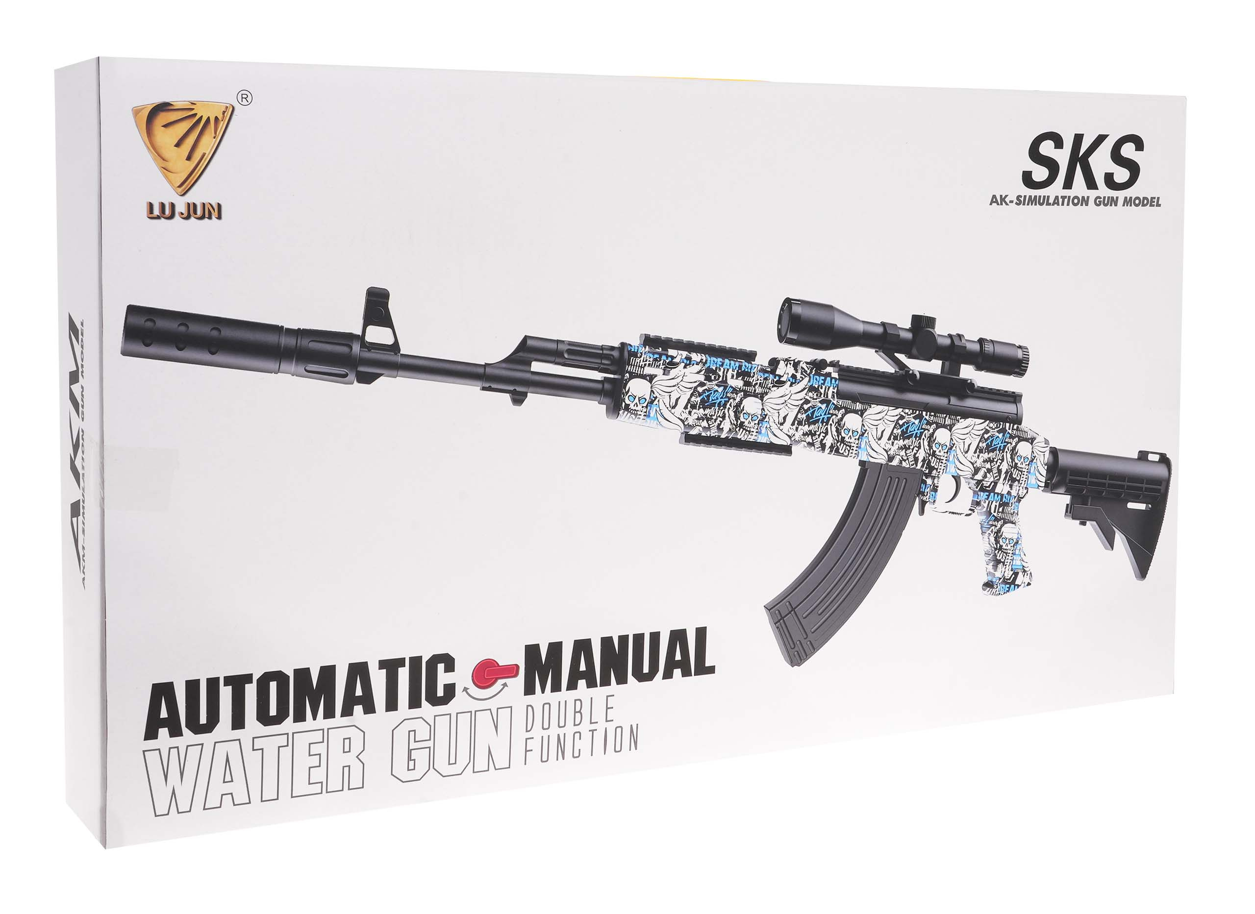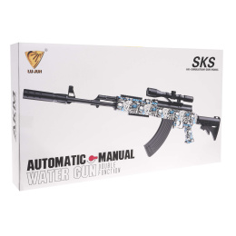 Velká vojenská puška s gelovými kuličkami je určena pro děti od 14 let. Měla by se používat se speciálním hydrogelem ve formě kuliček, které při zásahu cíle prasknou. Pro tento model použijte kuličky o průměru 7-8 mm. Kuličky se připraví tak, že se zalijí vodou a nechají stát asi 4-6 hodin, pak se přebytečná voda slije a máte hotové náboje. Sada je dodávána se sáčkem kuliček, které vyžadují přípravu.