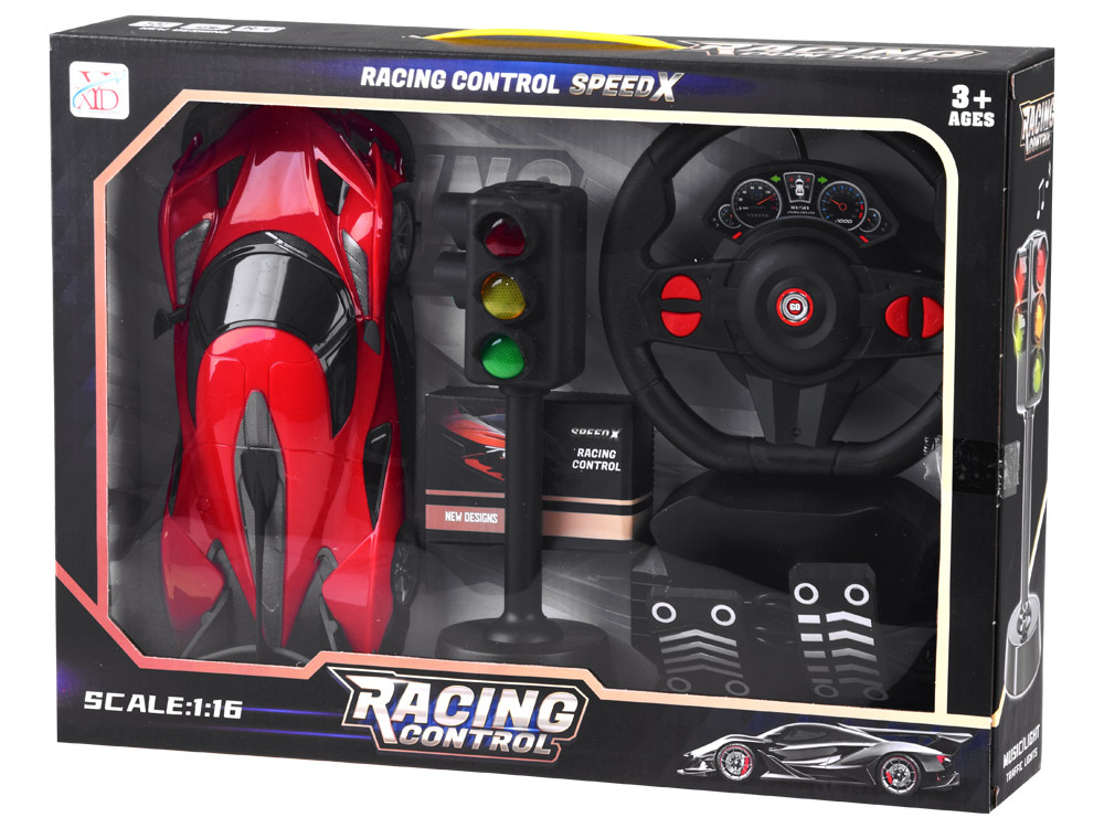 Dálkově ovládané sportovní auto s volantem a pedály vám poskytne hodiny neuvěřitelné zábavy. Vůz s futuristickou, uhlazenou siluetou jistě potěší každého fanouška čtyř kol. Jako pravý sportovní vůz má nízké zavěšení, spoiler a osvětlení (vpředu). Řidič má pomocí dálkového ovládání ve tvaru volantu plnou kontrolu nad vozidlem. Dálkové ovládání v podobě volantu má velmi intuitivní ovládání a pohodlně padne do ruky. Jízdu vozu lze ovládat také pedály připevněnými k volantu, které slouží k jízdě vpřed a vzad. Celou sadu doplňují semafory, které dělají zábavu ještě zajímavější.
