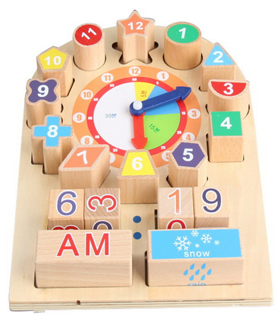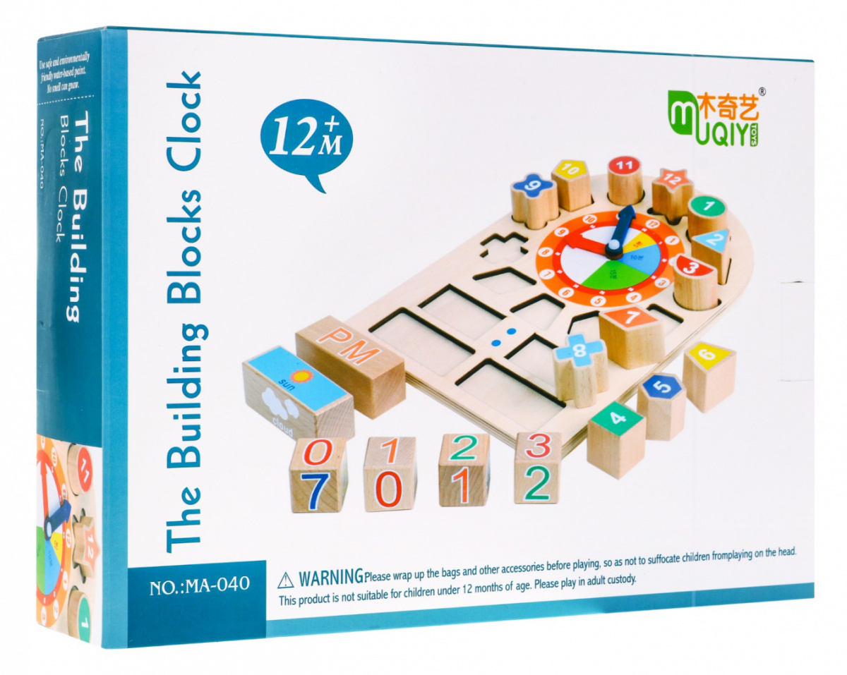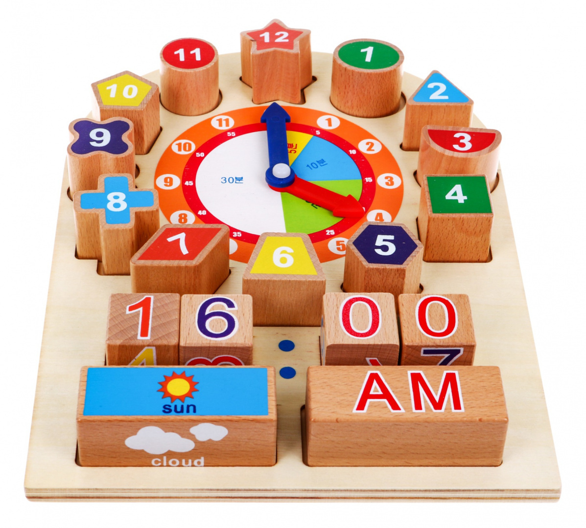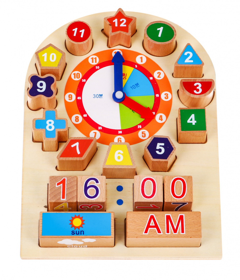 Dřevěné hodiny jsou hračka, která pomůže vašemu dítěti naučit se hodiny, denní časy, počasí a měsíce snadným a zábavným způsobem. Hodiny mají dvě pohyblivé ručičky, které lze libovolně nastavit a odečítat nastavený čas. Díky kostkám s čísly se navíc dítě pokusí rovnou zaznamenat čas. Dokáže určit, jaká je právě denní doba, zda je před polednem nebo po poledni, a určit, zda je slunečno, zataženo, prší nebo sněží. Očíslované cihly mají různé tvary a je třeba je vhodně umístit do prohlubní na desce. Na blocích jsou čísla od 1 do 12, která symbolizují polohy roku.