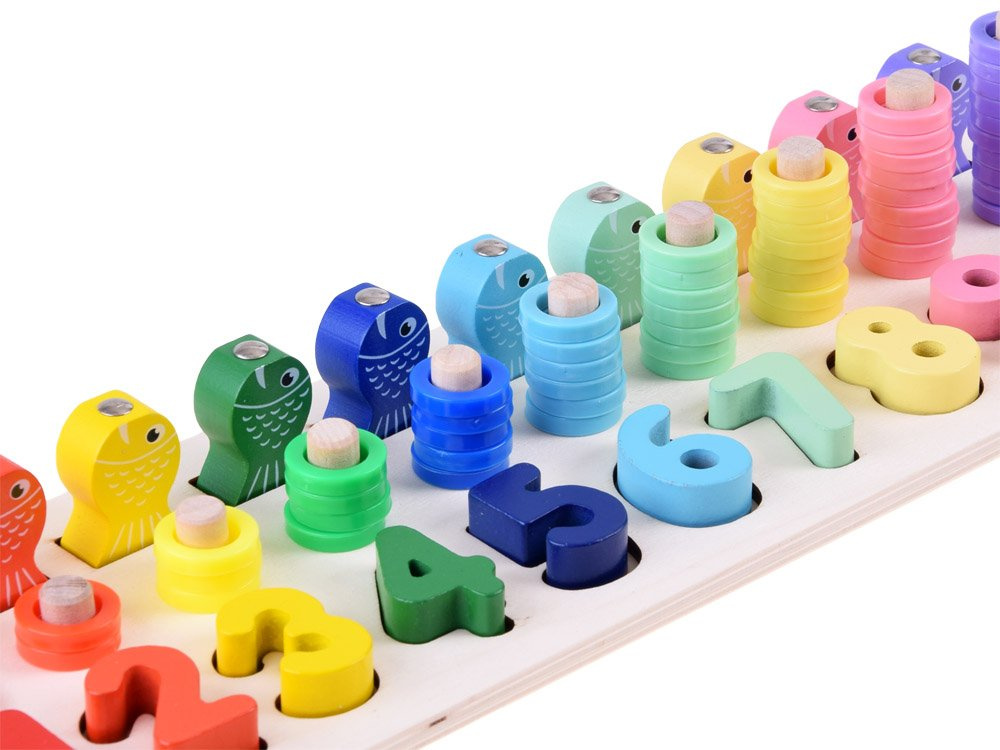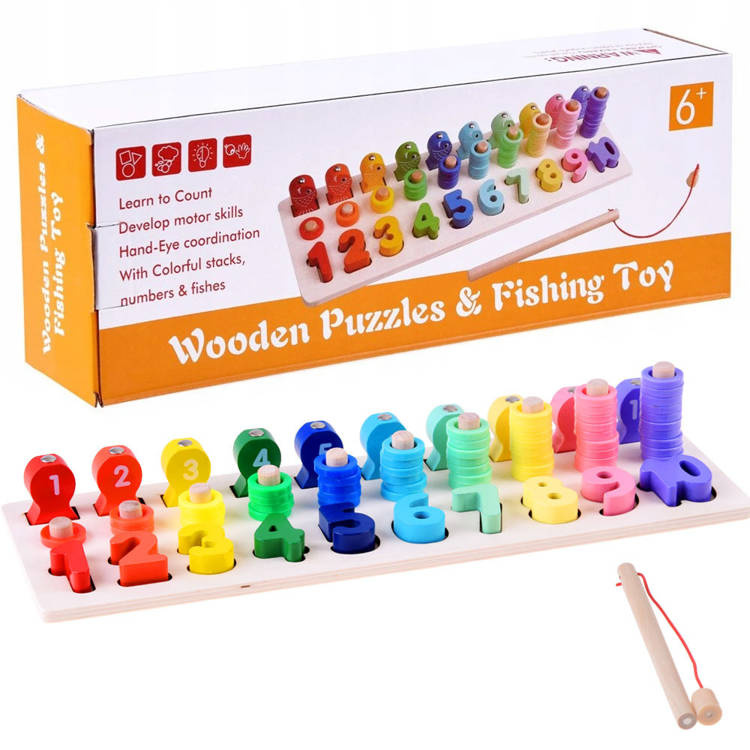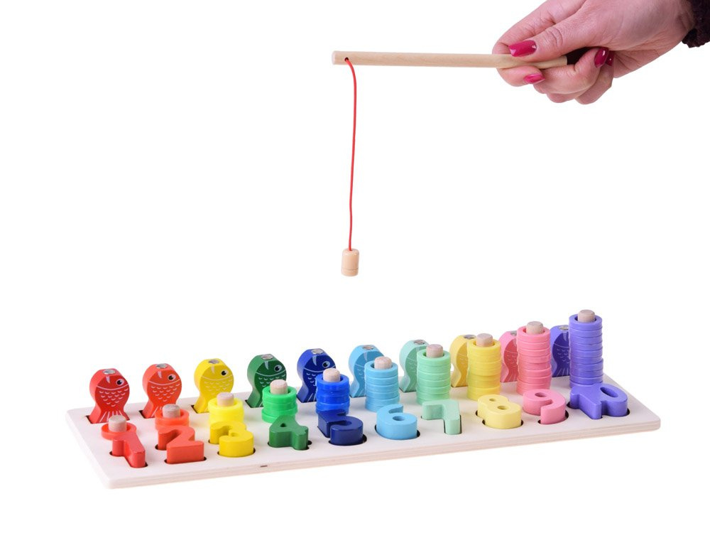2. chytání ryb - pomocí rybářského prutu s magnetem umístěte očíslované ryby na příslušná místa. Dítě si osvojuje schopnost přiřazovat detaily (ryba s číslem 6 uspořádaná vedle čísla 6 atd.) a dítě se učí přiřazovat detaily (ryba s číslem 6 uspořádaná vedle čísla 6 atd.).). Kromě toho procvičuje koordinaci očí a rukou.