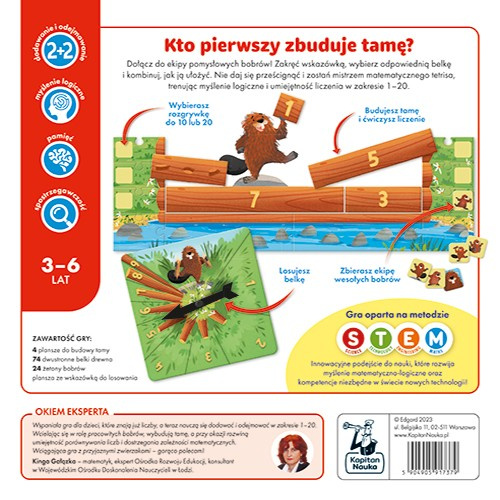 Hráči mají na výběr ze dvou typů hry - mohou počítat do 10 nebo do 20. Pomocí tabule s nápovědou nakreslí dřevěný trám a vymyslí, jak ho co nejrychleji uspořádat, aby vznikla hráz. Pomocí speciálních žetonů se mohou rozhodnout, jakou délku trámu potřebují, a zároveň si procvičit sčítání a odčítání. Vyhrává ten, kdo prokáže reflexy, chytrost, počítání a logické myšlení.
