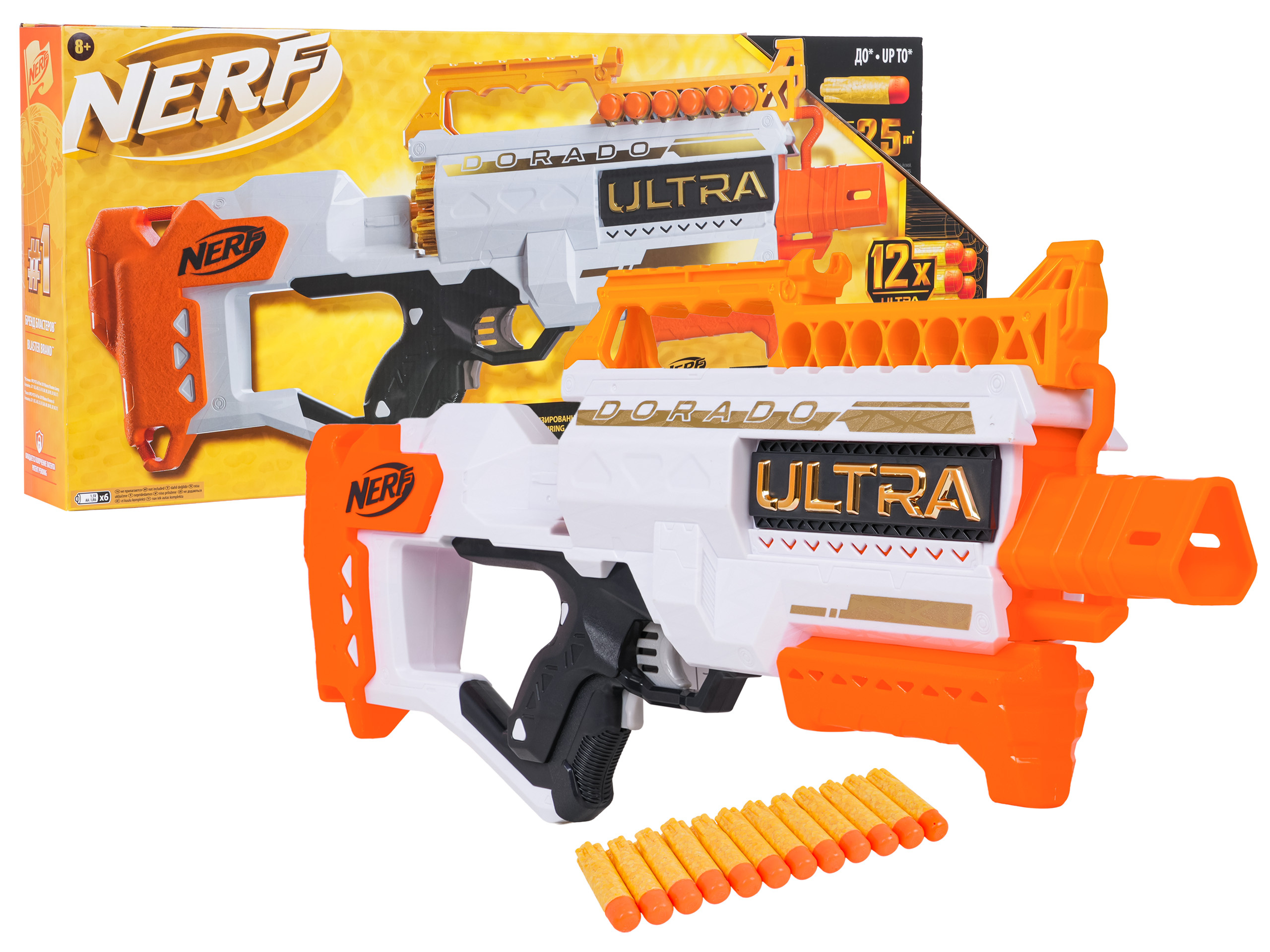 | Poloautomatická pistole NERF Ultra DORADO se šipkami pro děti od osmi let. Pistole je napájena bateriemi typu 6 x AA 1,5V (nejsou součástí balení). Má otevřený šipkový buben, který pojme 6 pěnových nábojů. Je nutné nabít buben šipkami, podržet tlačítko zrychlení a stisknout spoušť. Střely dokážou letět na vzdálenost 25 metrů. Mají speciální inovativní tvar, zvýšila se jejich přesnost a dosah. Jsou zakončeny gumou, což zvyšuje bezpečnost střelby. Pistole má speciální okénko pro odstranění zaseknutých šipek.