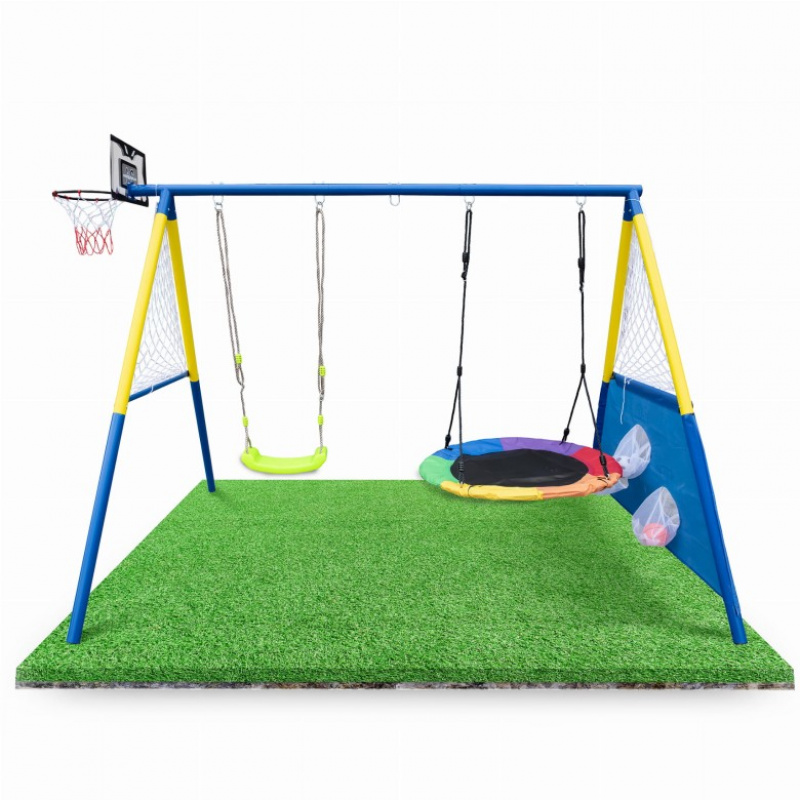 Dvojitá dětská houpačka je ideálním doplňkem zahradního hřiště. Sada je vybavena klasickou dětskou houpačkou a čapím hnízdem a promyšlená kovová konstrukce zajišťuje robustnost a odolnost.
