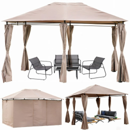Odolná ocelová konstrukce – zajišťuje stabilitu a odolnost při používání po celou sezónu. Voděodolná tkanina střechy 160 g/m² – účinně chrání před sluncem a přeháňkami. Boční závěsy z tkaniny 140 g/m² – funkční stěny, které můžete snadno zatáhnout nebo srolovat. Stylová, béžová barva – hodí se k většině zahradních a terasových aranžmá. Univerzální použití – ideální na pozemek, do zahrady, na terasu, a dokonce i na venkovní akce.
