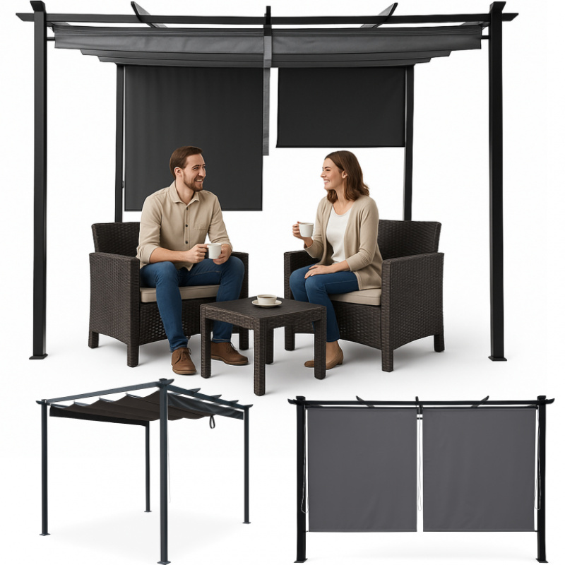 Pergola je vybavena 4 bočními markýzami, které můžete libovolně rozvinout, což zajišťuje: ochranu před sluncem, ochranu před větrem, soukromí. Odolná ocelová konstrukce Nohy: ocelové trubky s profilem 60x60 mm – stabilní a odolné vůči zatížení. Střecha: trámy 20x40 mm – až 5 střešních trámů, pro větší odolnost a lepší napnutí tkaniny. Voděodolná střecha – polyester 180 g/m² Střecha vyrobená z voděodolného polyesterového materiálu – chrání před deštěm a sluncem. Snadno čistitelný, odolný proti blednutí. Snadná montáž Sada obsahuje všechny potřebné prvky a návod k montáži – nepotřebujete žádné speciální nástroje. Ideální pro každou příležitost Hodí se na: víkendové grilování s rodinou, setkání s přáteli, jako zastřešení vířivky nebo zahradního nábytku.
