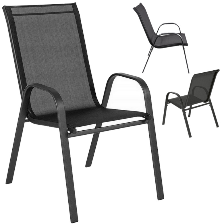 Zahradní židle FIESTA (1 ks)) Pohodlné zahradní židle, které se skvěle hodí na zahradu, pozemek nebo terasu. Potah židle je vyroben z husté pletené textilie napnuté na rámu. Jejich zpracování je zárukou dlouholetého používání a jejich svařovaná, nepoškrábaná, práškově lakovaná konstrukce. Židle se dodávají v samostatně sestavitelných kusech - je možné je stohovat (skládat jednu přes druhou).