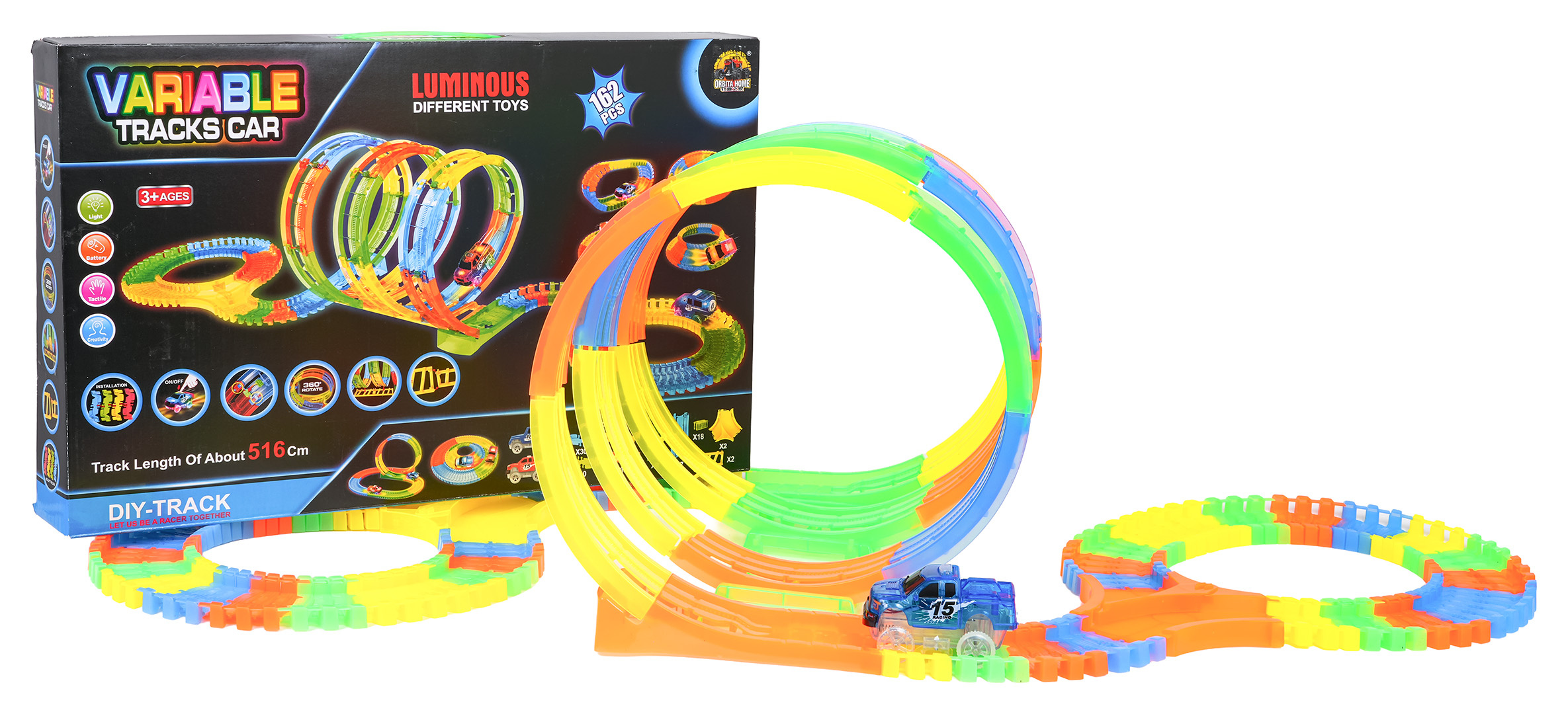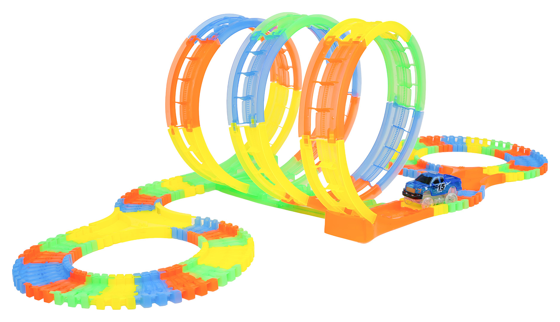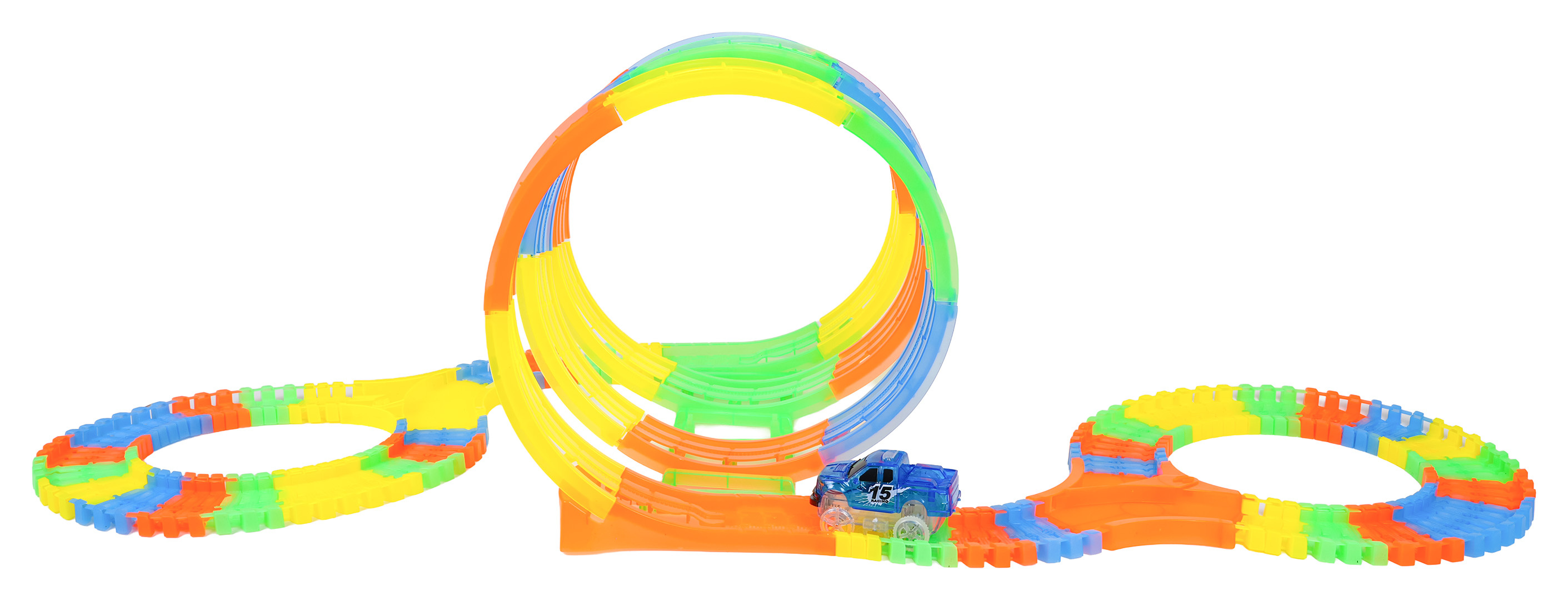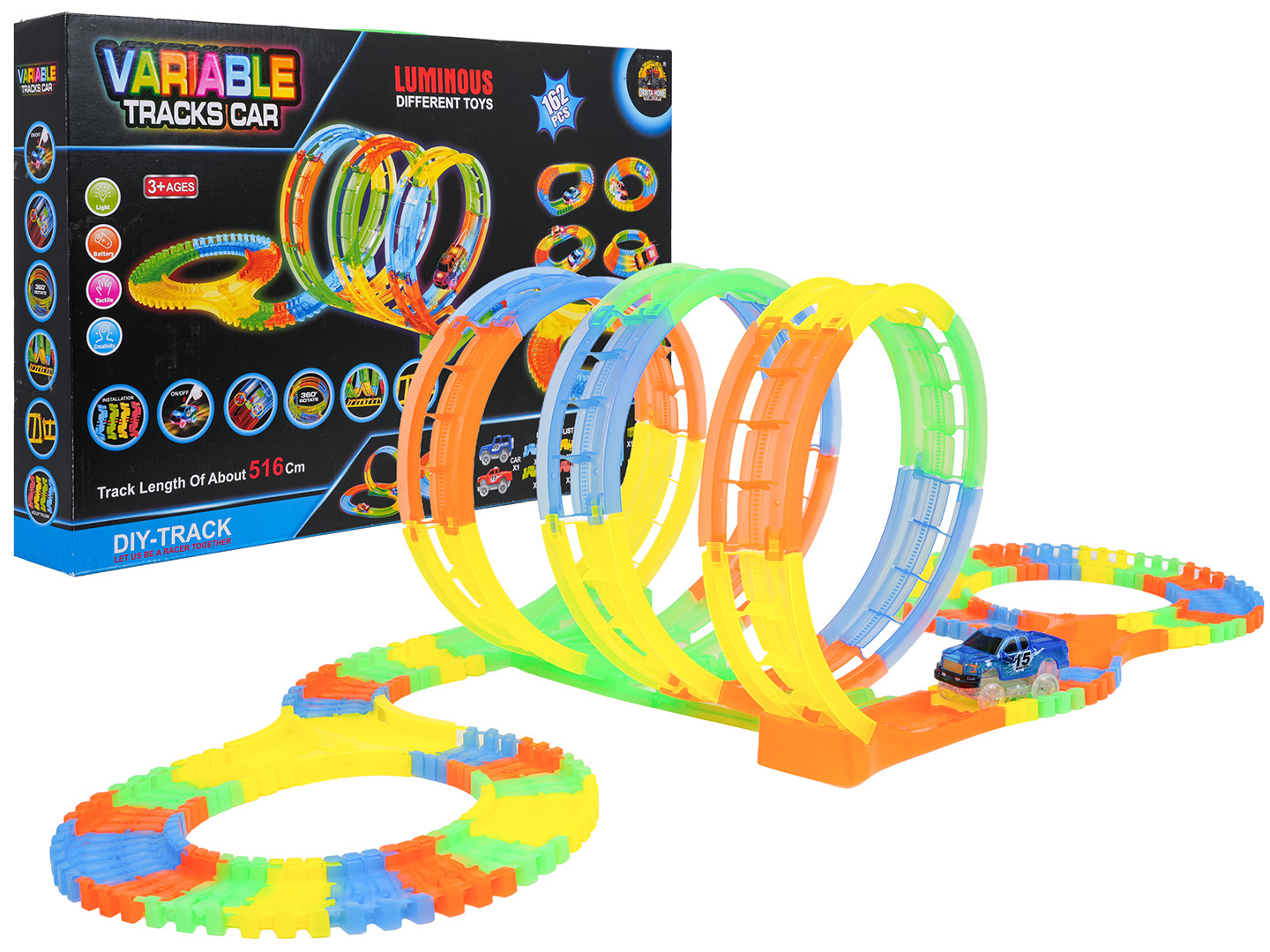 Svítící závodní dráha ve tmě se smyčkami a autíčkem v sadě je určena pro děti již od tří let. Koleje jsou flexibilní, lze je skládat do libovolných kombinací, otáčet, zvedat, přemisťovat a to během jízdy autíčka. Navíc jsou koleje fluorescenční, svítí ve tmě. Vozidlo připojené k sadě má LED osvětlení, při jízdě ve tmě vytváří úžasný efekt. Vozidlo je napájeno bateriemi 2 x AA 1,5V (nejsou součástí balení). K zahájení jízdy autíčka stačí stisknout tlačítko na jeho střeše.