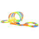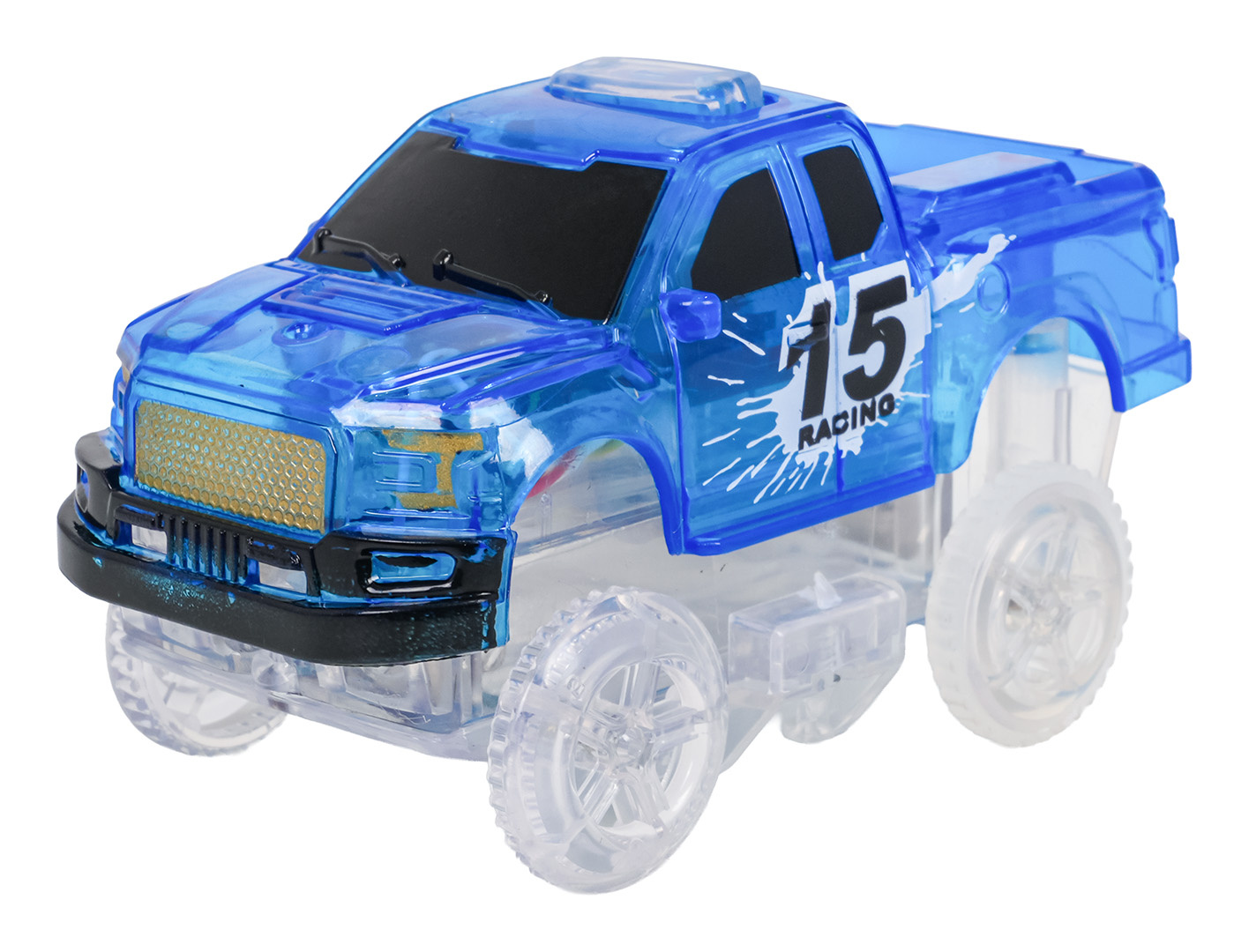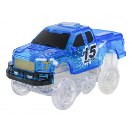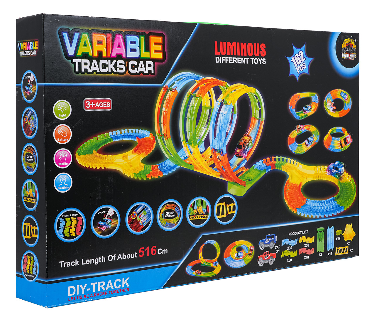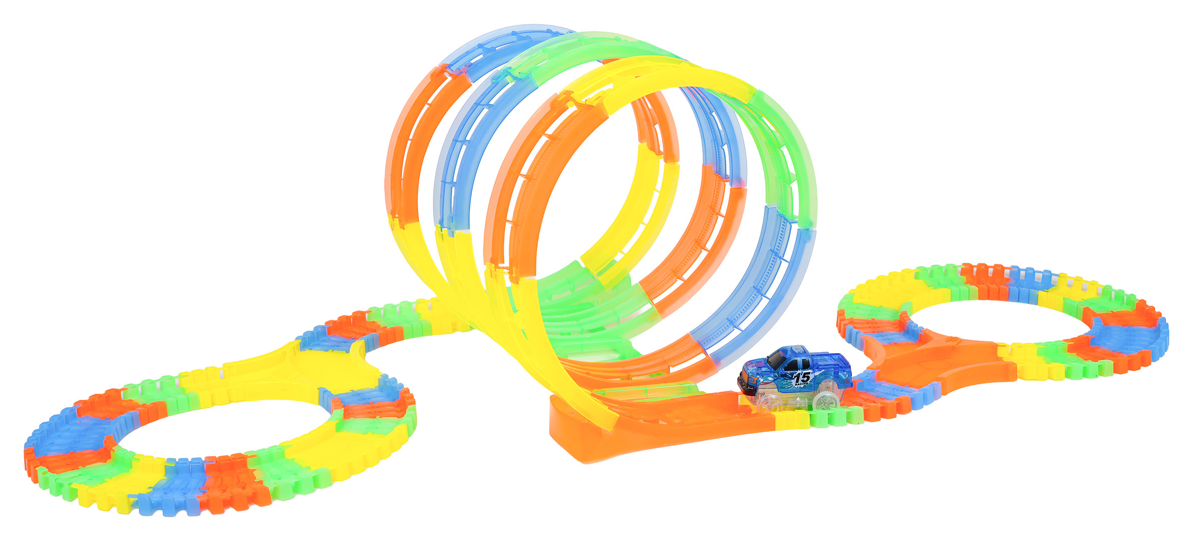 Svítící závodní dráha ve tmě se smyčkami a autíčkem v sadě je určena pro děti již od tří let. Koleje jsou flexibilní, lze je skládat do libovolných kombinací, otáčet, zvedat, přemisťovat a to během jízdy autíčka. Navíc jsou koleje fluorescenční, svítí ve tmě. Vozidlo připojené k sadě má LED osvětlení, při jízdě ve tmě vytváří úžasný efekt. Vozidlo je napájeno bateriemi 2 x AA 1,5V (nejsou součástí balení). K zahájení jízdy autíčka stačí stisknout tlačítko na jeho střeše.