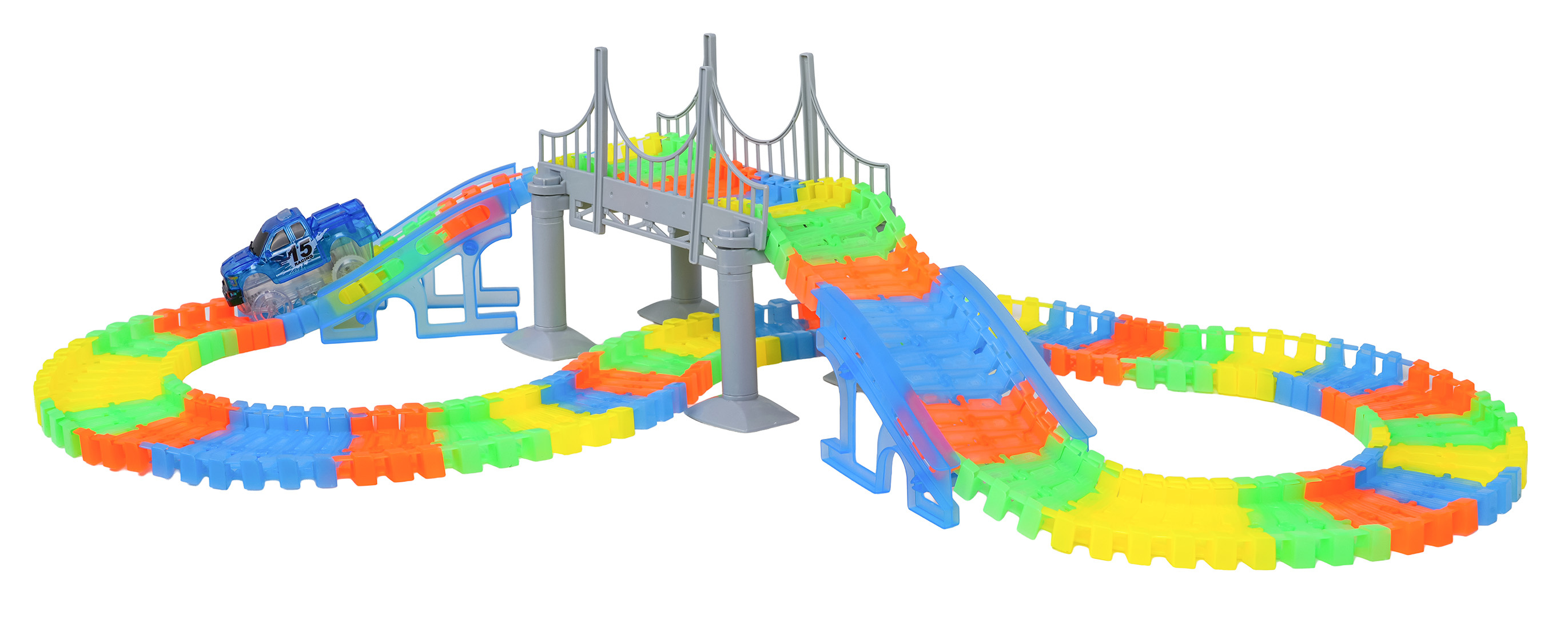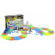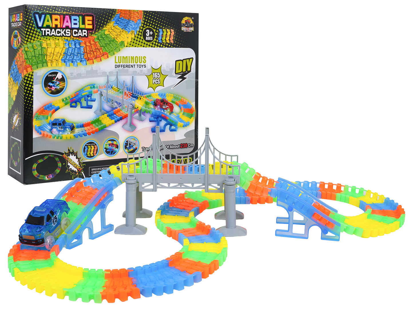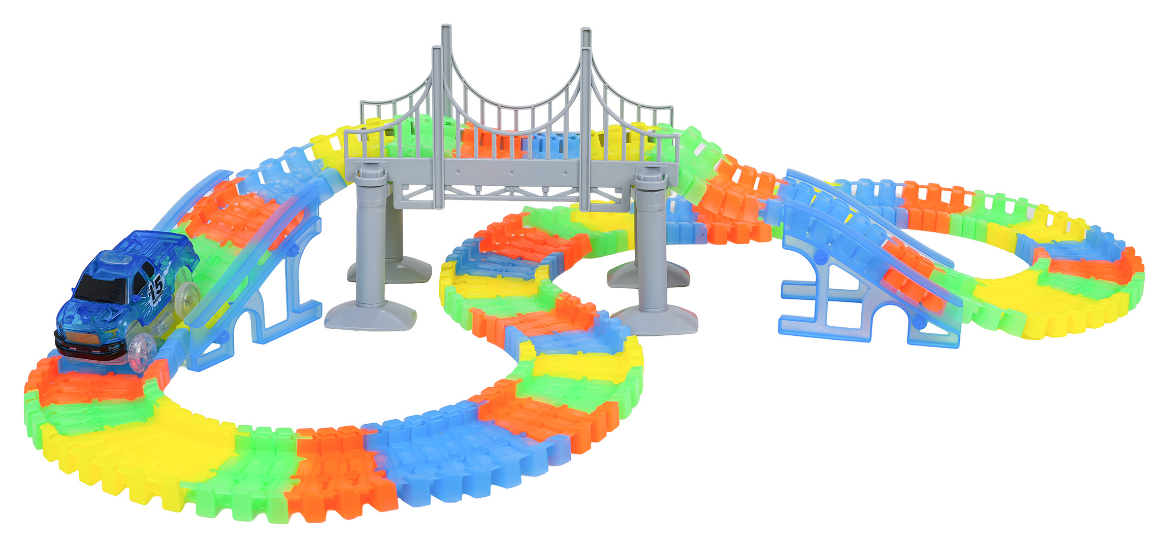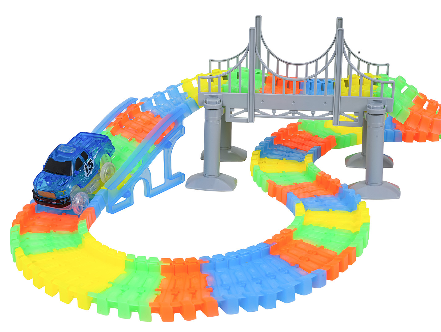 Svítící závodní dráha ve tmě s autíčkem v sadě je nabídkou pro děti již od tří let. Koleje jsou flexibilní, lze je skládat do libovolných kombinací, otáčet, zvedat, přemisťovat a to během jízdy autíčka. Navíc jsou koleje fluorescenční, svítí ve tmě. Vozidlo připojené k sadě má LED osvětlení, při jízdě ve tmě vytváří úžasný efekt. Vozidlo je napájeno bateriemi 2 x AA 1,5V (nejsou součástí balení). K zahájení jízdy autíčka stačí stisknout tlačítko na jeho střeše.