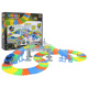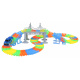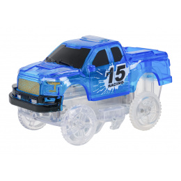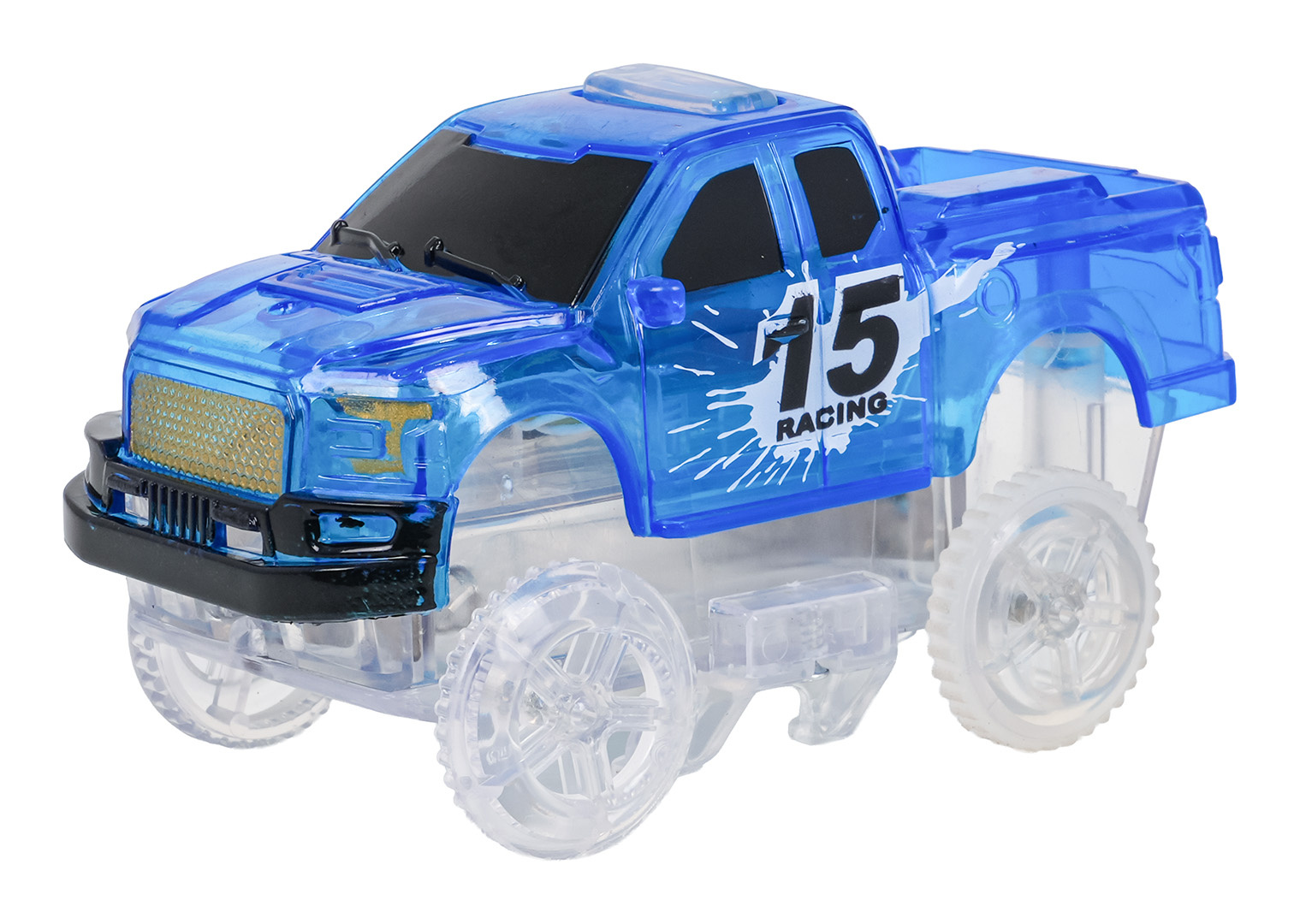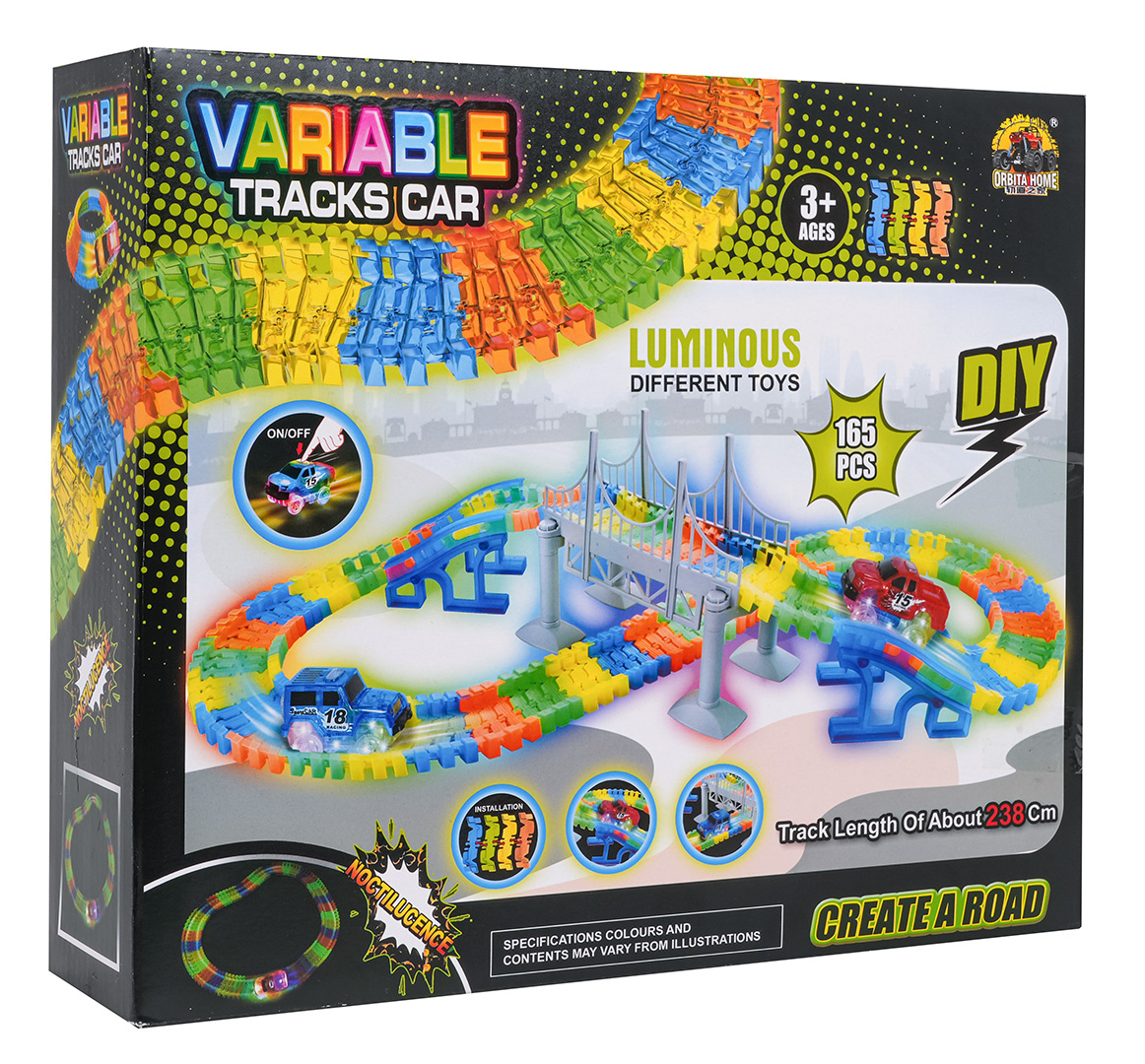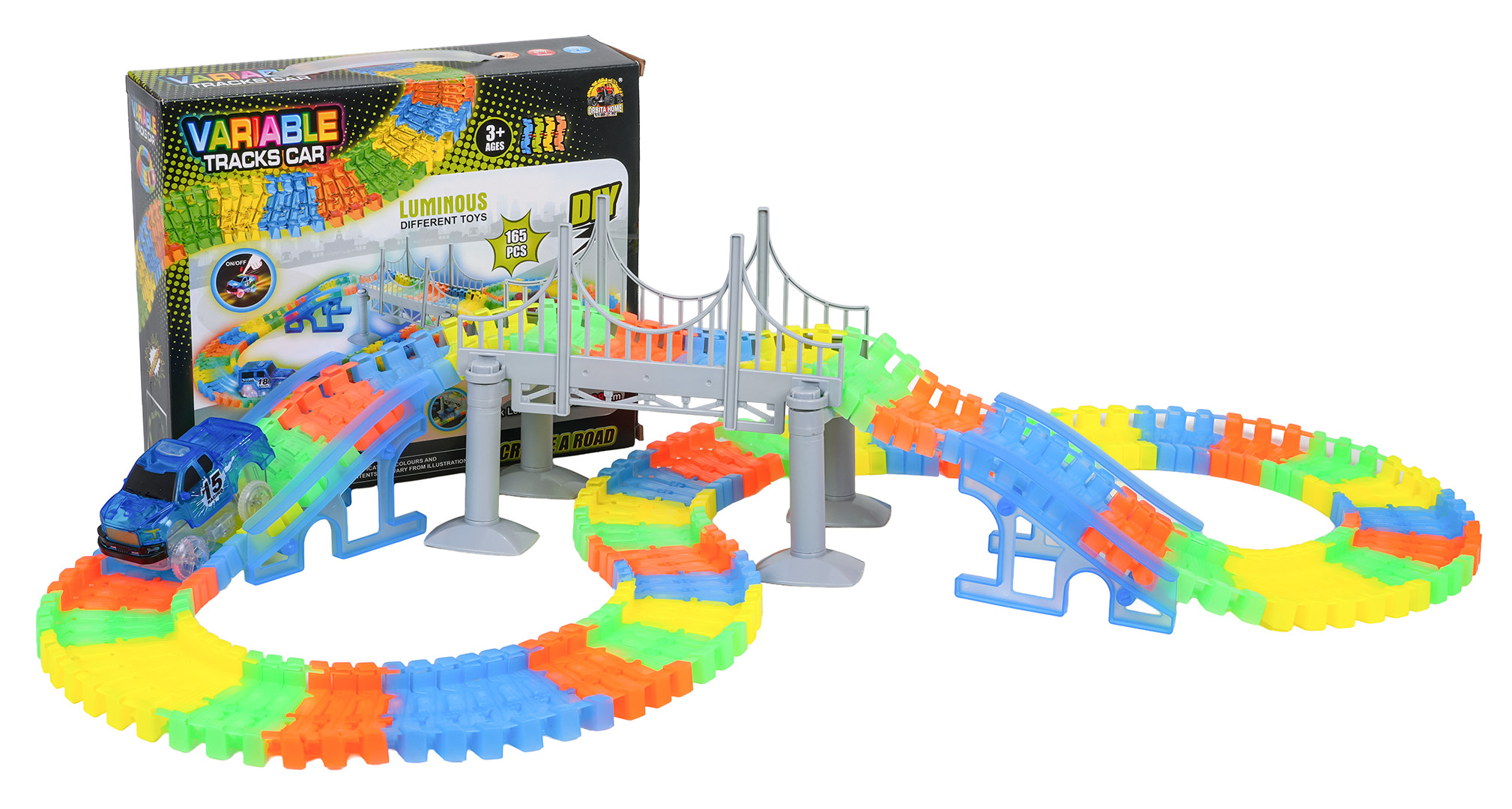 Svítící závodní dráha ve tmě s autíčkem v sadě je nabídkou pro děti již od tří let. Koleje jsou flexibilní, lze je skládat do libovolných kombinací, otáčet, zvedat, přemisťovat a to během jízdy autíčka. Navíc jsou koleje fluorescenční, svítí ve tmě. Vozidlo připojené k sadě má LED osvětlení, při jízdě ve tmě vytváří úžasný efekt. Vozidlo je napájeno bateriemi 2 x AA 1,5V (nejsou součástí balení). K zahájení jízdy autíčka stačí stisknout tlačítko na jeho střeše.