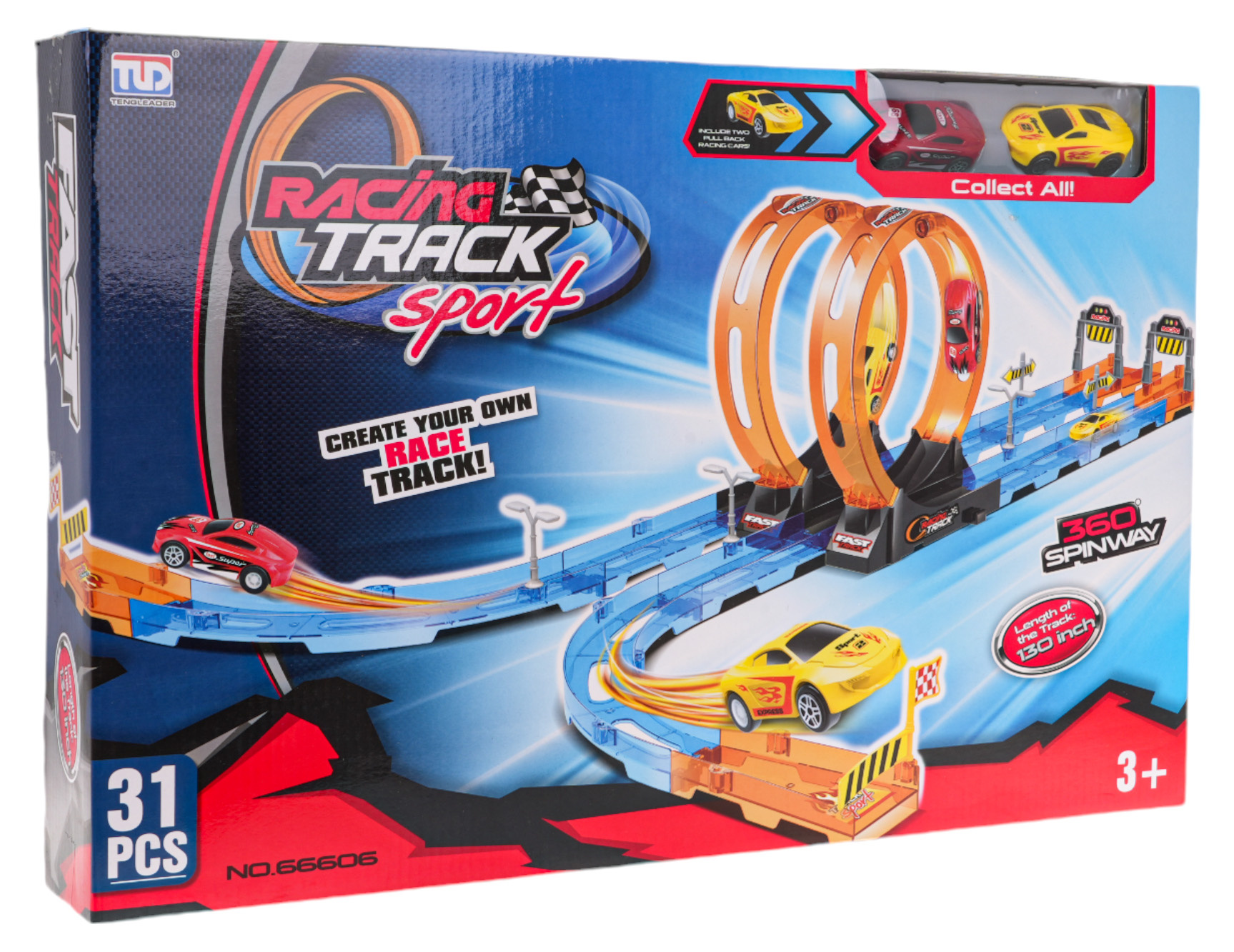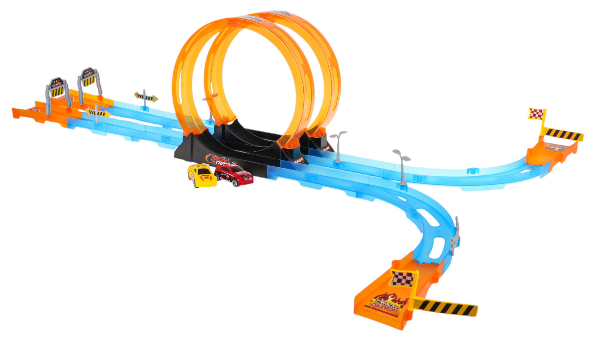 Sada se skládá ze dvou tratí s 360stupňovými smyčkami a rovnými úseky pro zrychlení autíček. Motor s natahováním dozadu umožňuje dynamickou jízdu bez nutnosti baterií – stačí autíčko mírně zatáhnout dozadu a projede se po celé trati na plný výkon. Barevné samolepky, které jsou součástí sady, umožňují dětem ozdobit si trať podle svých představ, což zážitek ještě více umocňuje.