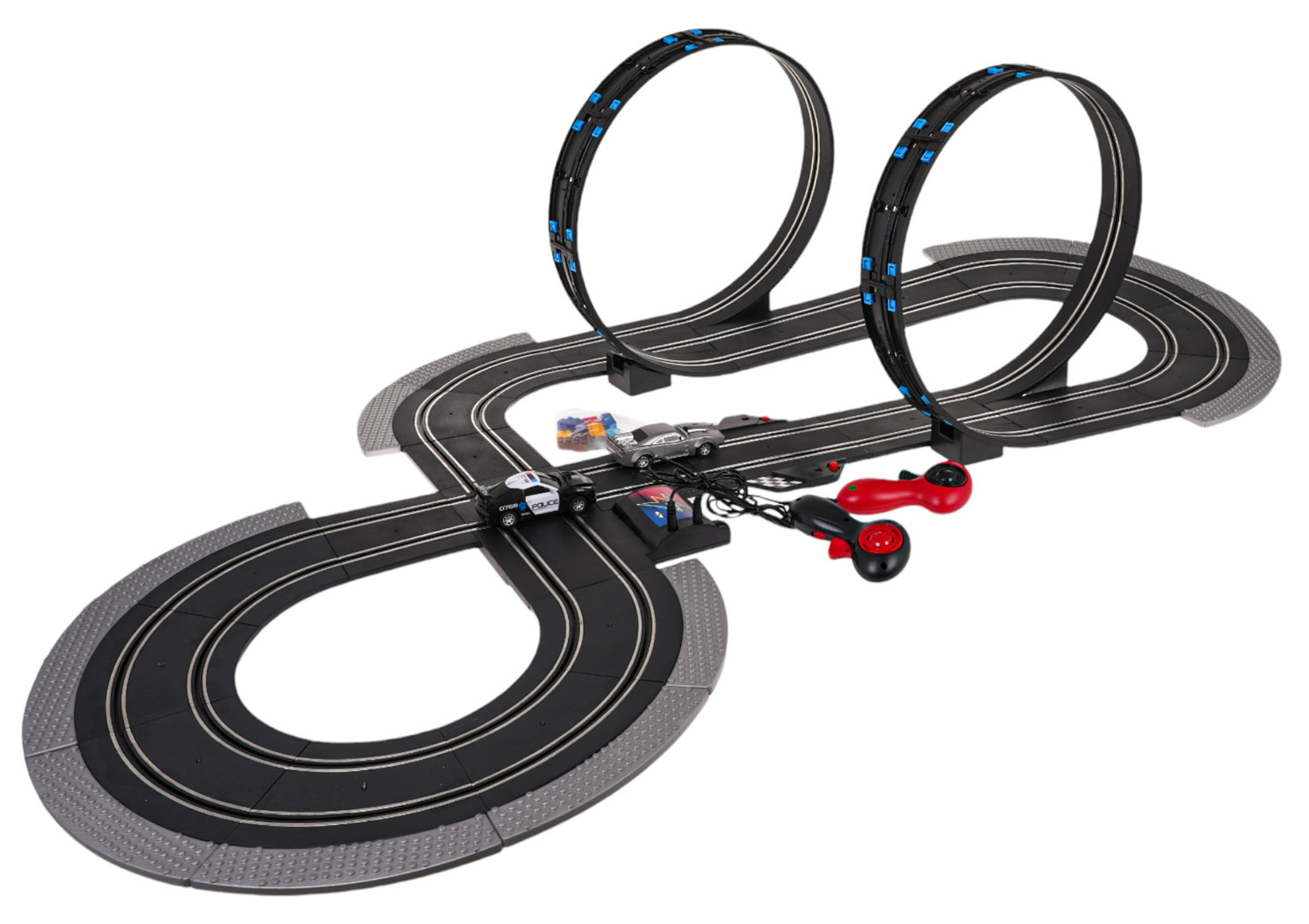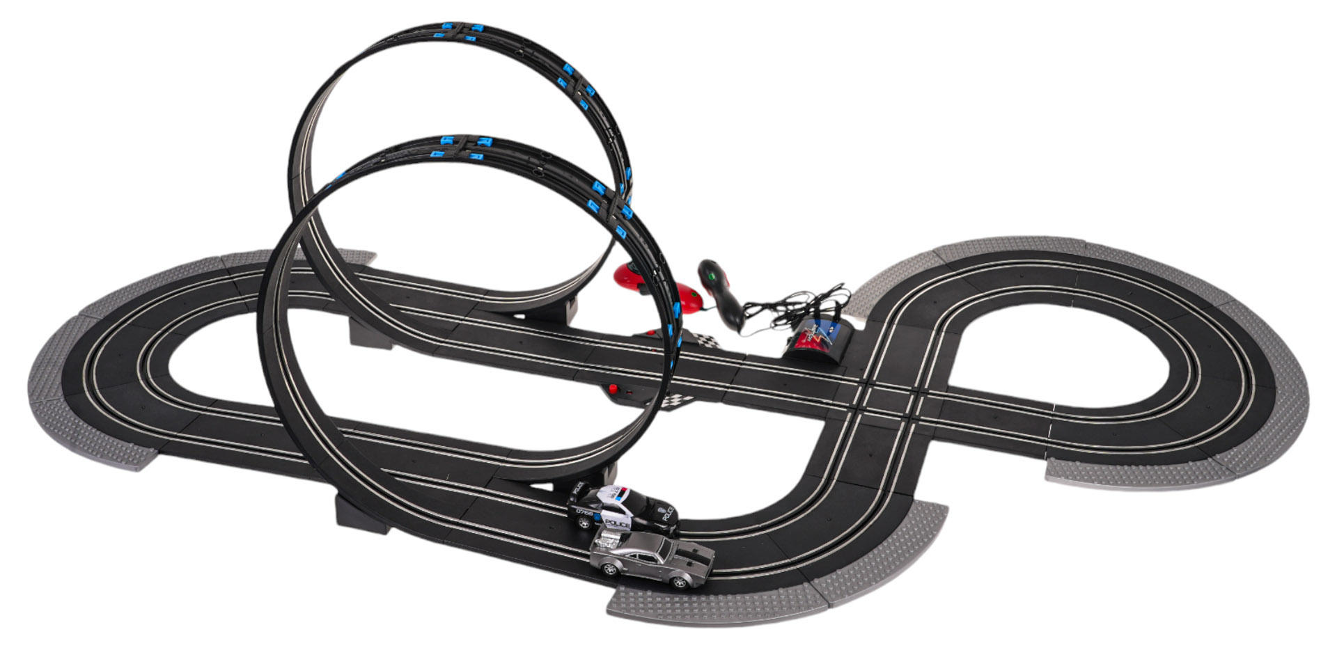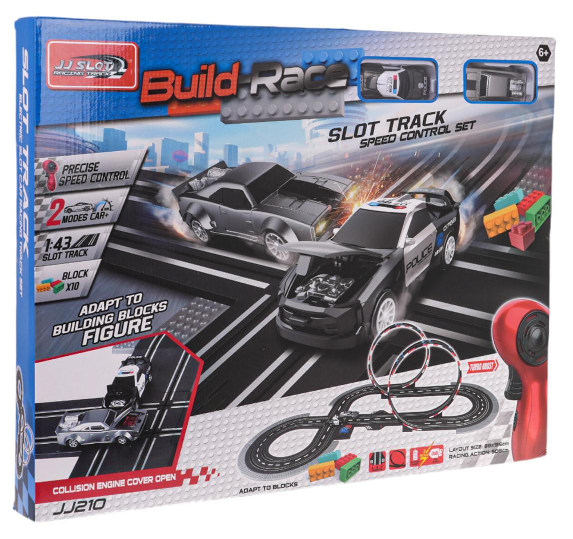 Jednotlivé konstrukční prvky umožní postavit dráhu s ostrými zatáčkami, spirálami a rovnými úseky, a to vše proto, aby maximálně zatraktivnily zábavu a přidaly celé hře emoce. V sadě se nacházejí dvě vozidla, včetně jednoho policejního. Auta mají otevíratelné kapoty. Sada ideální pro děti od 6 let. Hračka je napájena bateriemi typu 6 x AA 1,5 V (baterie nejsou součástí balení).