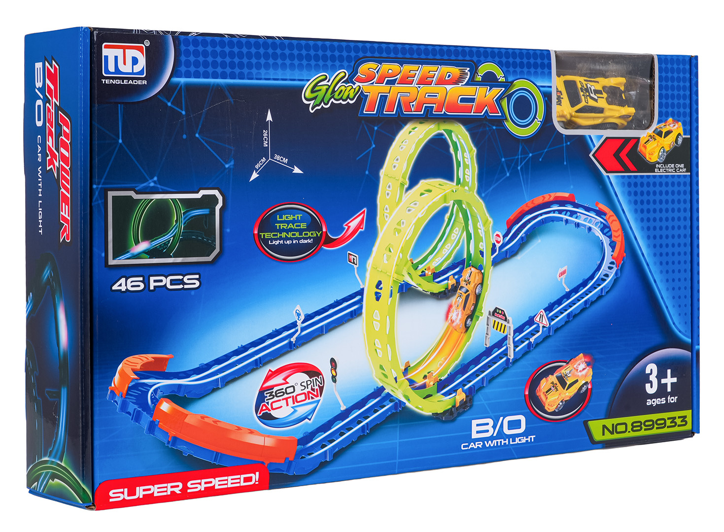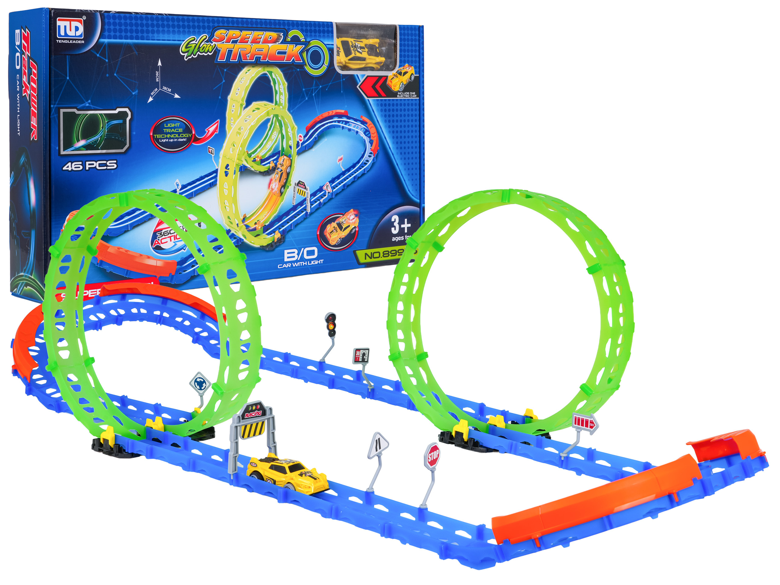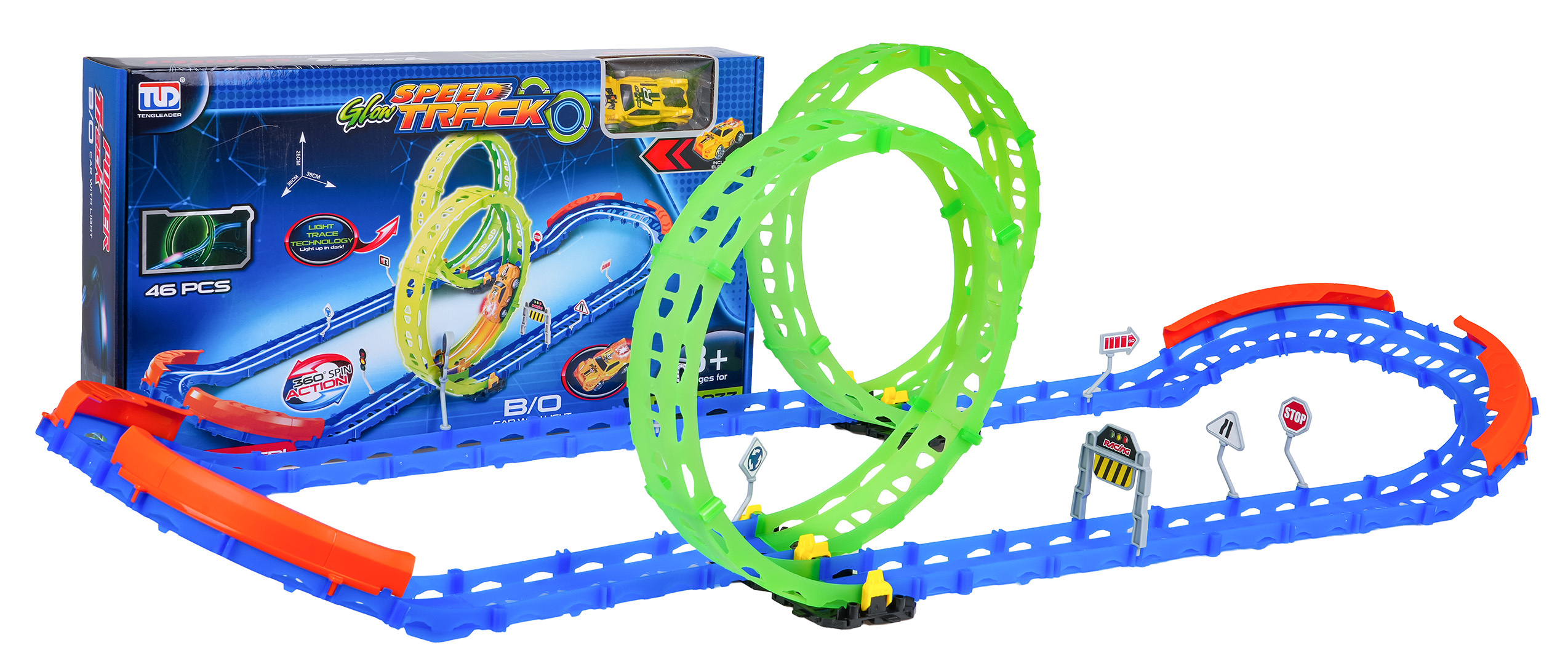 | Fluorescenční závodní dráha s ostrými zatáčkami, smyčkami a rychlým autíčkem je určena pro děti od tří let. Sada se skládá ze 46 prvků pro vlastní montáž. Na trati se nacházejí rovné úseky, ostré zatáčky s bariérami zabraňujícími vypadnutí vozidla z trasy, a také dvě smyčky o 360 stupňů. Smyčky jsou fluorescenční, svítí ve tmě. Autíčko má také osvětlení v zadní části. Autíčko je napájeno bateriemi typu 2 x AAA 1,5 V, baterie nejsou součástí balení.