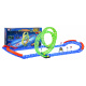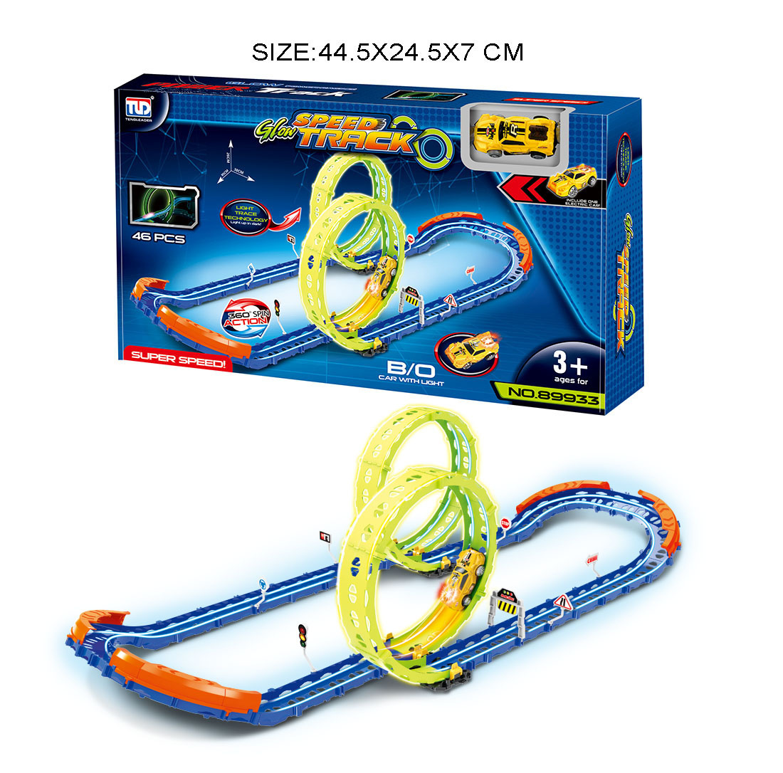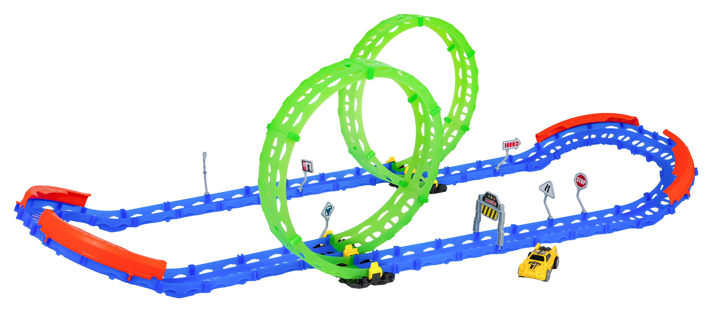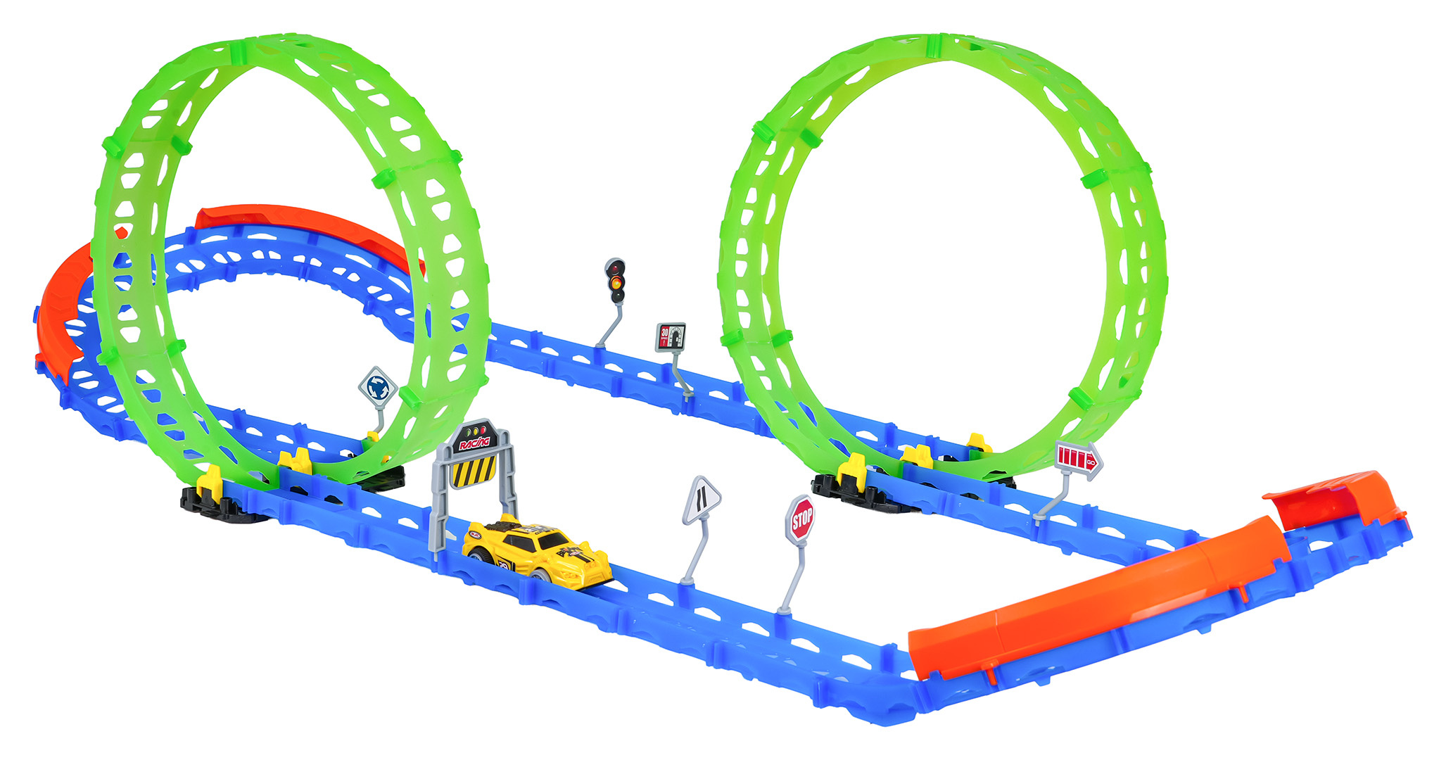 | Fluorescenční závodní dráha s ostrými zatáčkami, smyčkami a rychlým autíčkem je určena pro děti od tří let. Sada se skládá ze 46 prvků pro vlastní montáž. Na trati se nacházejí rovné úseky, ostré zatáčky s bariérami zabraňujícími vypadnutí vozidla z trasy, a také dvě smyčky o 360 stupňů. Smyčky jsou fluorescenční, svítí ve tmě. Autíčko má také osvětlení v zadní části. Autíčko je napájeno bateriemi typu 2 x AAA 1,5 V, baterie nejsou součástí balení.
