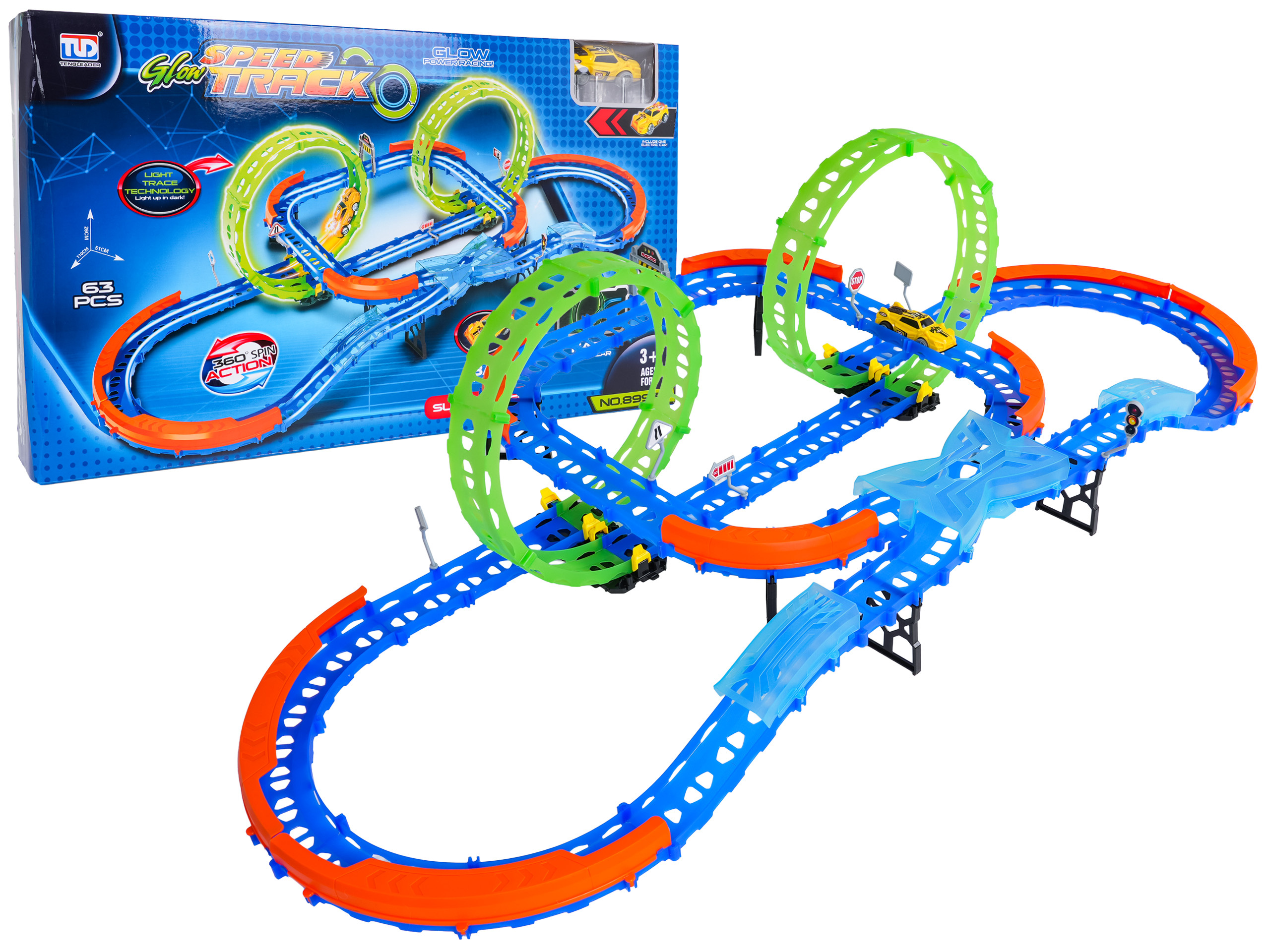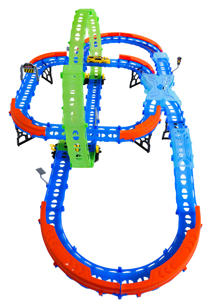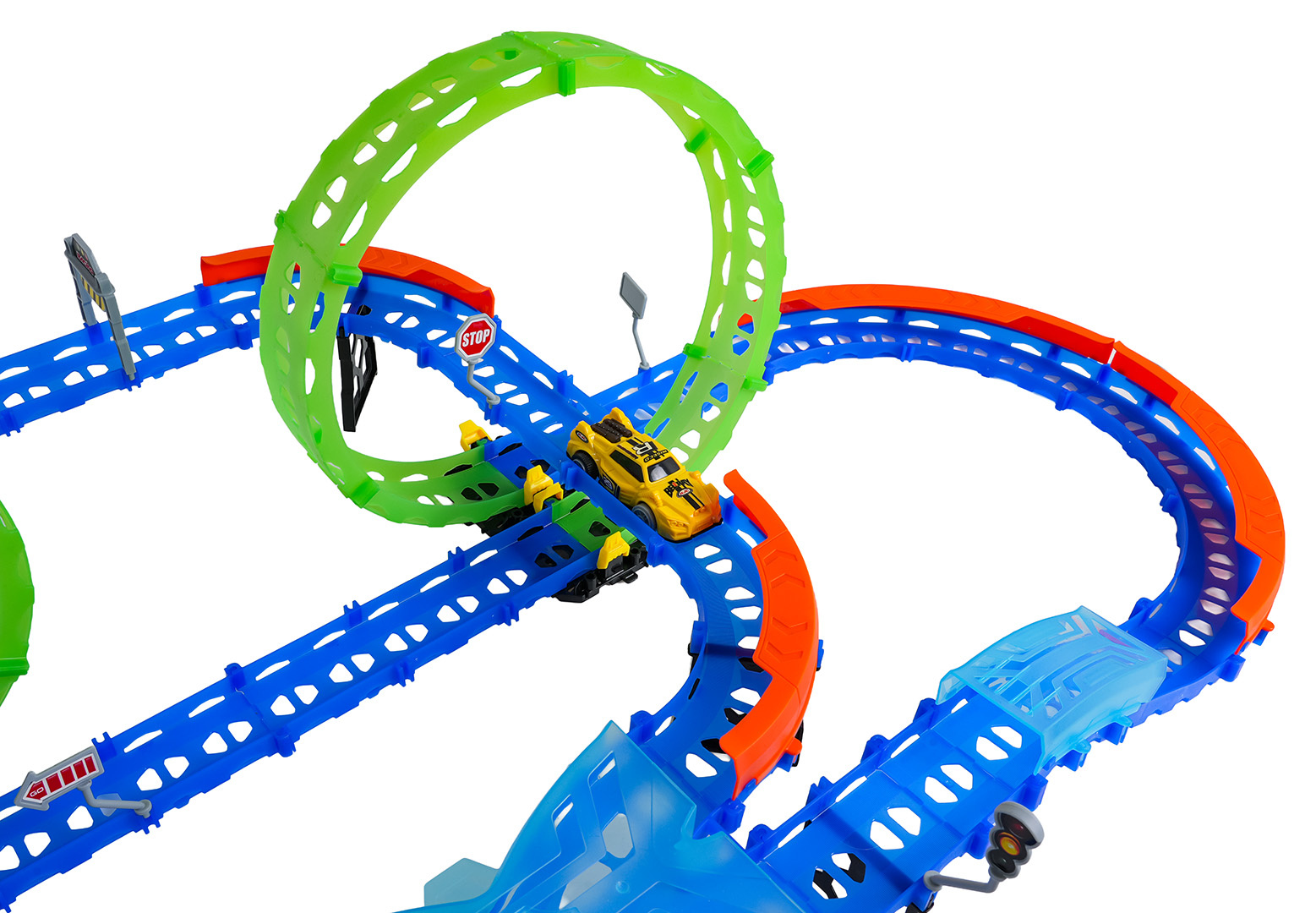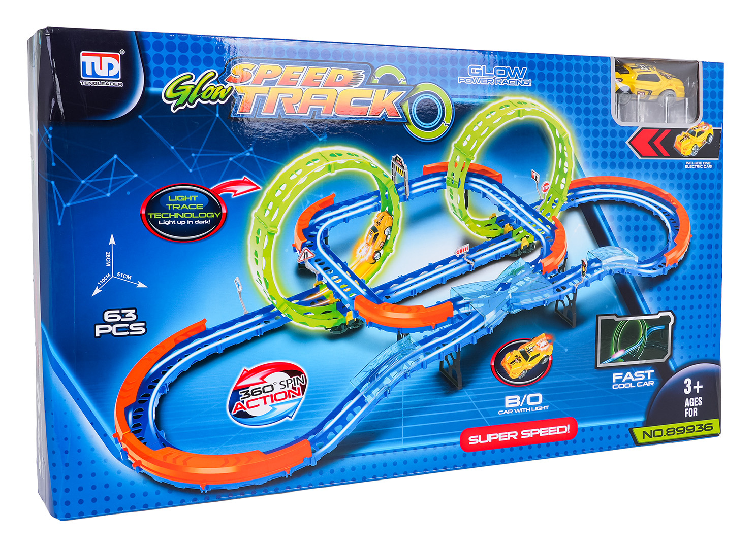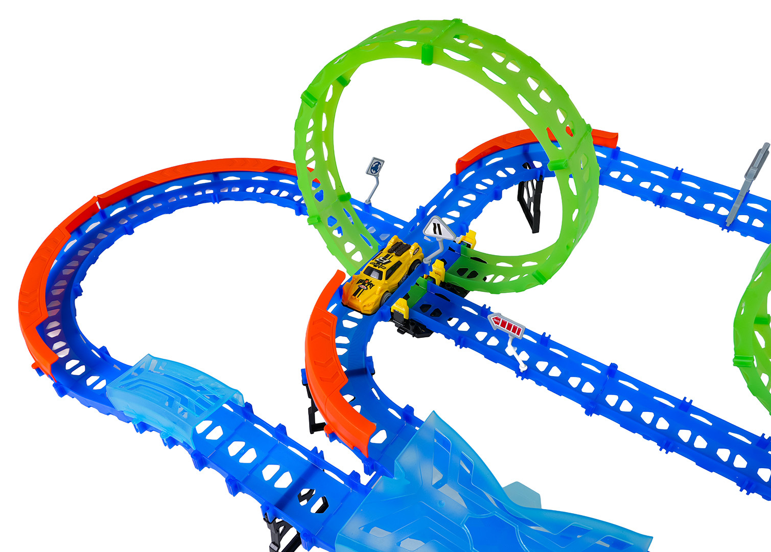 | Fluorescenční závodní dráha s ostrými zatáčkami, smyčkami a rychlým autíčkem je určena pro děti od tří let. Sada se skládá z 63 prvků pro vlastní montáž. Na trati se nacházejí rovné úseky, ostré zatáčky s bariérami zabraňujícími vypadnutí vozidla z trasy, a také dvě smyčky o 360 stupňů. Smyčky jsou fluorescenční, svítí ve tmě. Autíčko má také osvětlení v zadní části. Autíčko je napájeno bateriemi typu 2 x AAA 1,5 V, baterie nejsou součástí balení.