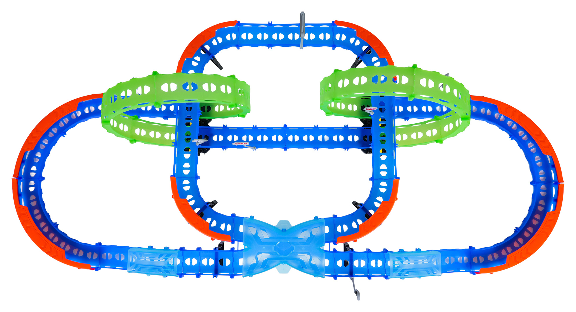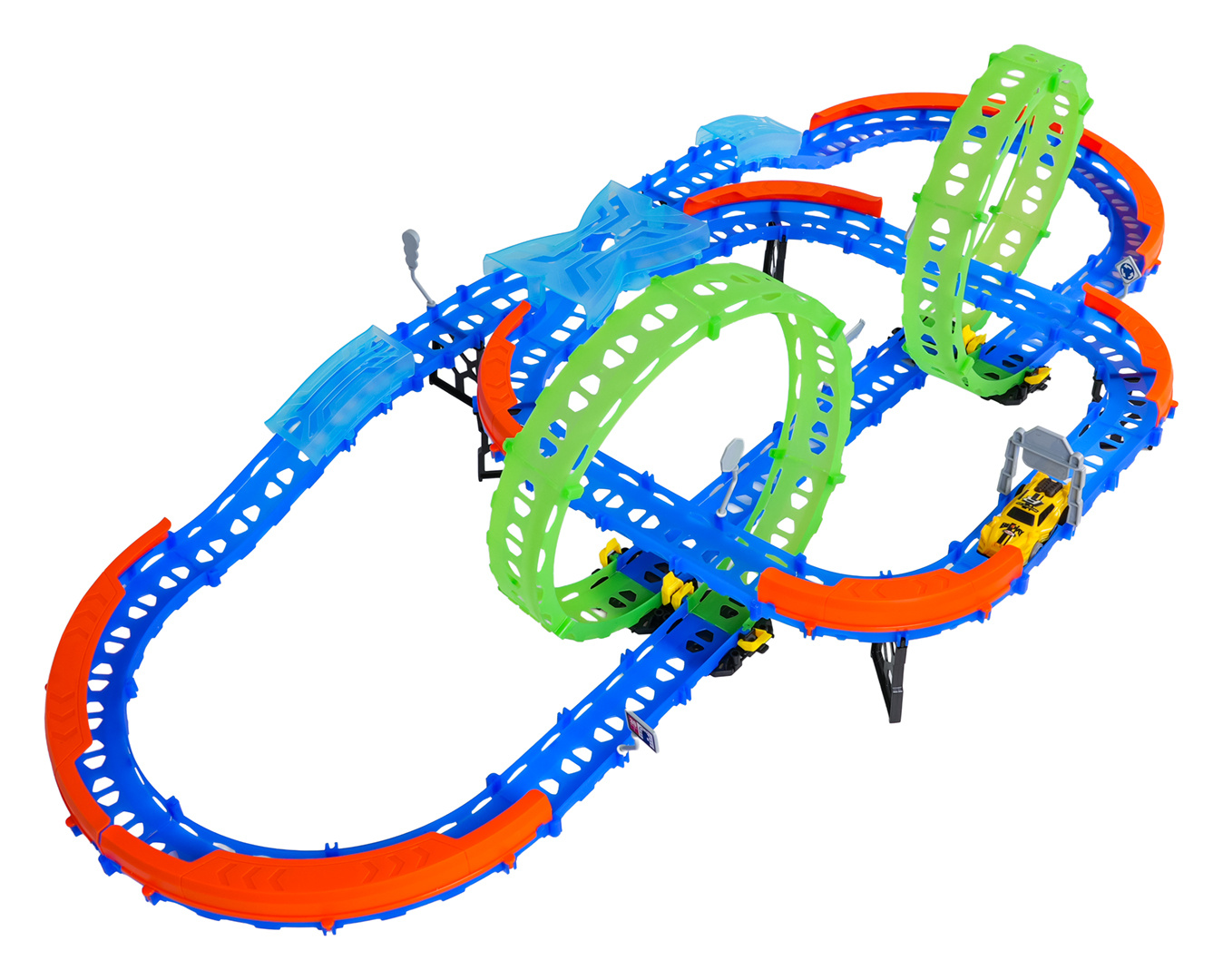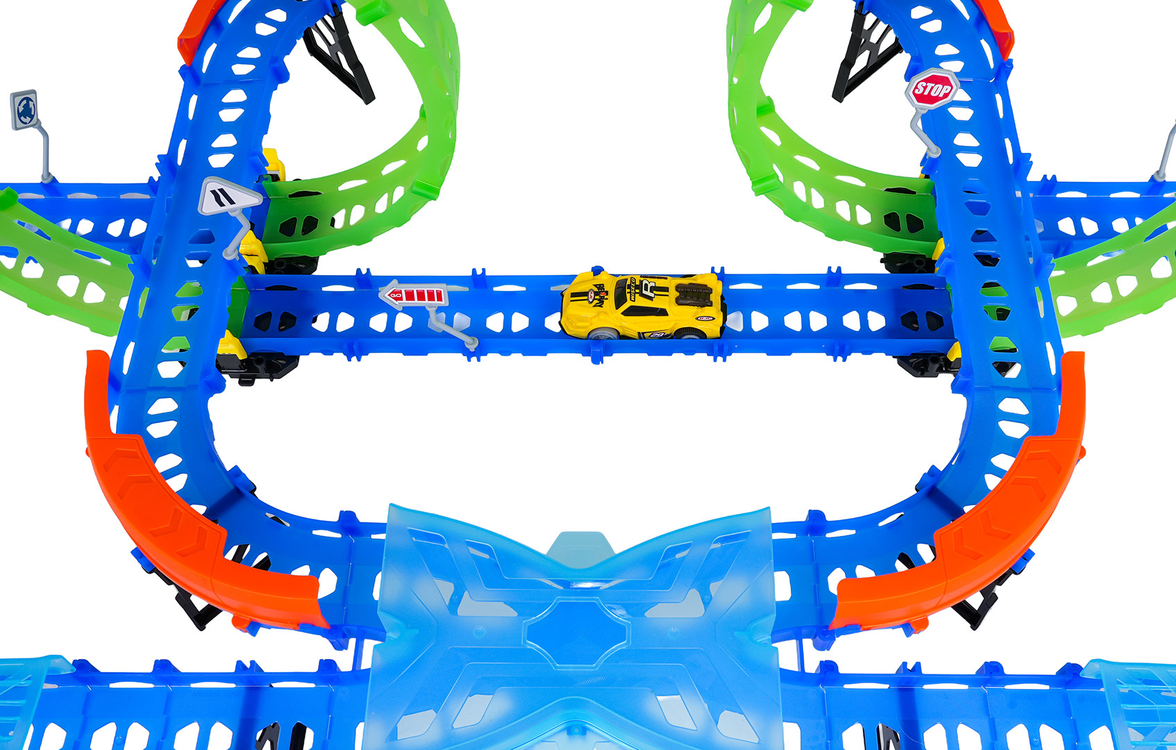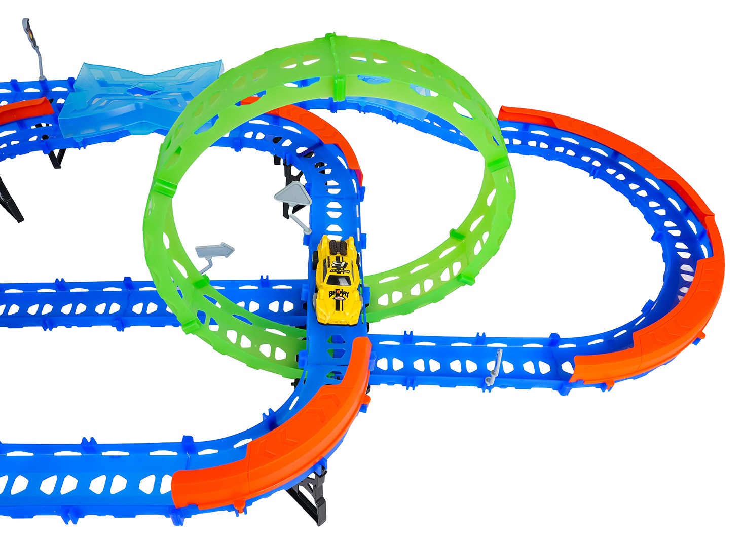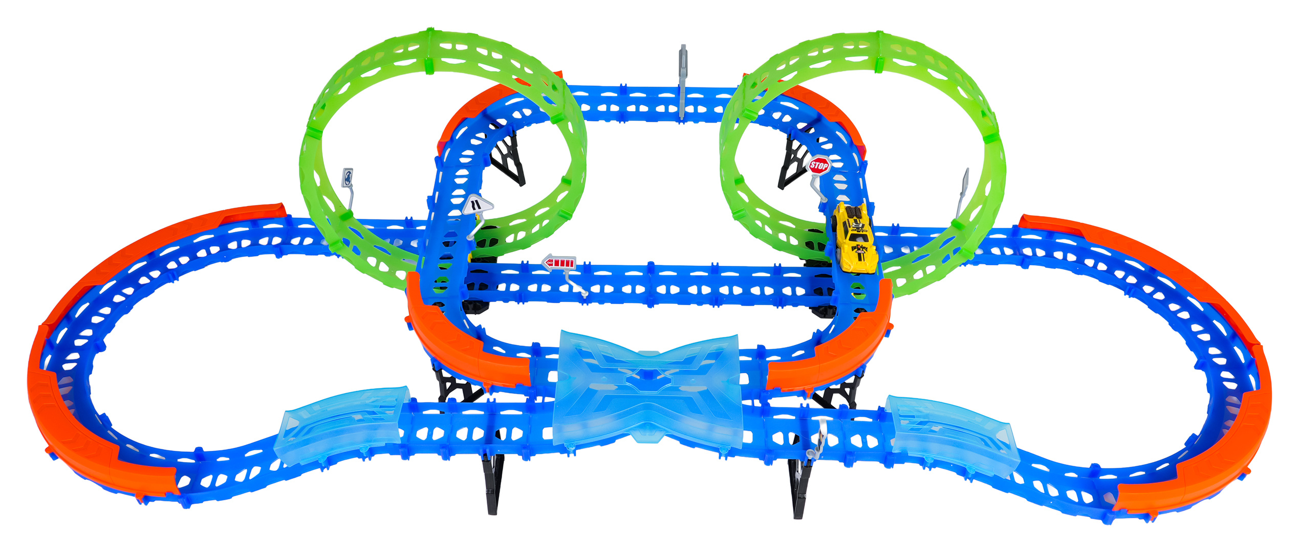 | Fluorescenční závodní dráha s ostrými zatáčkami, smyčkami a rychlým autíčkem je určena pro děti od tří let. Sada se skládá z 63 prvků pro vlastní montáž. Na trati se nacházejí rovné úseky, ostré zatáčky s bariérami zabraňujícími vypadnutí vozidla z trasy, a také dvě smyčky o 360 stupňů. Smyčky jsou fluorescenční, svítí ve tmě. Autíčko má také osvětlení v zadní části. Autíčko je napájeno bateriemi typu 2 x AAA 1,5 V, baterie nejsou součástí balení.