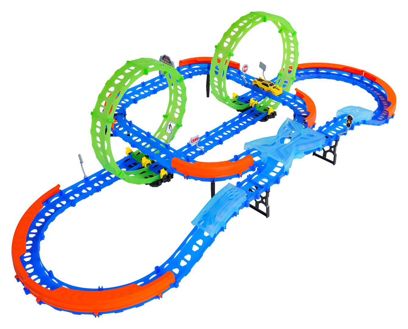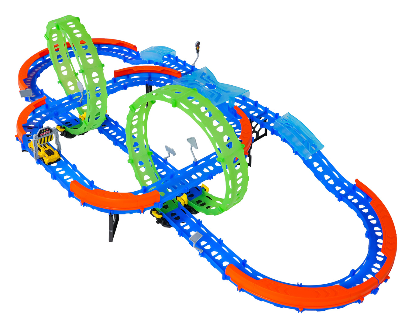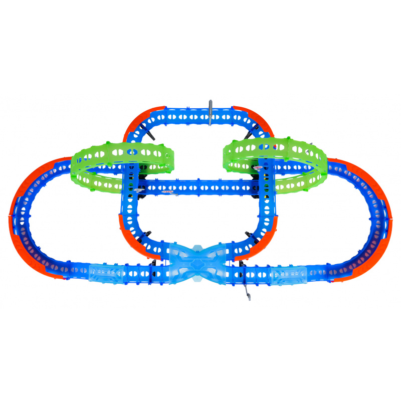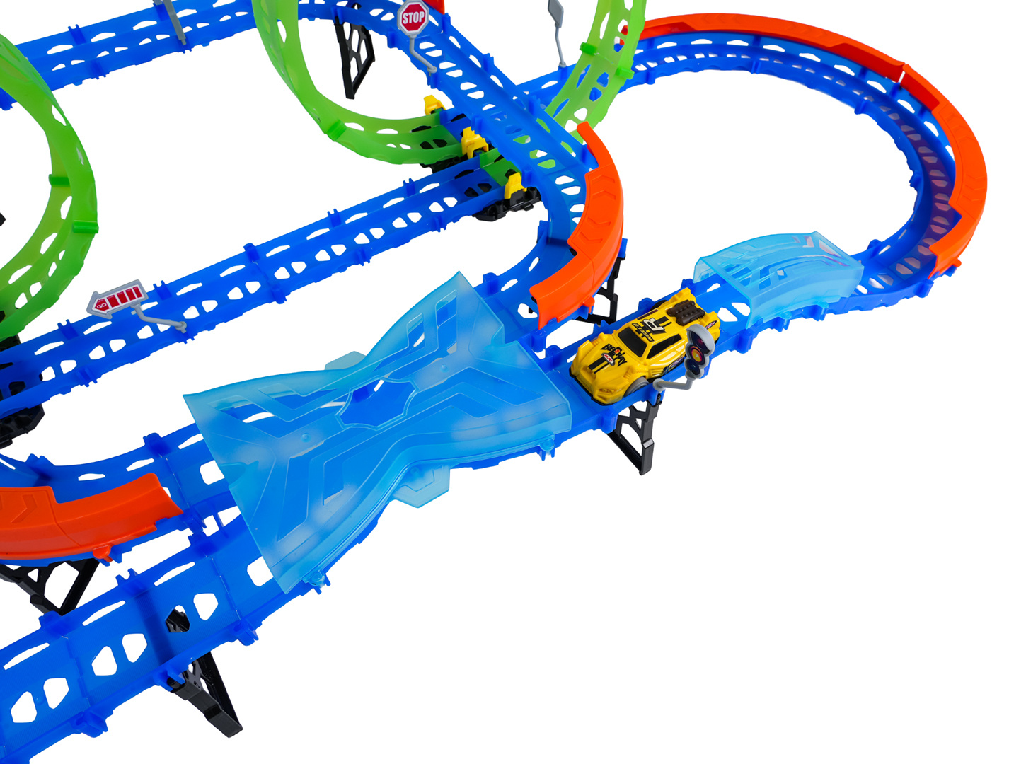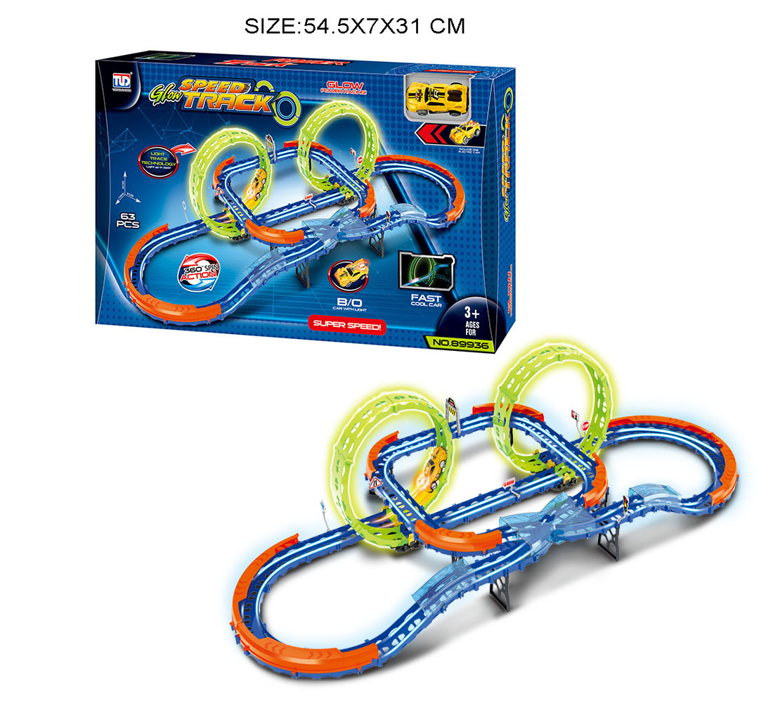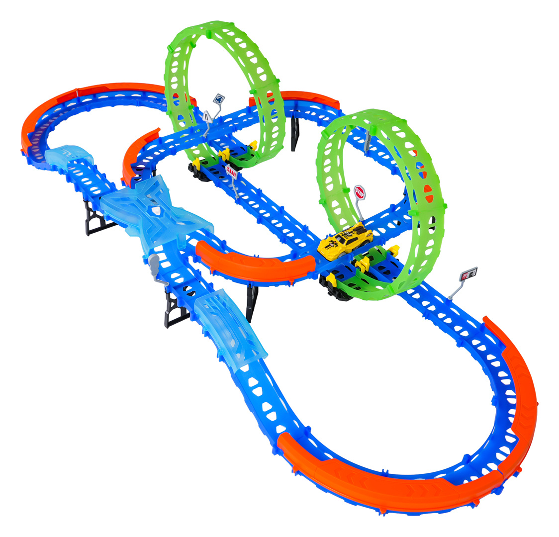| Fluorescenční závodní dráha s ostrými zatáčkami, smyčkami a rychlým autíčkem je určena pro děti od tří let. Sada se skládá z 63 prvků pro vlastní montáž. Na trati se nacházejí rovné úseky, ostré zatáčky s bariérami zabraňujícími vypadnutí vozidla z trasy, a také dvě smyčky o 360 stupňů. Smyčky jsou fluorescenční, svítí ve tmě. Autíčko má také osvětlení v zadní části. Autíčko je napájeno bateriemi typu 2 x AAA 1,5 V, baterie nejsou součástí balení.