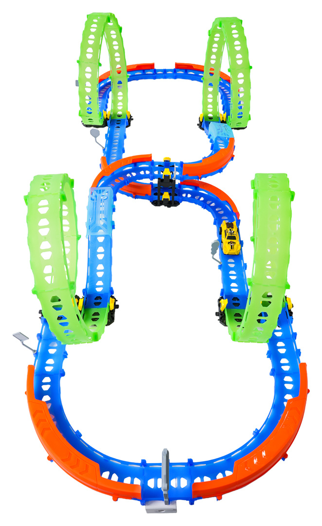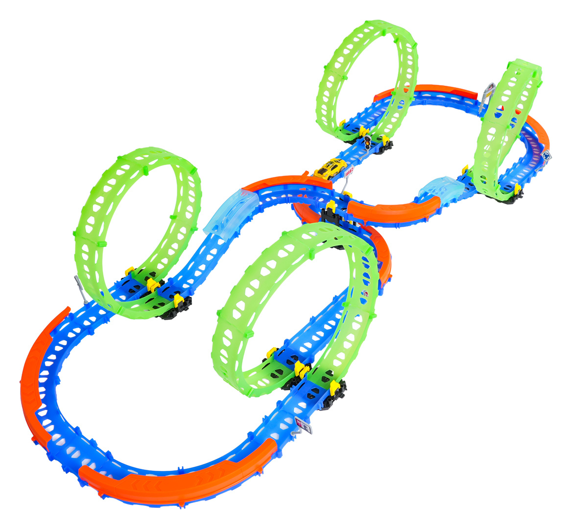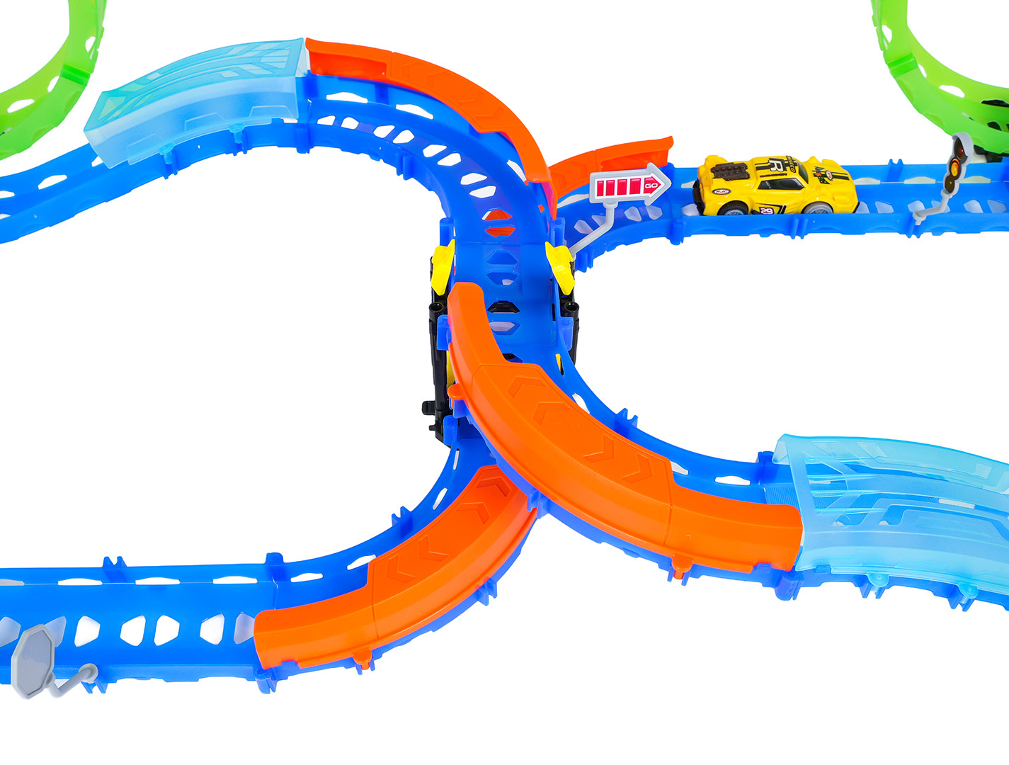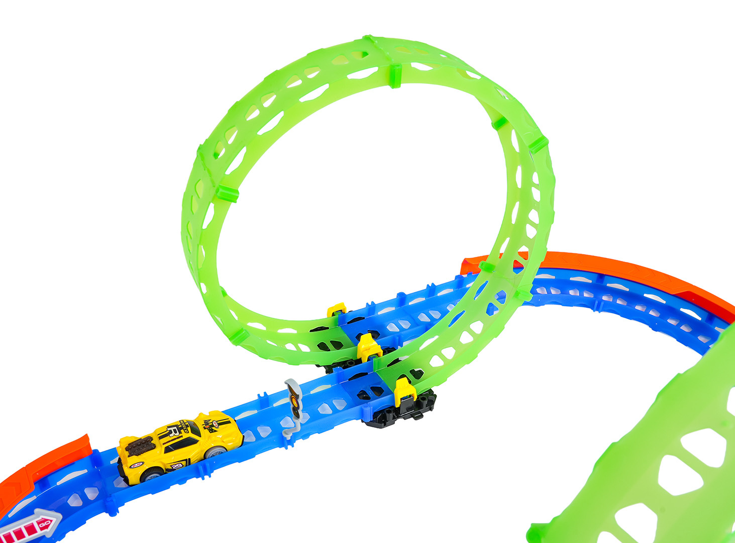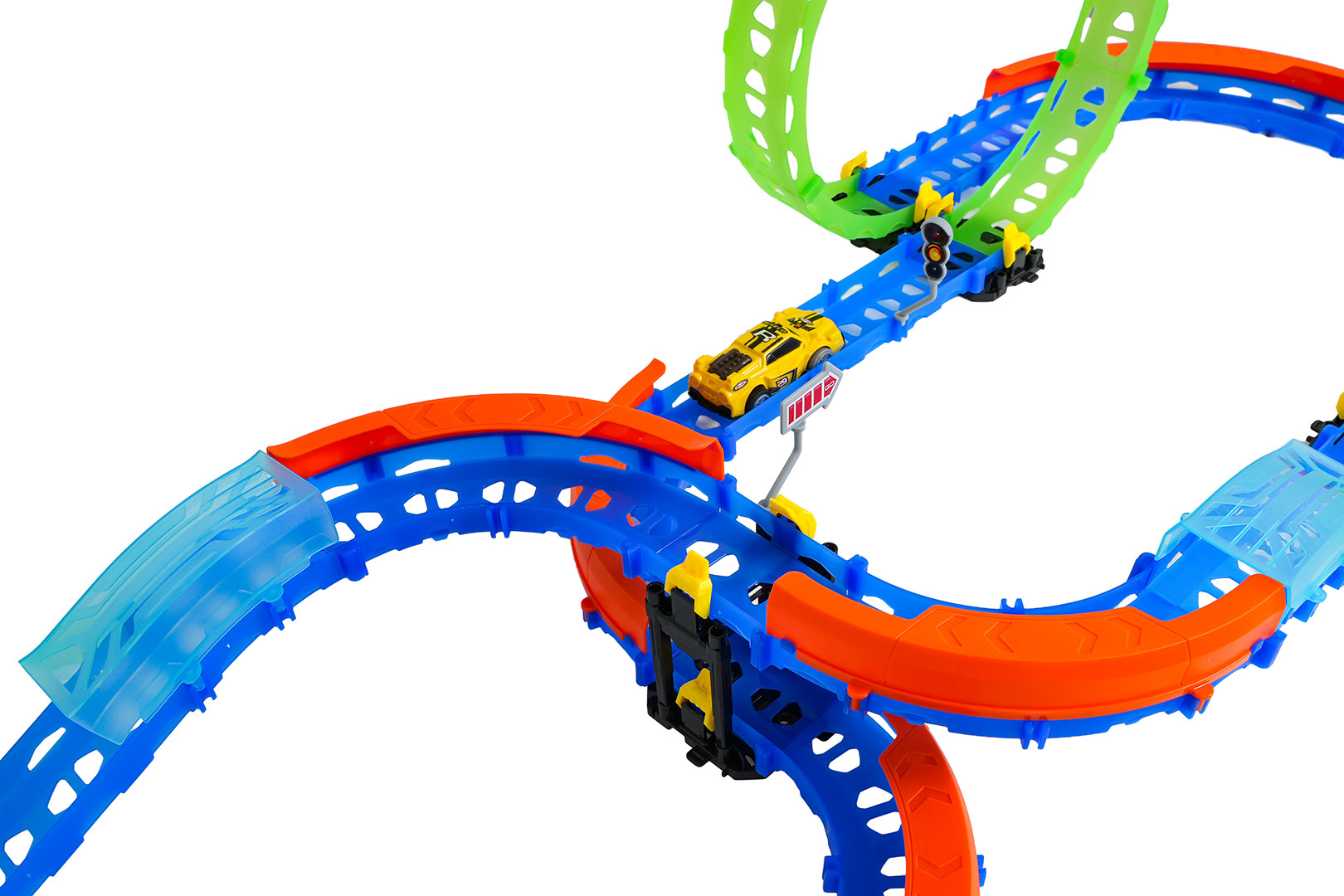 | Fluorescenční závodní dráha s ostrými zatáčkami, smyčkami a rychlým autíčkem je určena pro děti od tří let. Sada se skládá z 86 prvků pro vlastní montáž. Na trati se nacházejí rovné úseky, ostré zatáčky s bariérami zabraňujícími vypadnutí vozidla z trasy, a také čtyři smyčky o 360 stupňů. Smyčky jsou fluorescenční, svítí ve tmě. Autíčko má také osvětlení v zadní části. Autíčko je napájeno bateriemi typu 2 x AA 1,5 V, baterie nejsou součástí balení.