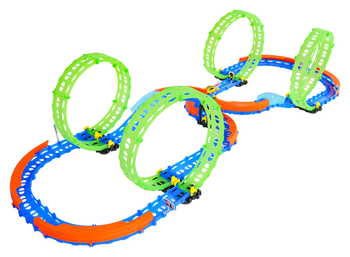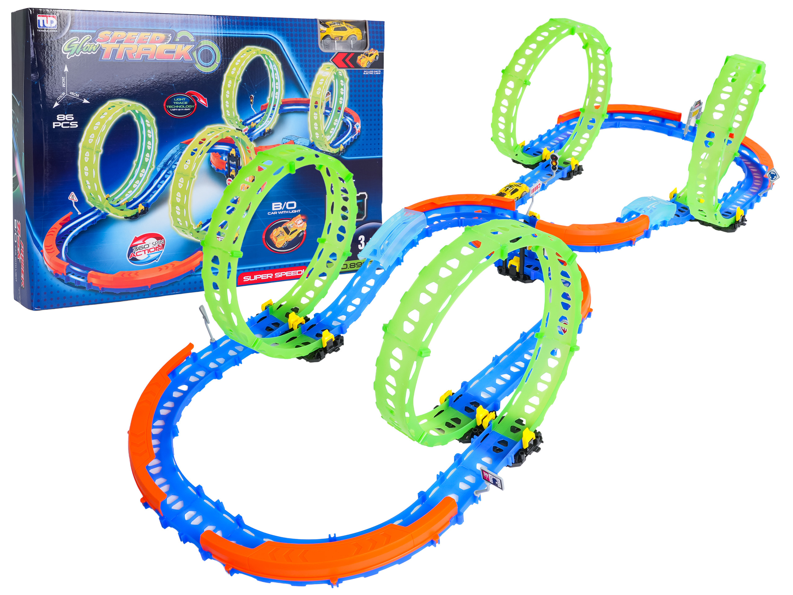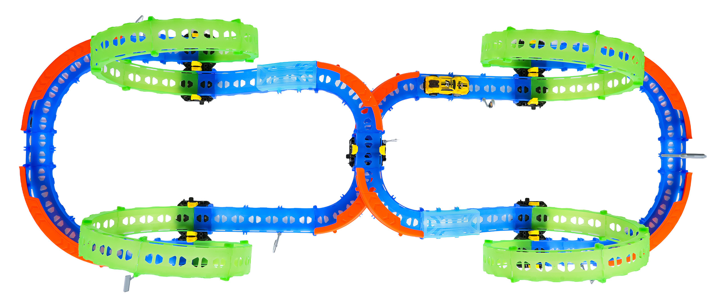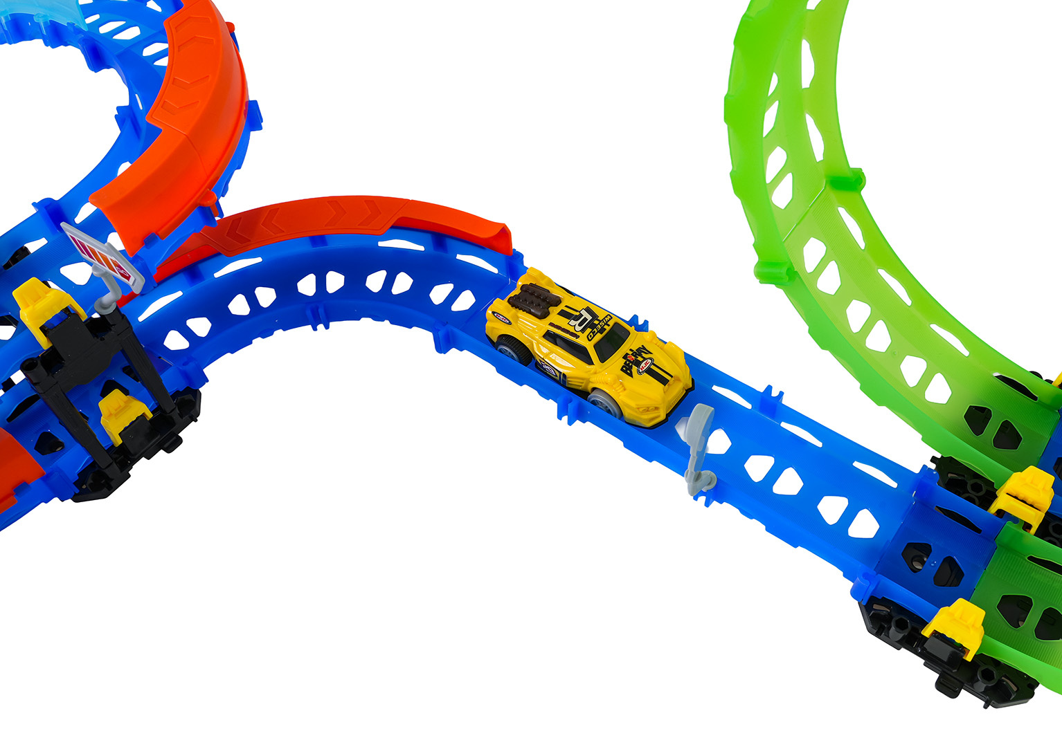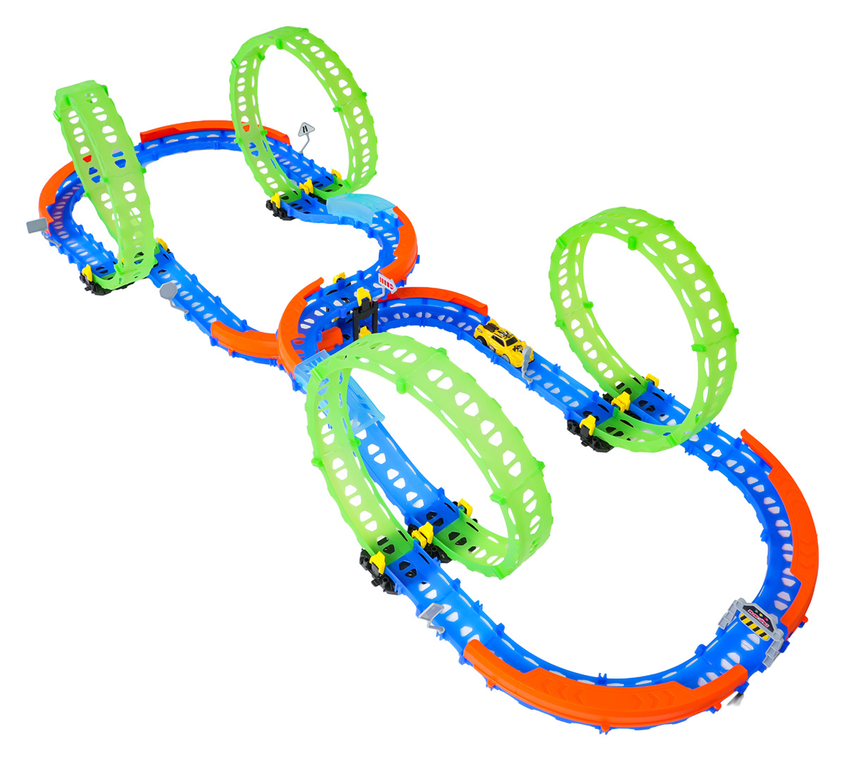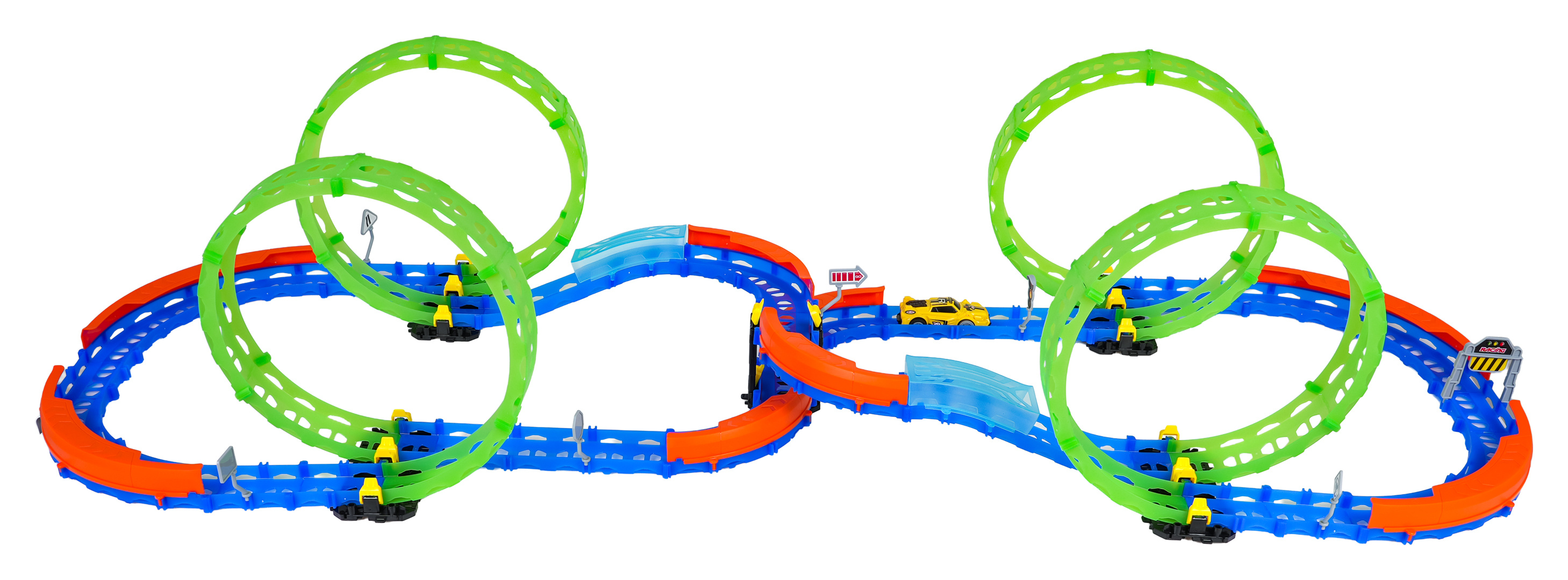 | Fluorescenční závodní dráha s ostrými zatáčkami, smyčkami a rychlým autíčkem je určena pro děti od tří let. Sada se skládá z 86 prvků pro vlastní montáž. Na trati se nacházejí rovné úseky, ostré zatáčky s bariérami zabraňujícími vypadnutí vozidla z trasy, a také čtyři smyčky o 360 stupňů. Smyčky jsou fluorescenční, svítí ve tmě. Autíčko má také osvětlení v zadní části. Autíčko je napájeno bateriemi typu 2 x AA 1,5 V, baterie nejsou součástí balení.