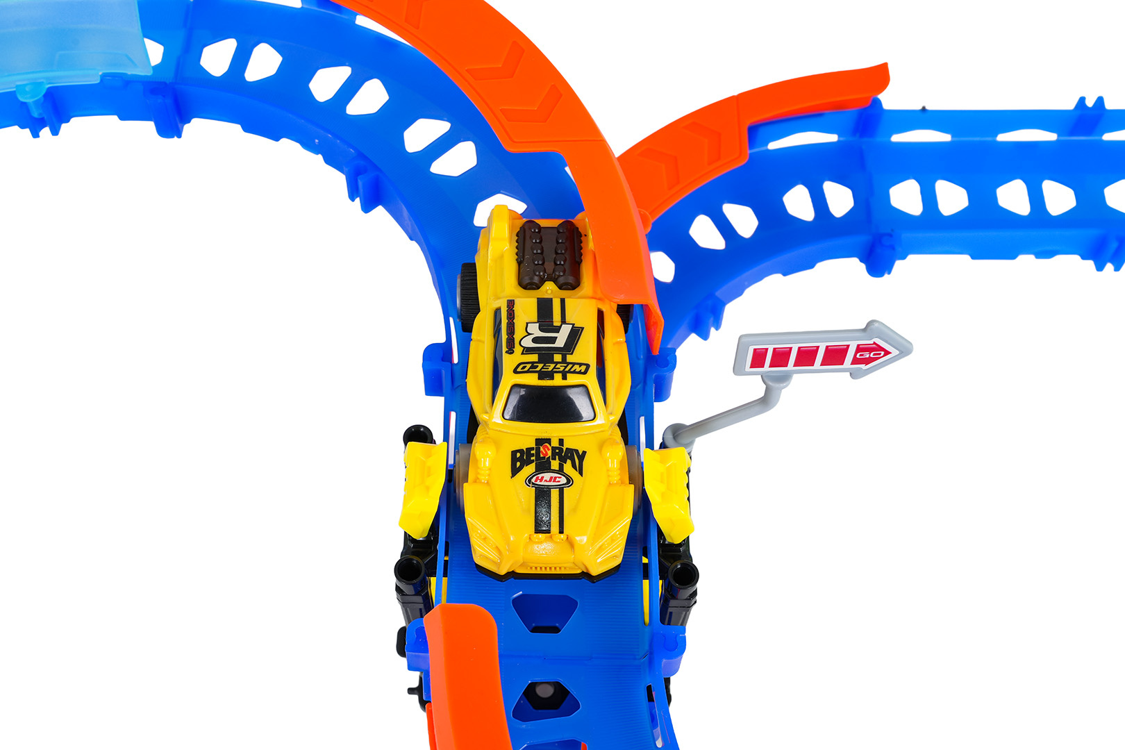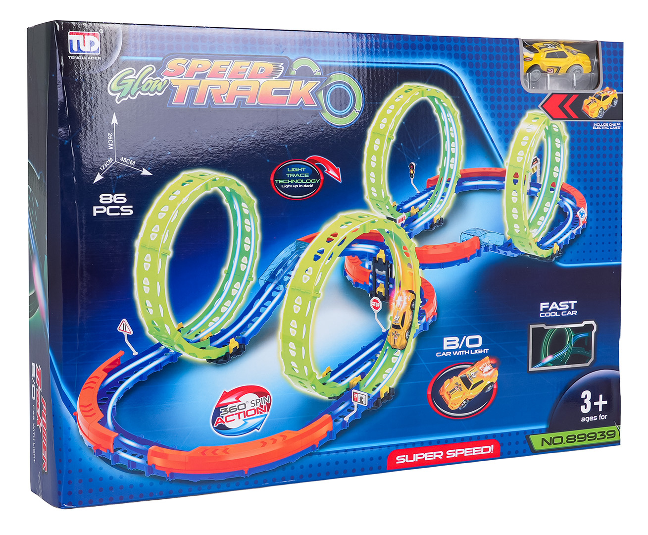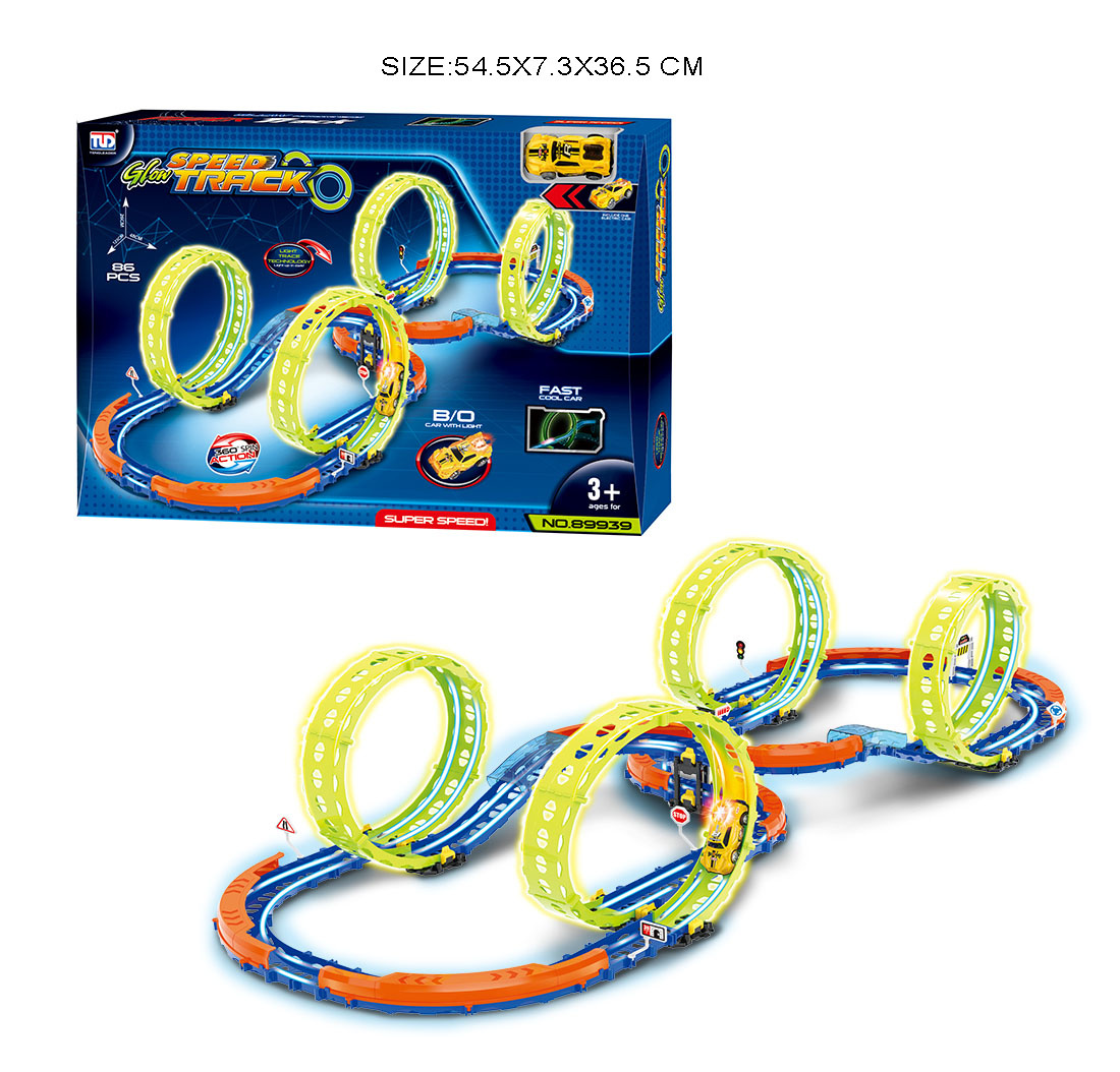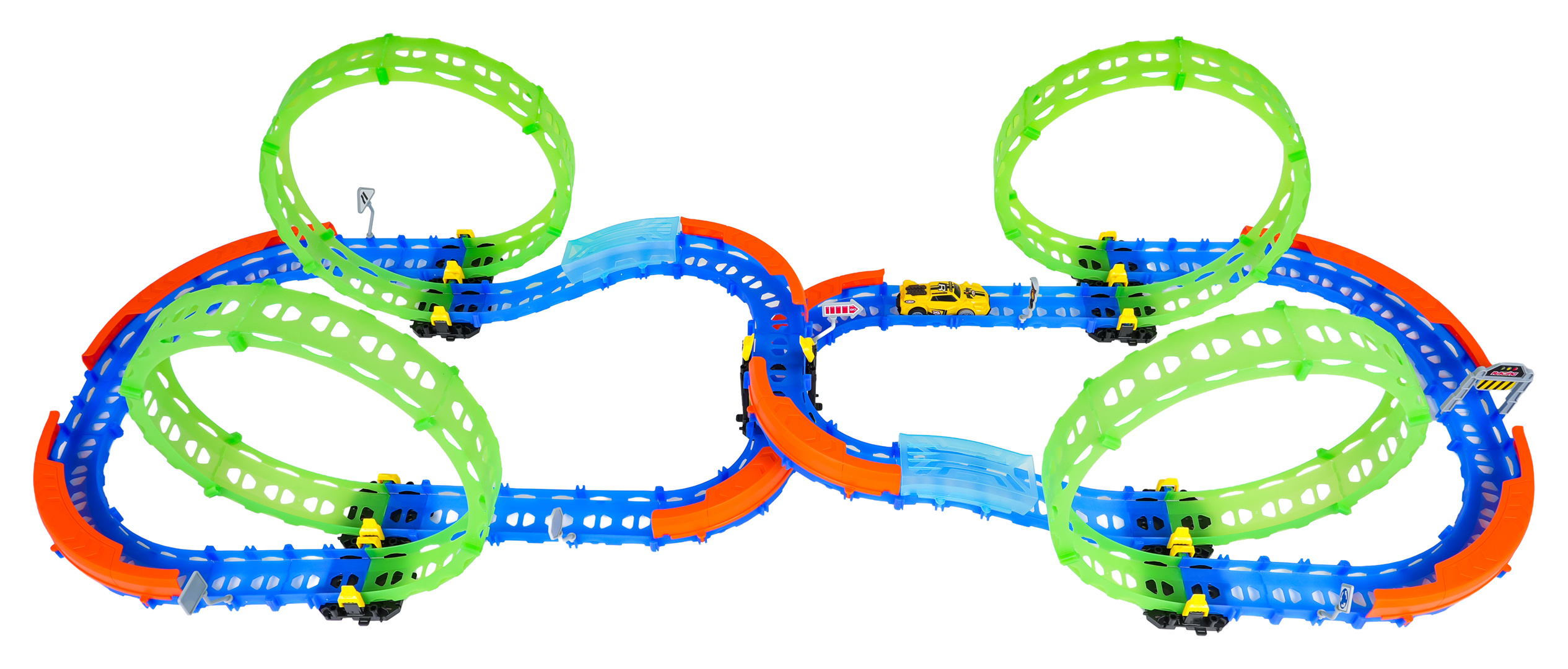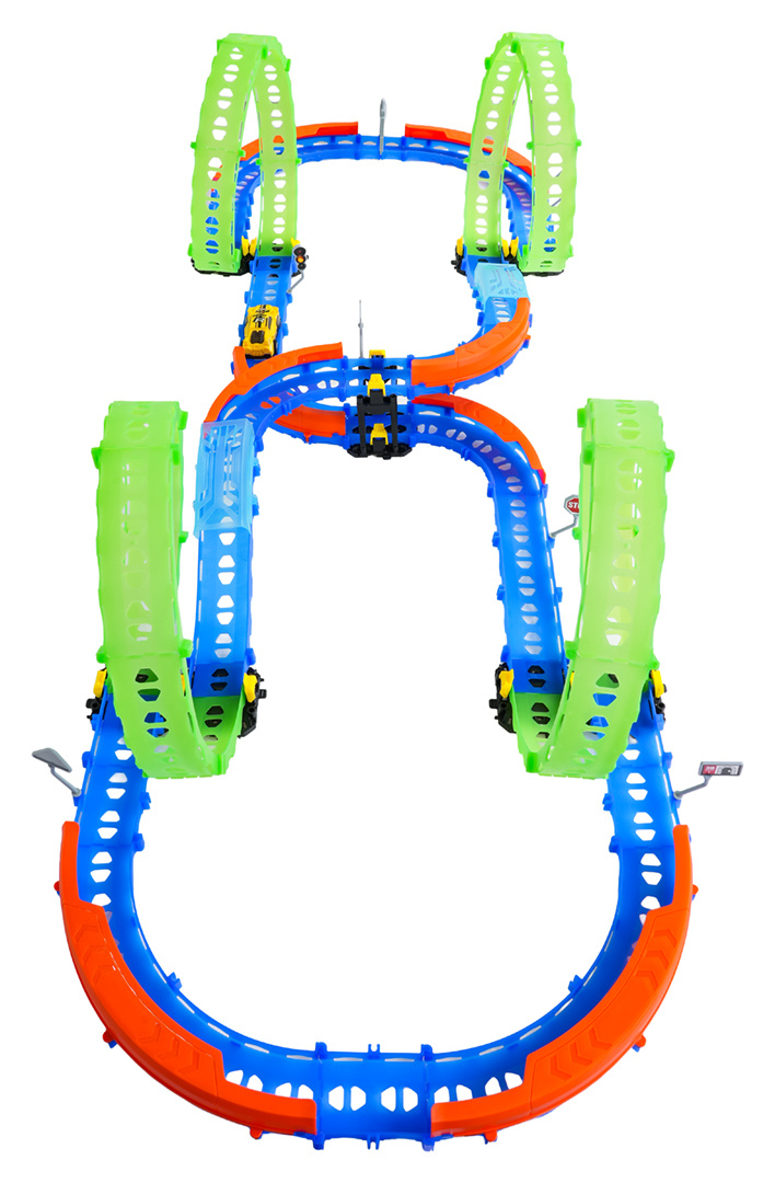 | Fluorescenční závodní dráha s ostrými zatáčkami, smyčkami a rychlým autíčkem je určena pro děti od tří let. Sada se skládá z 86 prvků pro vlastní montáž. Na trati se nacházejí rovné úseky, ostré zatáčky s bariérami zabraňujícími vypadnutí vozidla z trasy, a také čtyři smyčky o 360 stupňů. Smyčky jsou fluorescenční, svítí ve tmě. Autíčko má také osvětlení v zadní části. Autíčko je napájeno bateriemi typu 2 x AA 1,5 V, baterie nejsou součástí balení.