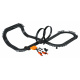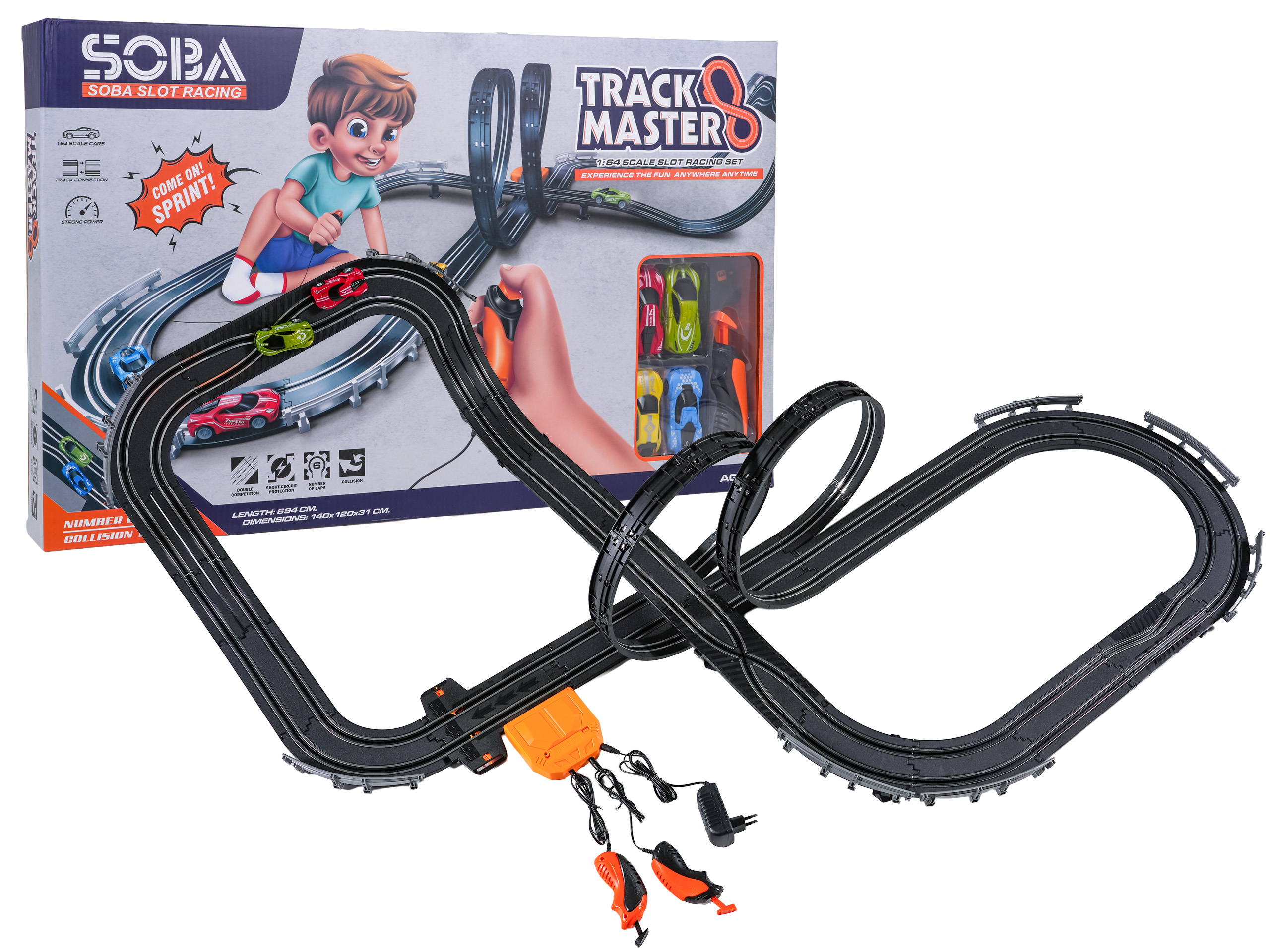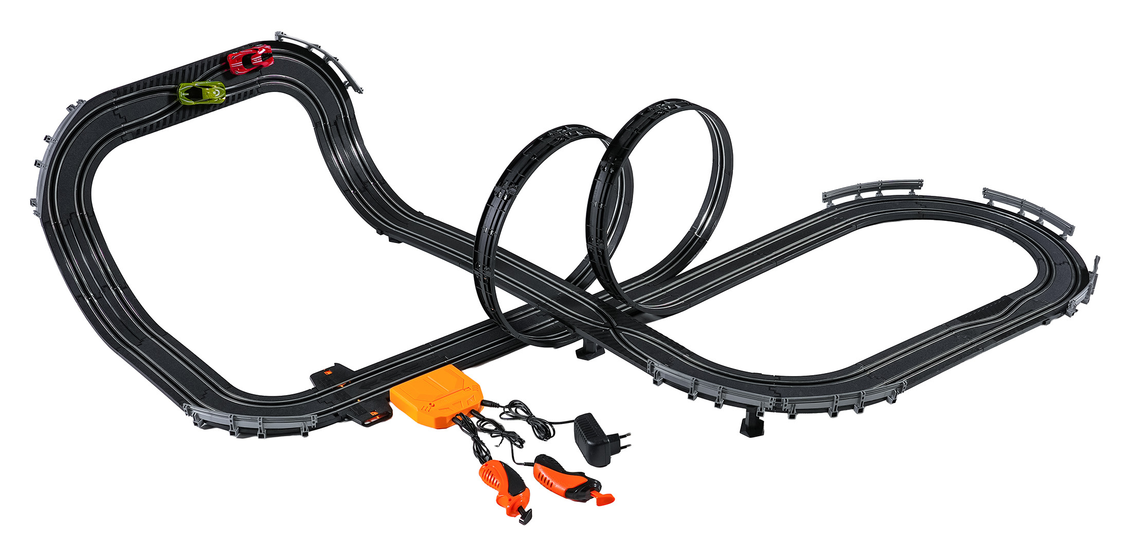 Velká závodní dráha se dvěma dálkově ovládanými autíčky v sadě a vyměnitelnými karoseriemi, pro děti od šesti let. Tato sada umožňuje sestavit dráhu se dvěma smyčkami, ostrými zatáčkami a rovnými úseky. Je vybaven dvěma autíčky, vyměnitelnými karoseriemi pro vozidla a dvěma ovladači. Tor je napájen pomocí napájecího zdroje nebo baterie. Napájecí adaptér 9V v balení, baterie 6 x AA 1,5V (není součástí balení).