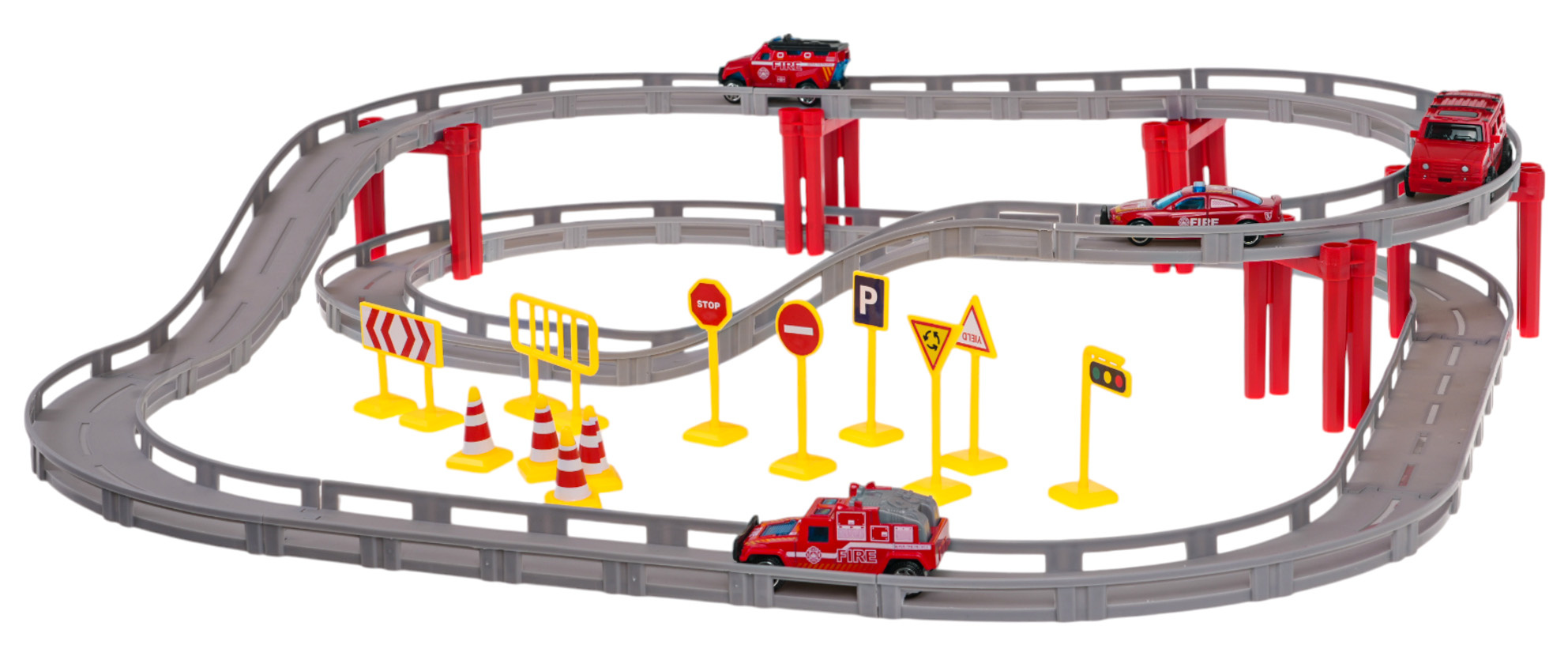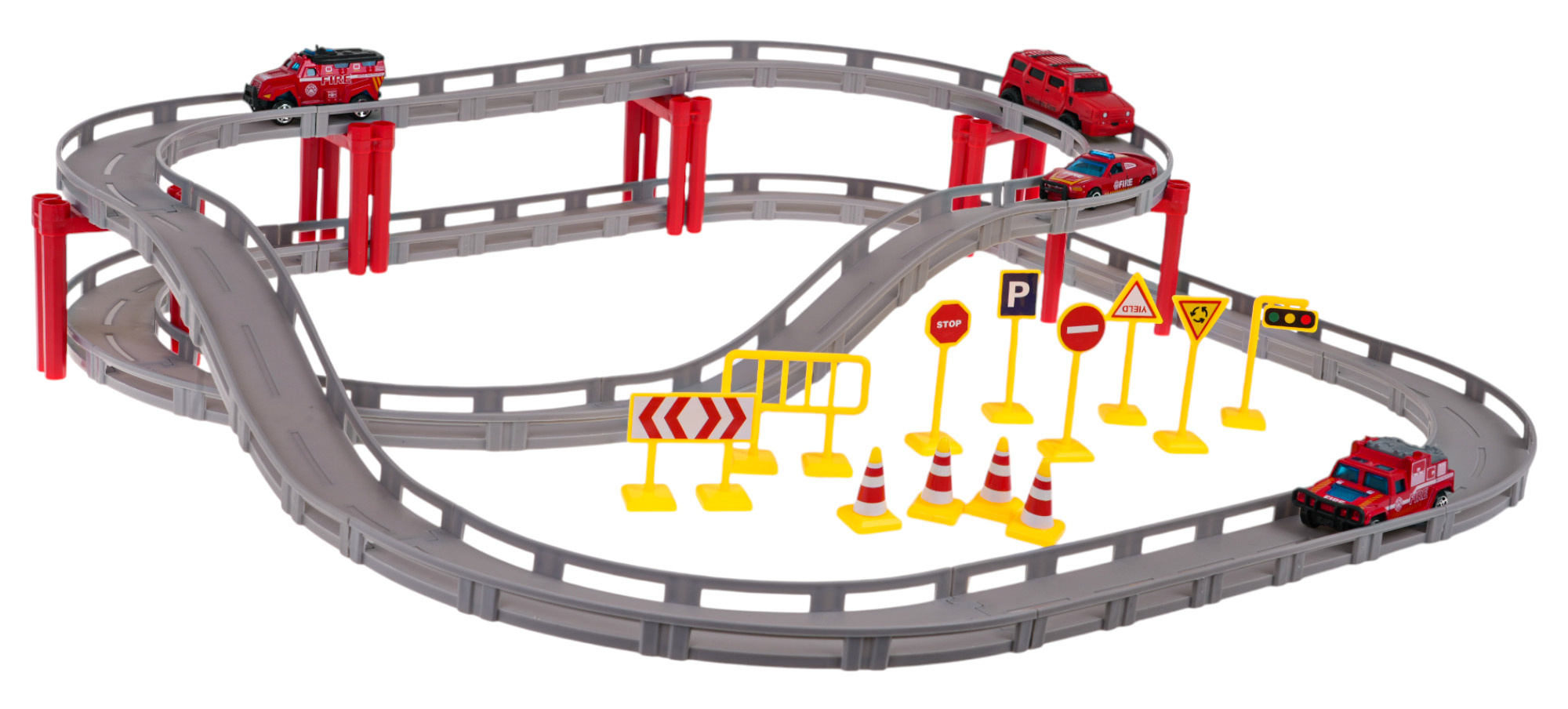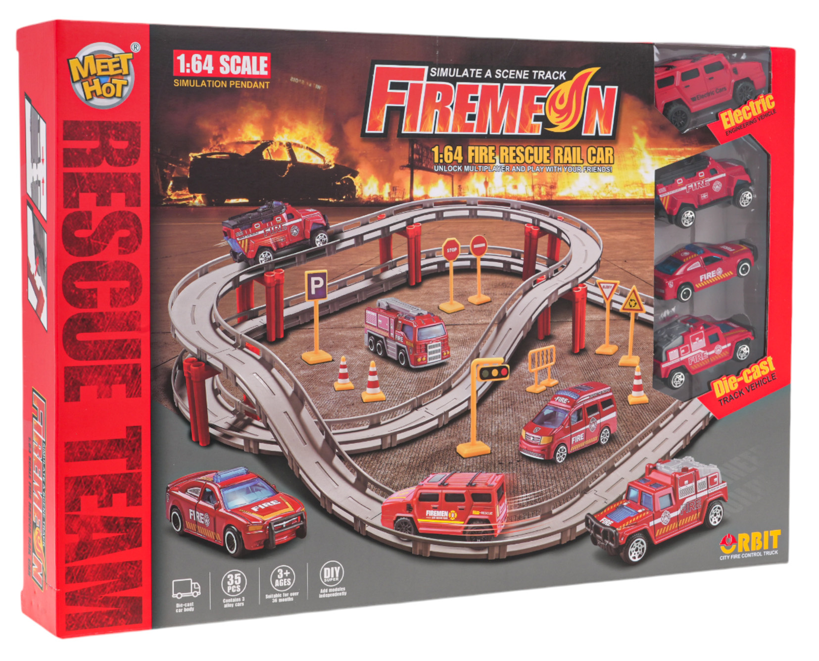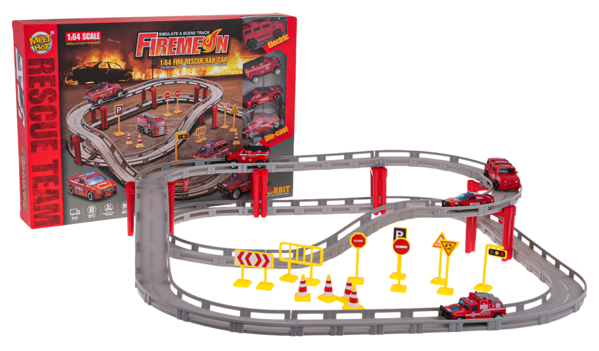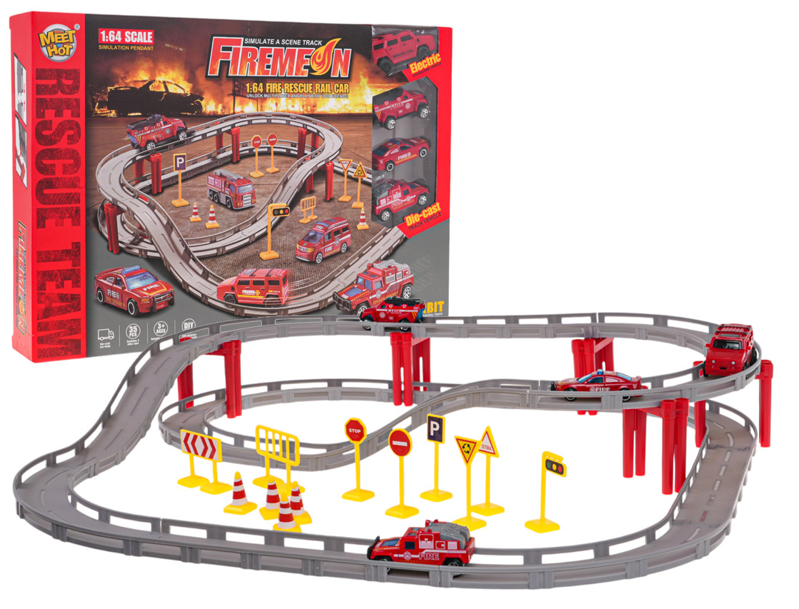 Závodní dráha se skládá z rovných úseků a zatáček , které se spojují a vytvářejí unikátní trať na dvou úrovních. Sada obsahuje čtyři hasičské vozy v měřítku 1:64 , z nichž jeden je poháněn elektricky a jezdí samostatně po trati .