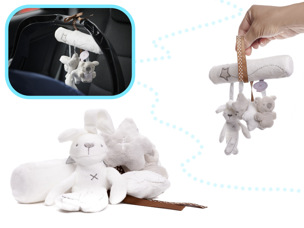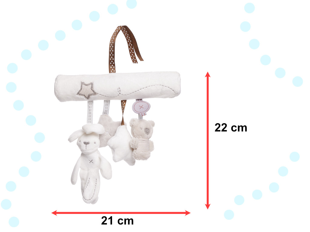 Přívěsek na kočárek je vyroben z měkkého a na dotek příjemného materiálu. Hodí se také jako nosítko a závěs na postýlku. Klidné a jasné barvy povzbudí vaše dítě ke hře.
