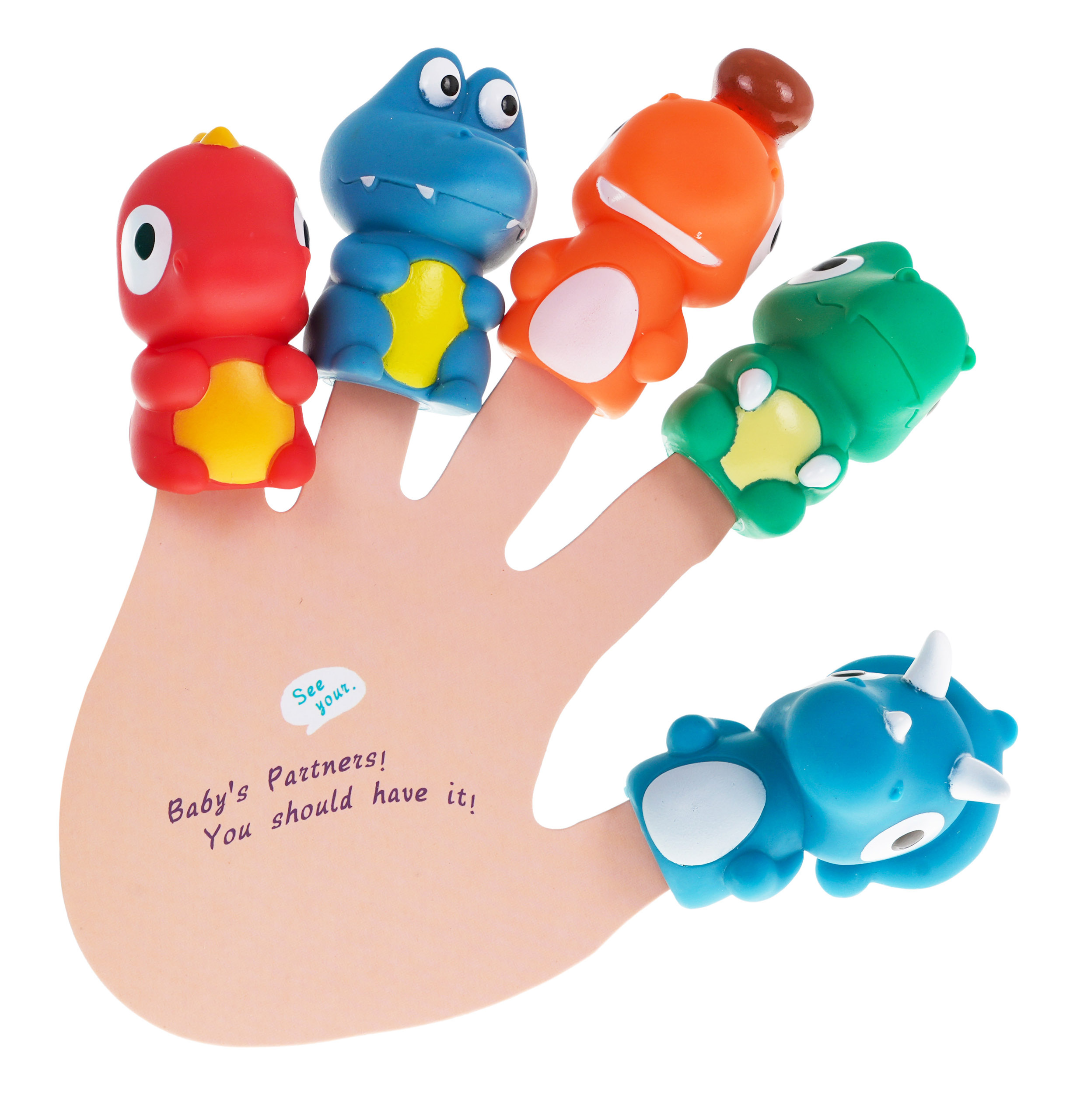 Sada gumových prstových maňásků - dinosaurů s měkkou brožurkou o dinosaurech je vhodná pro děti od 3 let. Prstoví maňásci jsou skvělou zábavou a účinným vzdělávacím nástrojem pro děti. S touto sadou budou moci děti i dospělí hrát divadelní hry s dinosaury jako hlavními postavami. Součástí sady je měkká brožura s dinosauřími dobrodružstvími. Titulky v bookletu jsou v angličtině. Na přední straně brožury v pravém dolním rohu je pískátko. Kniha a loutky jsou voděodolné a nemají ostré hrany. Hra s loutkami pozitivně ovlivňuje rozvoj představivosti, motoriky a soustředění.