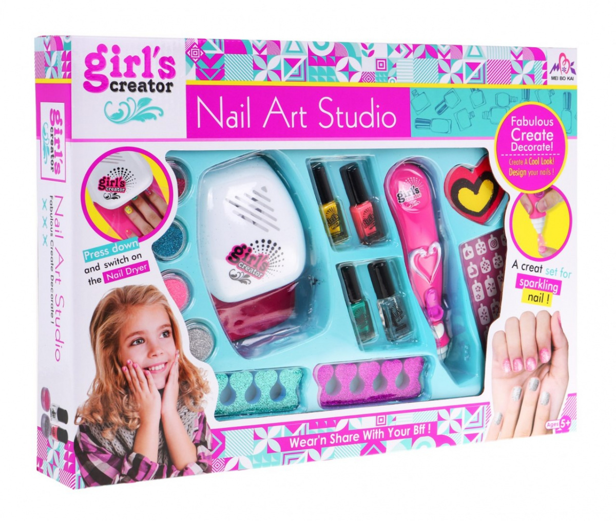 Sada obsahuje vše, co potřebujete k péči o nehty: laky na nehty, pilník, oddělovače, třpytky, aplikace na nehty a také strojek na třpytky a sušičku na nehty. Fén je napájen 2 x AA bateriemi (nejsou součástí balení), strojek na třpytky 2 x AAA bateriemi (nejsou součástí balení). Sada je vyrobena z bezpečných materiálů, které nejsou toxické pro životní prostředí. Lak se z povrchu nehtu zcela odloupne a lze jej rychle a bezpečně odstranit. Nalakované nehty lze díky třpytkám ve spreji pokrýt třpytkami a poté je vysušit pod fénem, který nehty opravdu vysuší.