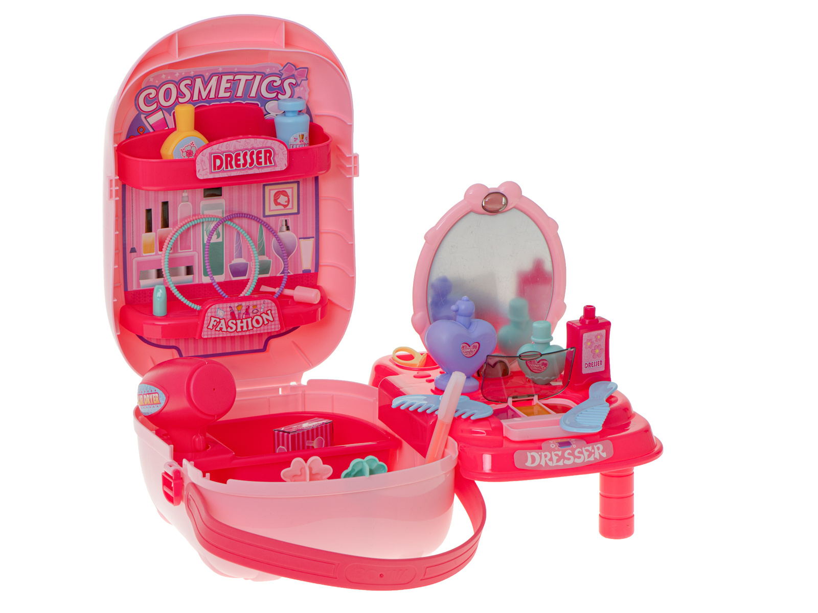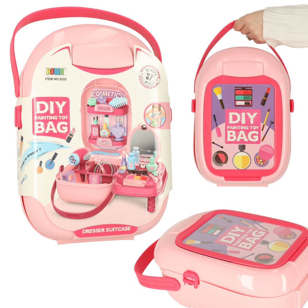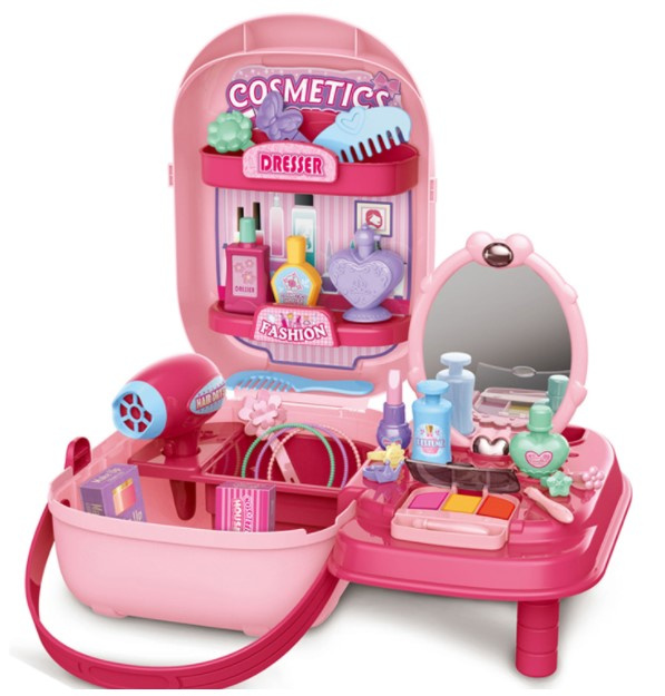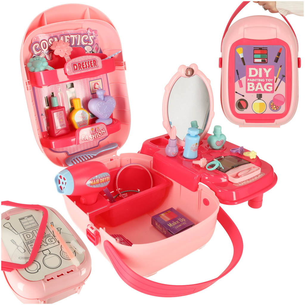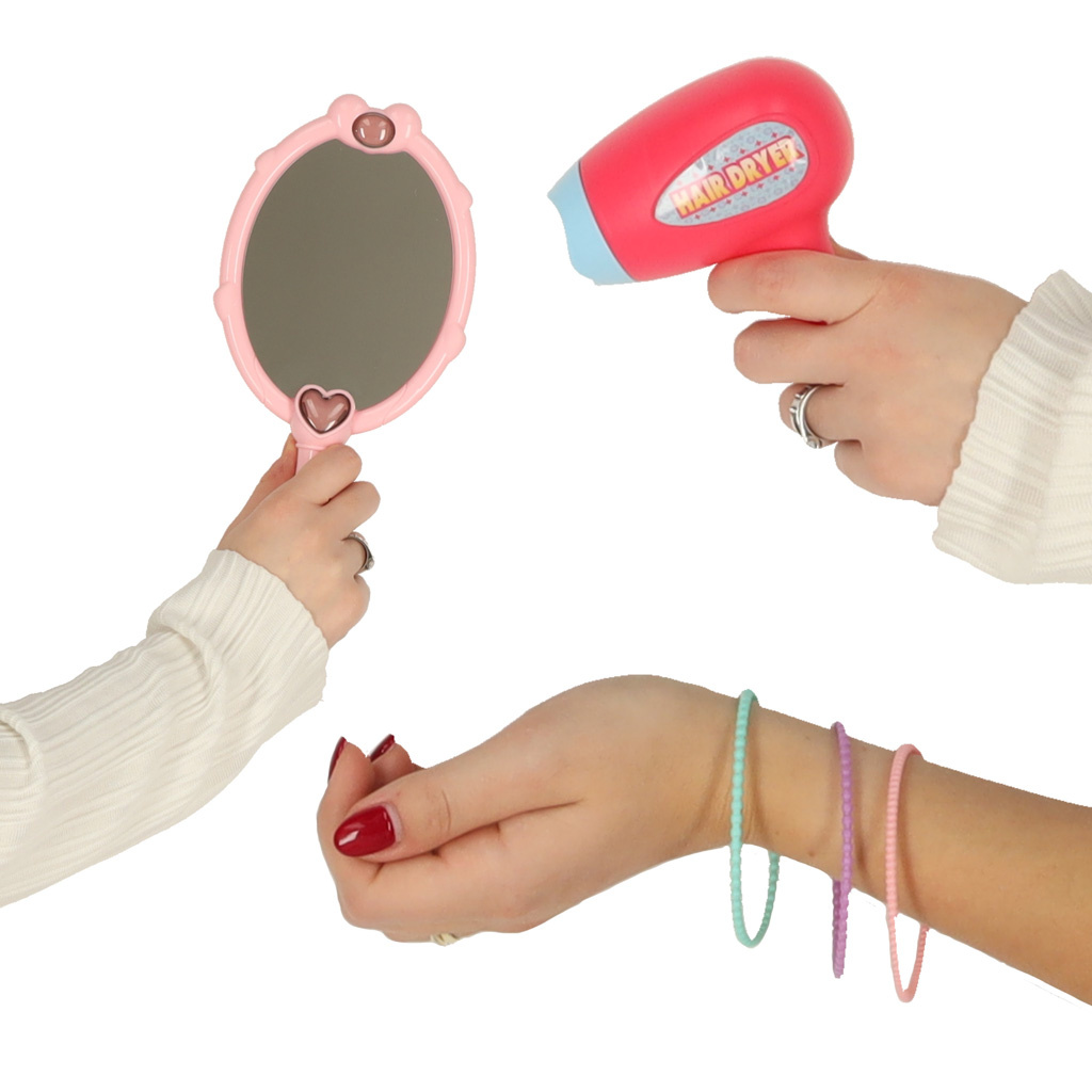 Krásný plastový kufřík ukrývá mnoho pokladů, které potěší každou malou slečnu nebo budoucí kadeřnici. Sponky, náramky, fény a hřebeny jsou nezbytným vybavením každého profesionálního kosmetického salonu.