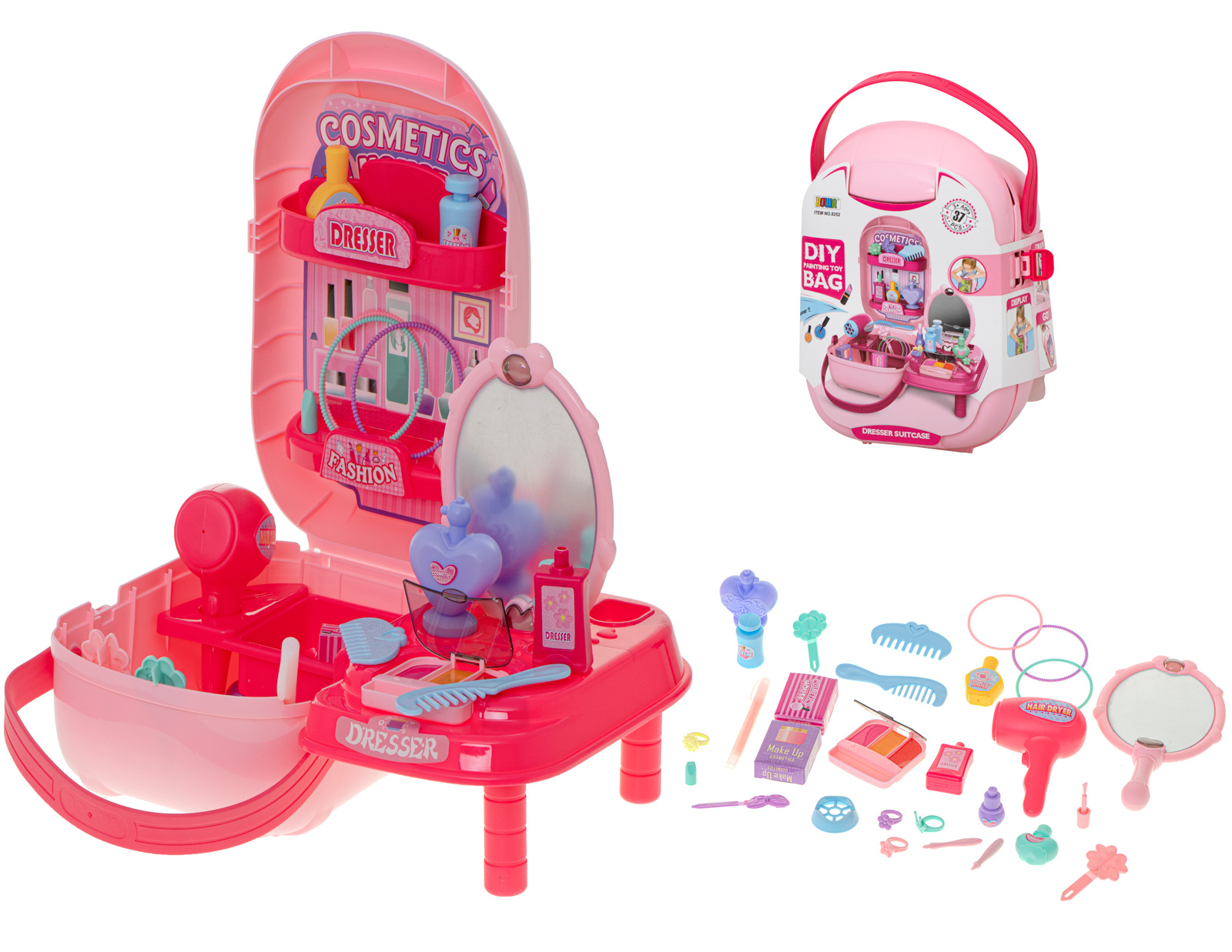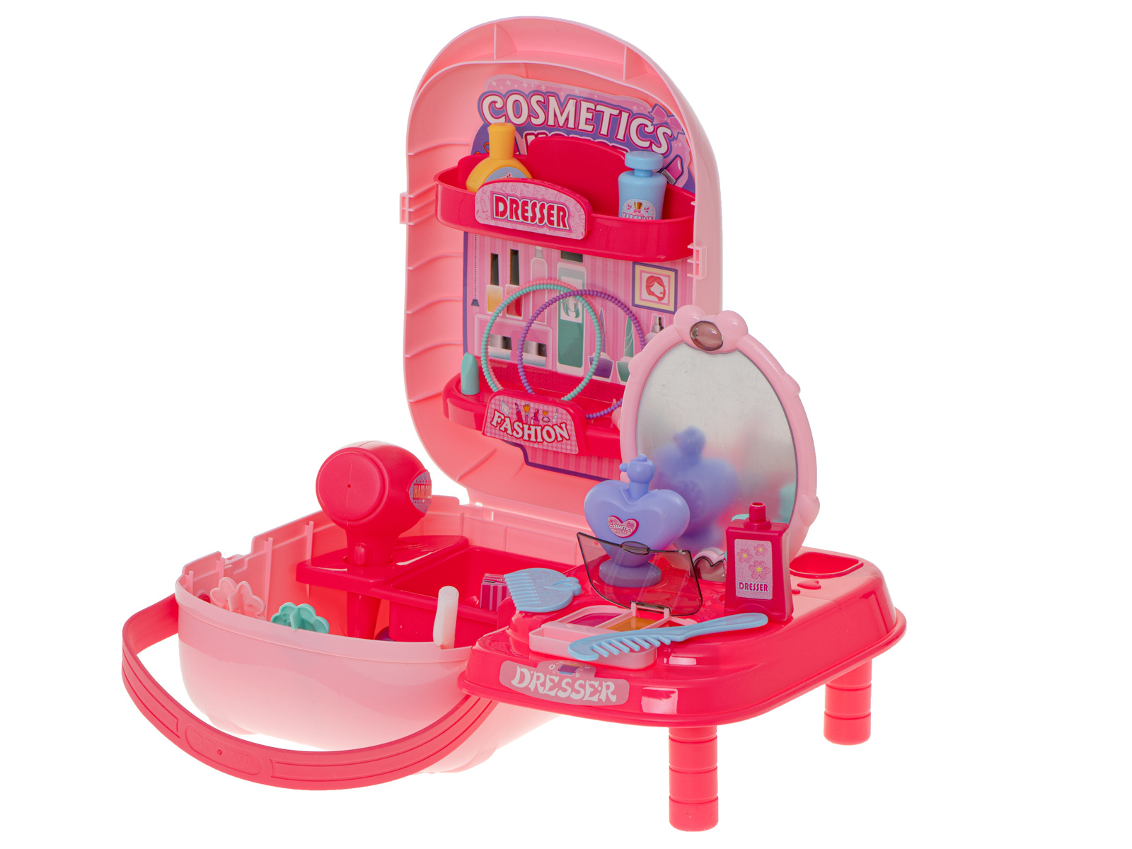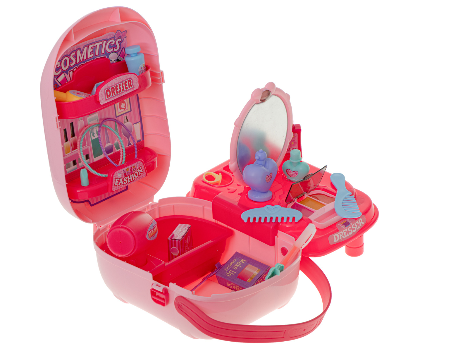 Krásný plastový kufřík ukrývá mnoho pokladů, které potěší každou malou slečnu nebo budoucí kadeřnici. Sponky, náramky, fény a hřebeny jsou nezbytným vybavením každého profesionálního kosmetického salonu.