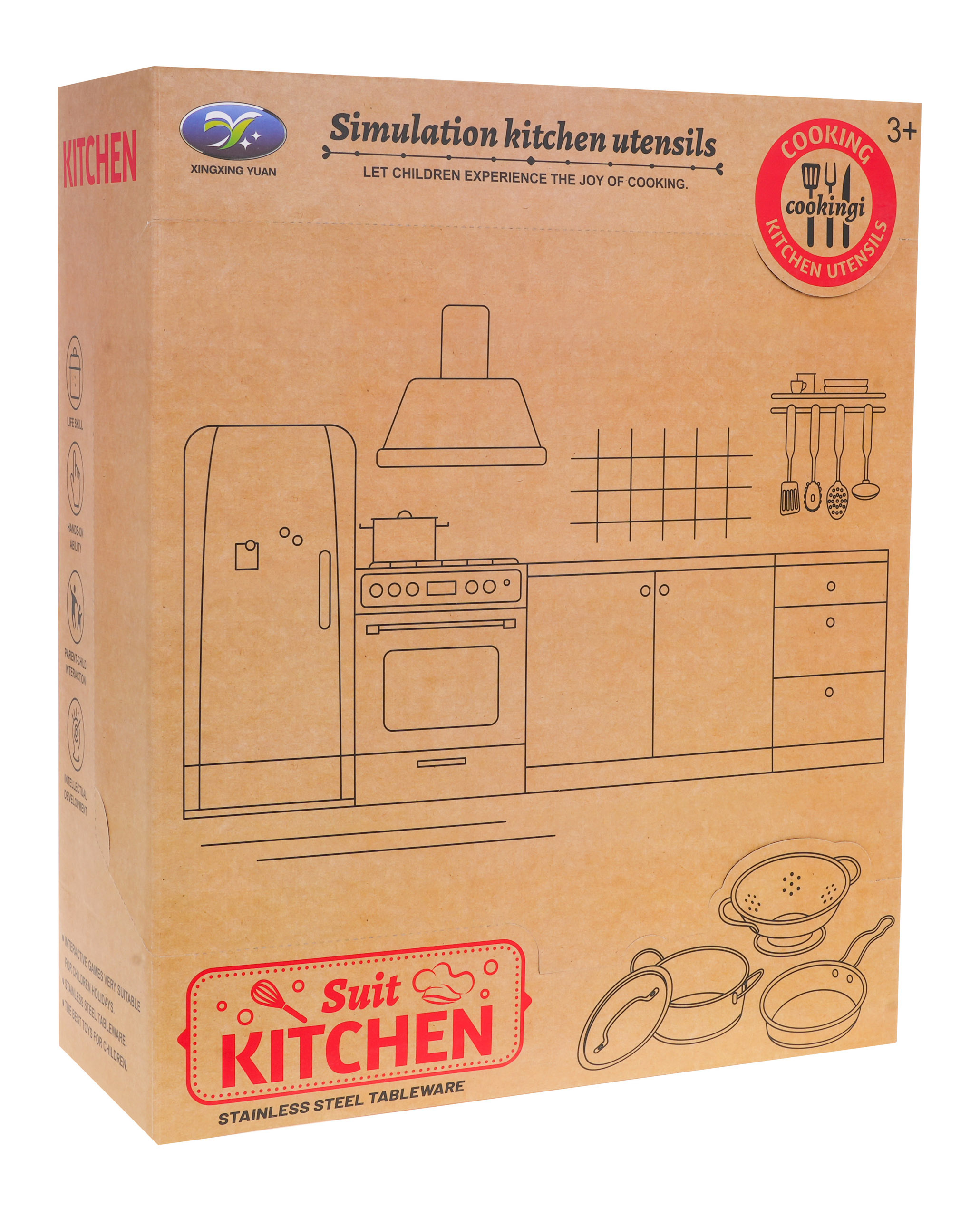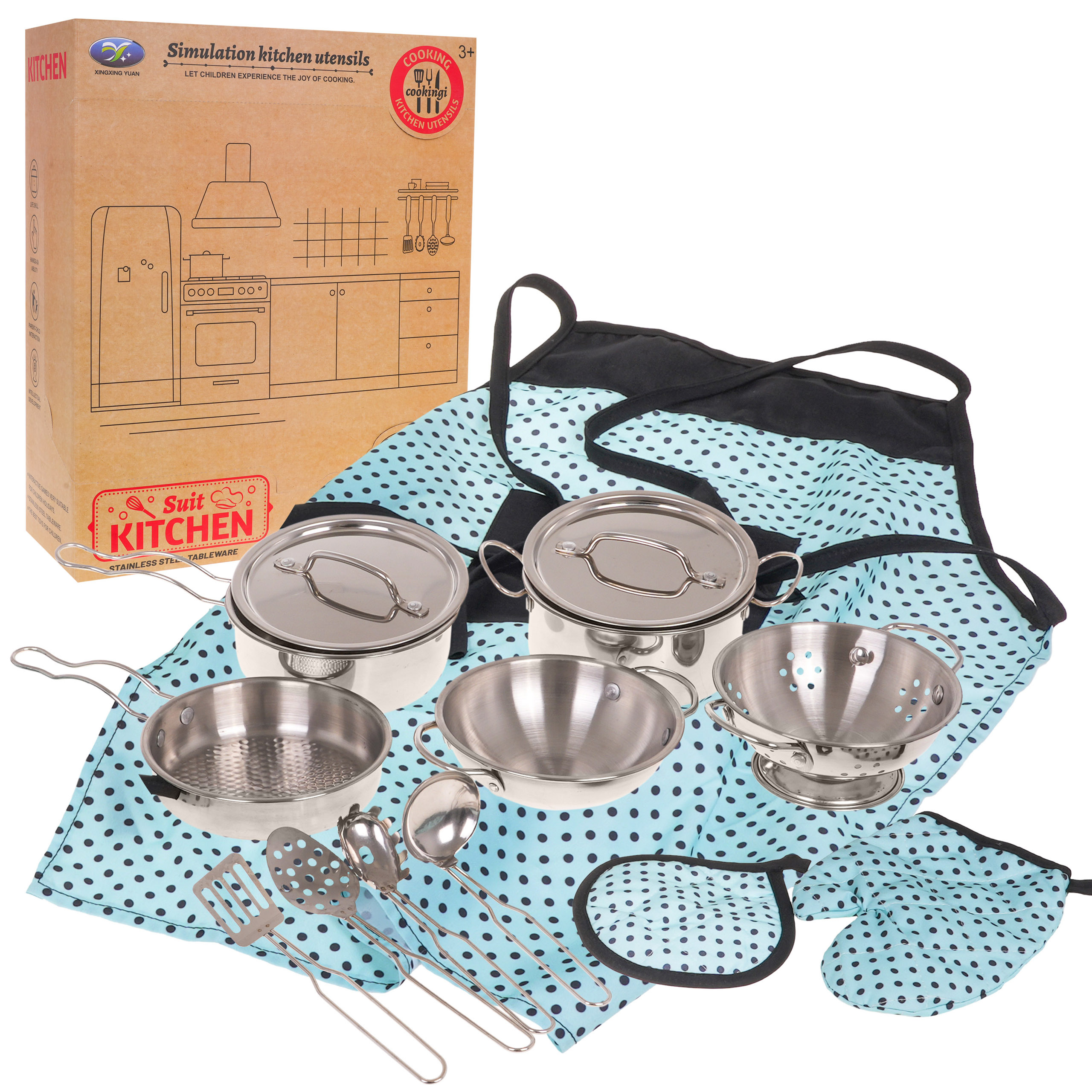 Skvěle vyrobená, robustní kovová sada hrnců s příslušenstvím pro děti od 3 let. Kovové provedení zaručuje odolnost a robustnost. Sada obsahuje hrnce a kuchyňské náčiní, které jsou nezbytné pro každou dětskou kuchyňku. Upozorňujeme, že pouze u nás je součástí dodávky také zástěra.