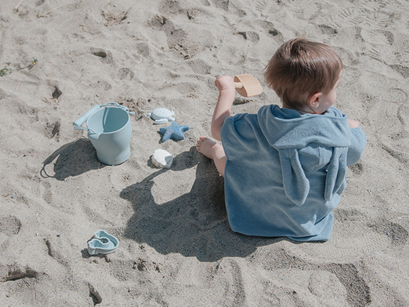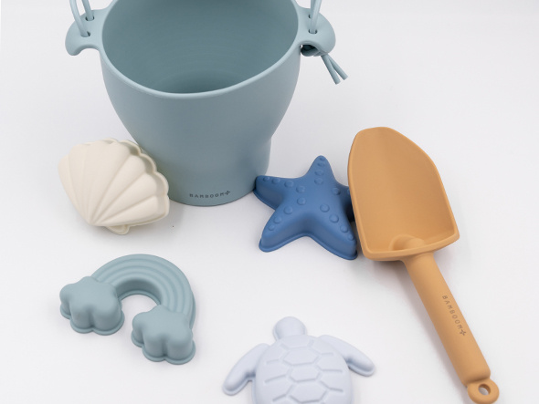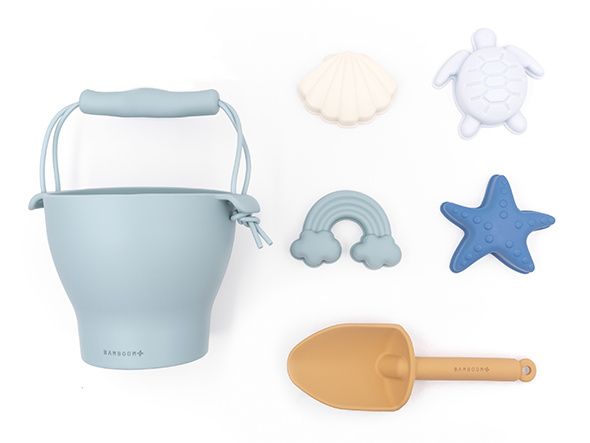 Sada hraček na písek, kyblík a lopatka jsou vyrobeny z měkkého a velmi odolného silikonu, 100% bez BPA. Sada obsahuje čtyři formy, lopatu a kbelík. Ideální na hraní na pískovišti a na pláži - v kufru a plážové tašce zabere jen málo místa.