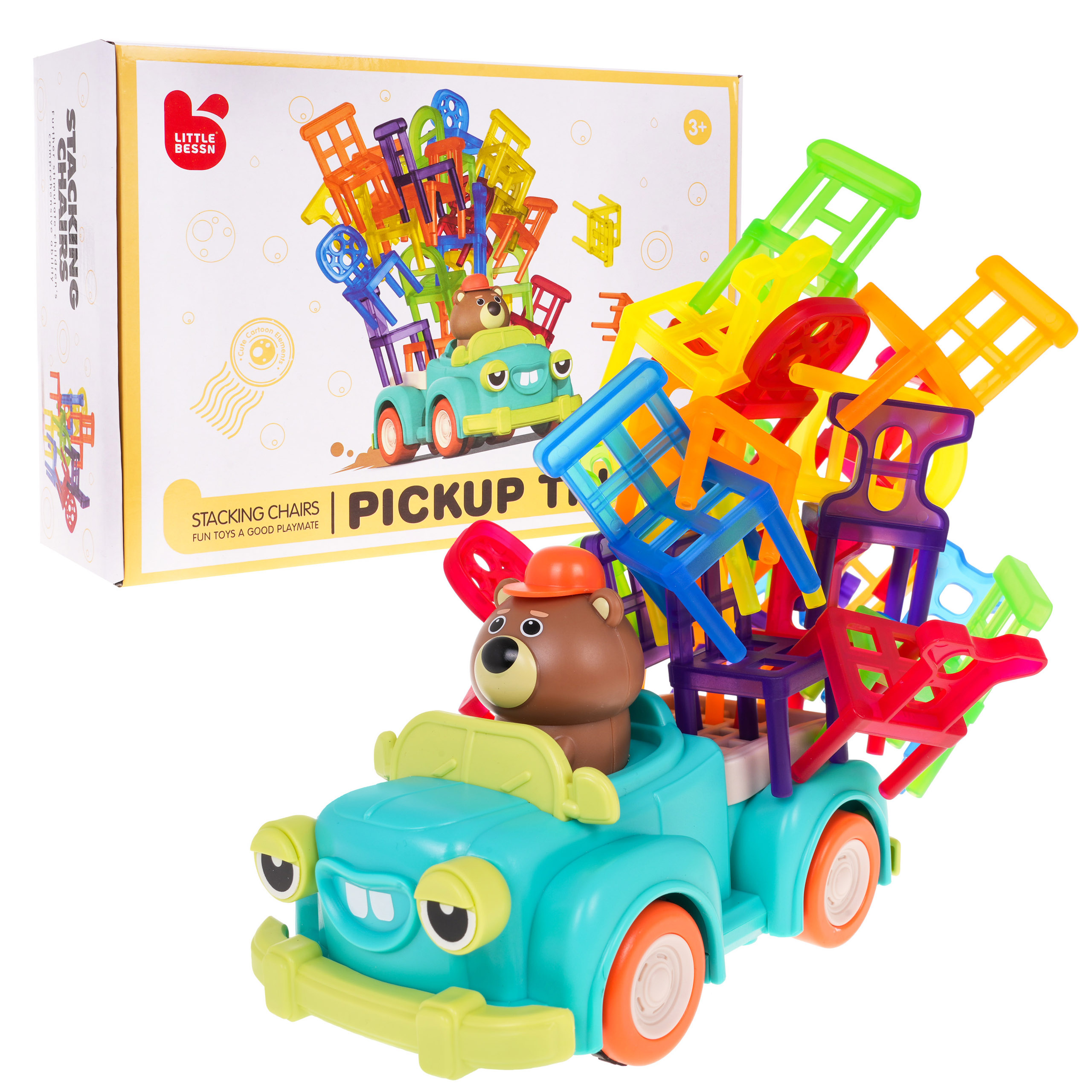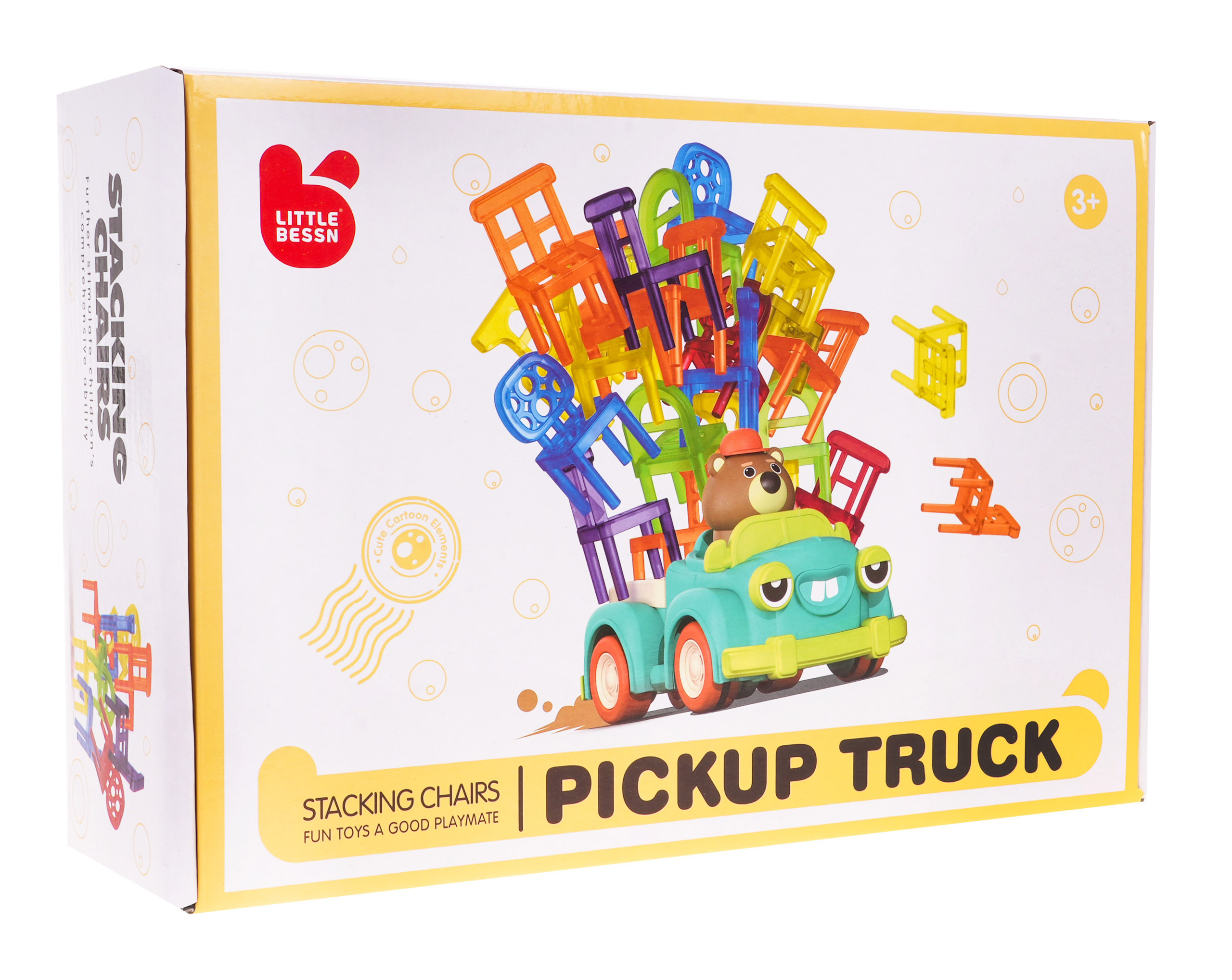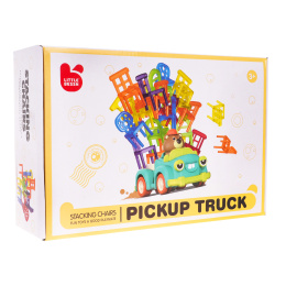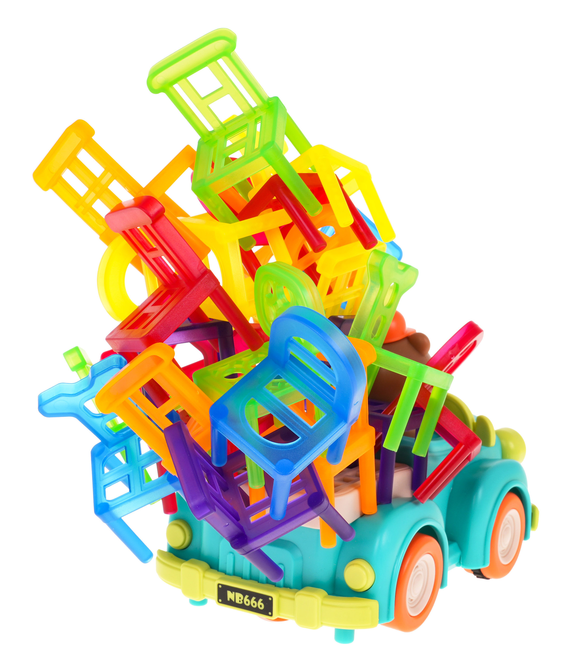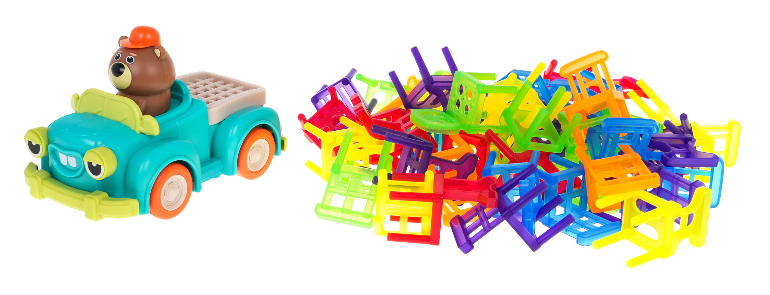 Hra Židličky je určena pro děti od 3 let. Sada obsahuje 48 židlí různých barev a tvarů a autíčko na baterie. Auto jezdí v kruhu a naším úkolem je naskládat na něj věž ze židlí. To je docela výzva. Průměr otáčení vozu můžete nastavit v rozmezí od 40 cm do 120 cm pomocí knoflíku ve spodní části vozu. Hru můžete hrát sami nebo s dalšími hráči a na výběr máte z mnoha variant, takže vás zábava rychle neomrzí. Všechny varianty hry jsou uvedeny v přiloženém návodu. hra má pozitivní vliv na koordinaci rukou a očí a přesnost. Autíčko je napájeno 2 bateriemi AA 1,5 V, baterie nejsou součástí balení.