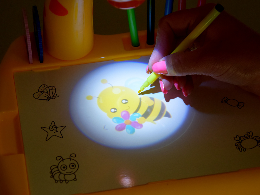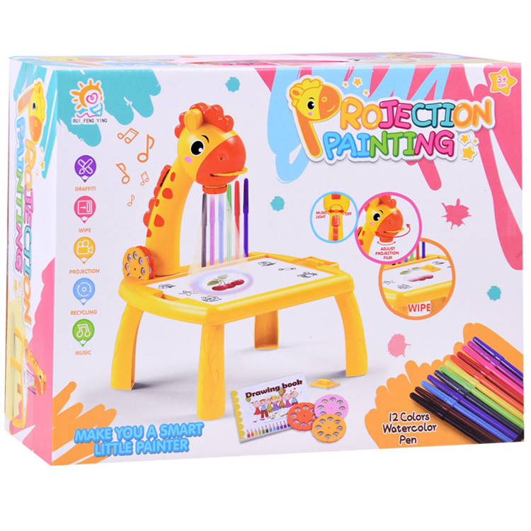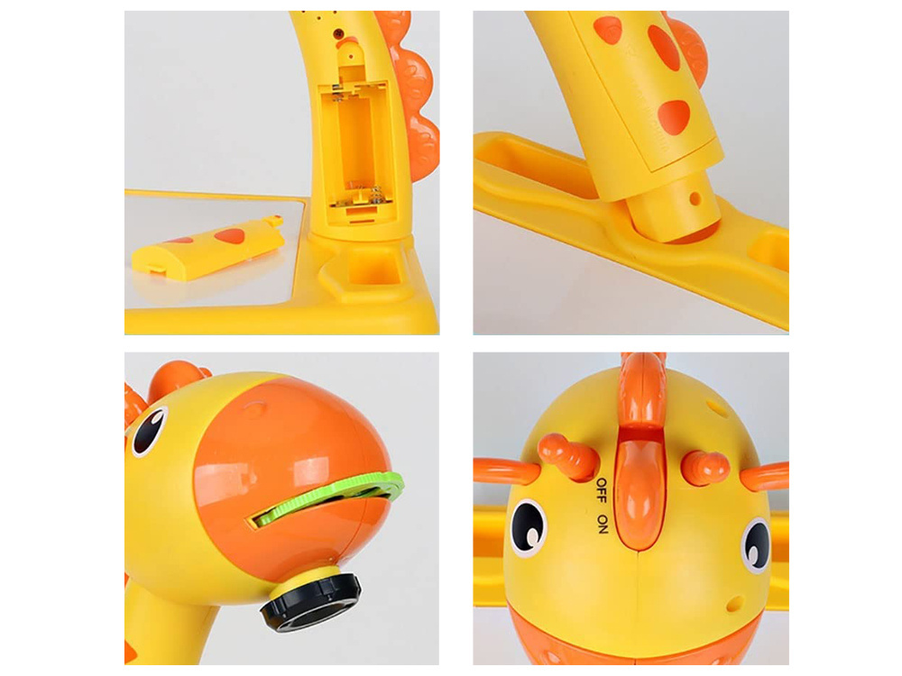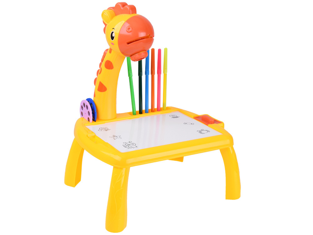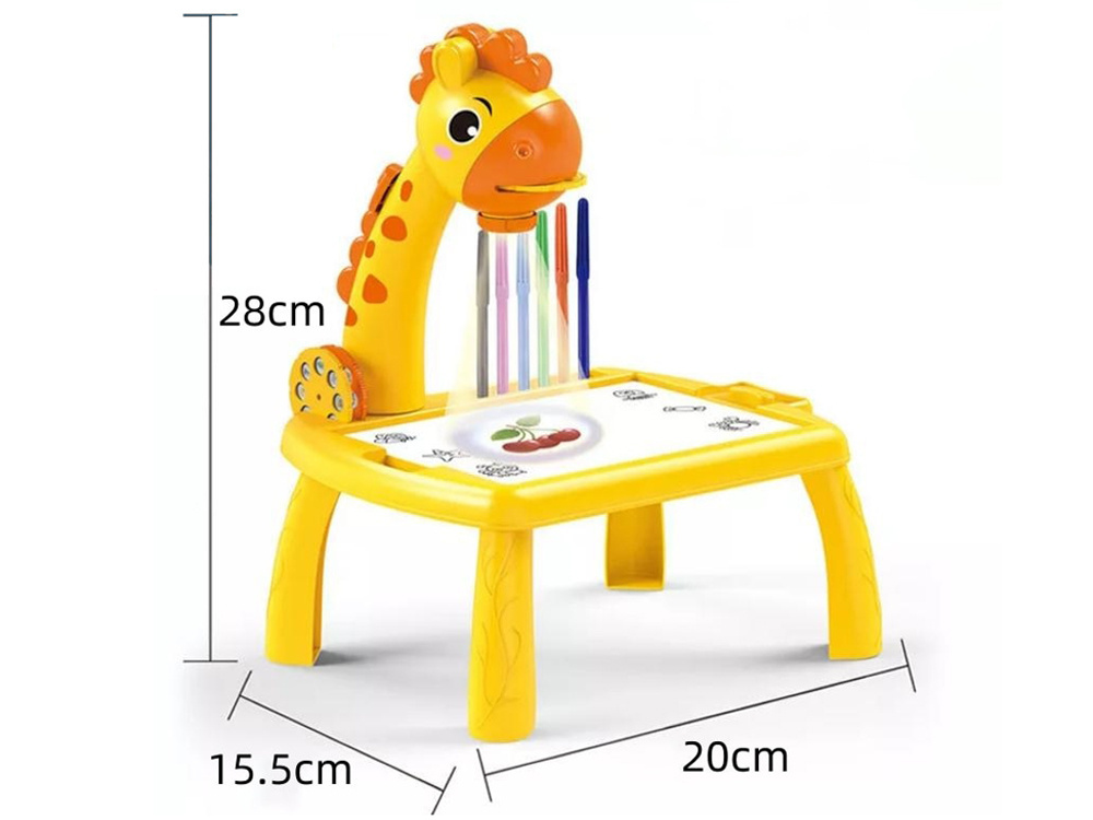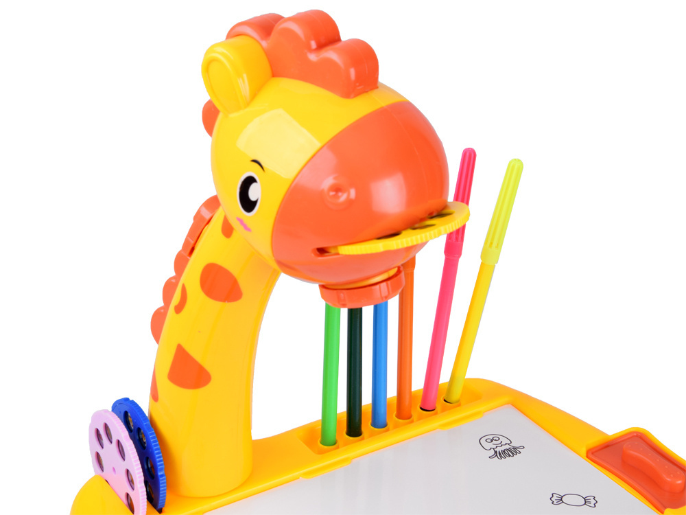 Projektor Žirafa je rozkošná hrací sada pro všechny děti, které rády tvoří, kreslí, malují, prohlížejí si obrázky a vytvářejí vlastní jedinečné příběhy a pohádky. Žirafí projektor má horní část, na kterou může dítě umístit fixy a kreslit nebo obkreslovat promítané obrázky z projektoru. Desku lze položit naplocho na samostatný stůl, stůl nebo k ní lze připojit čtyři nohy a vytvořit tak malý psací stůl. Využití zpětného projektoru je široké, obrázky (zvířata, vozidla, ovoce) můžete zobrazit na papíře, na stole, ale také večer na stěně. Projektor je velmi pěkně zpracovaný a bude s ním spousta zábavy.