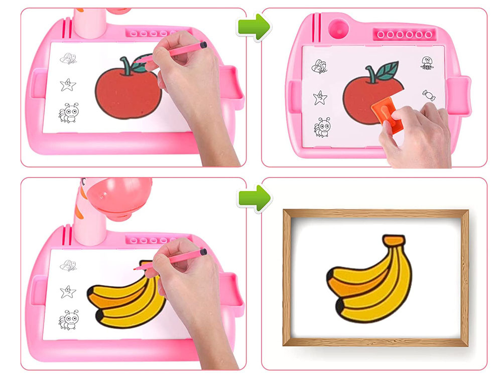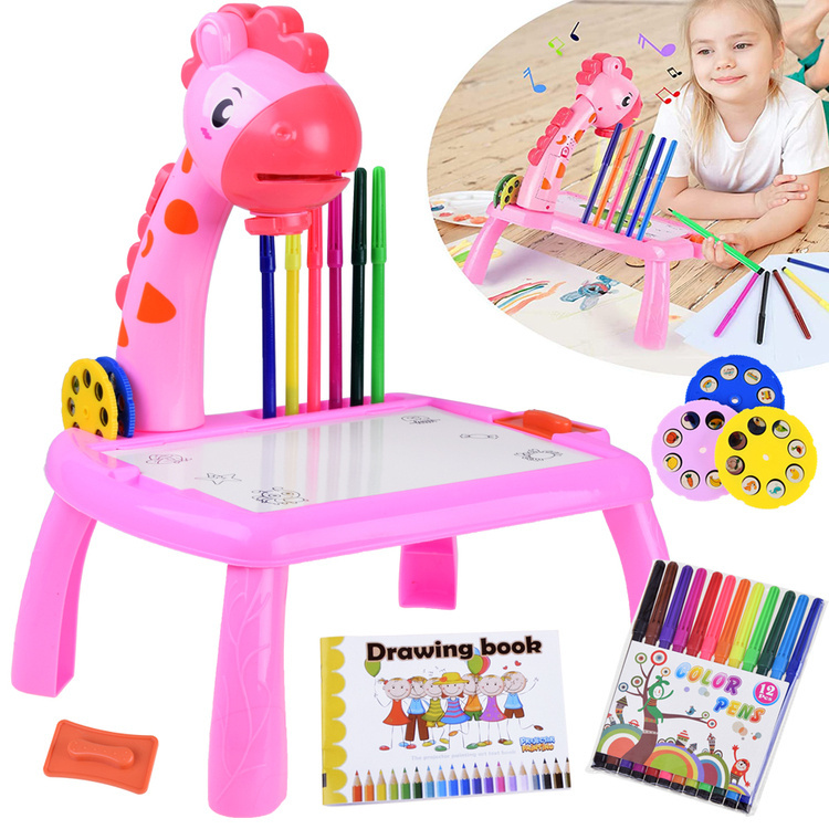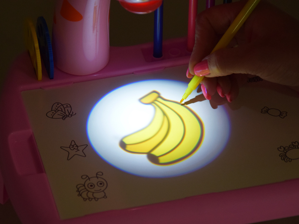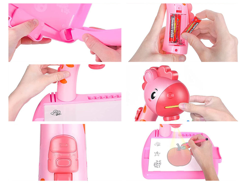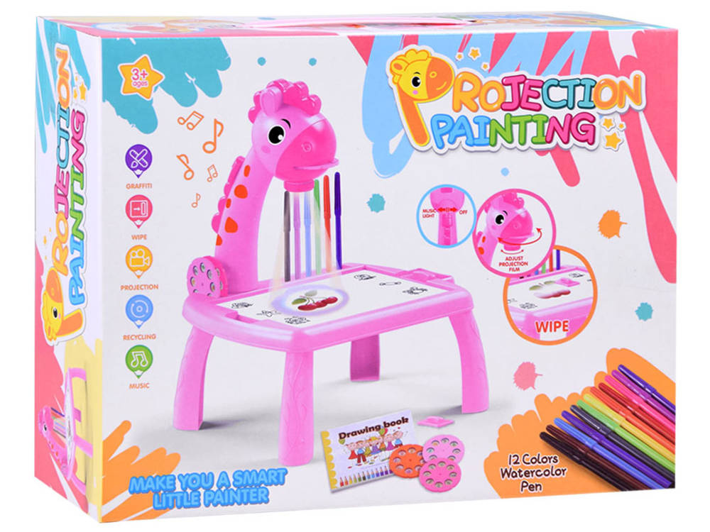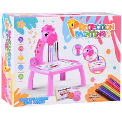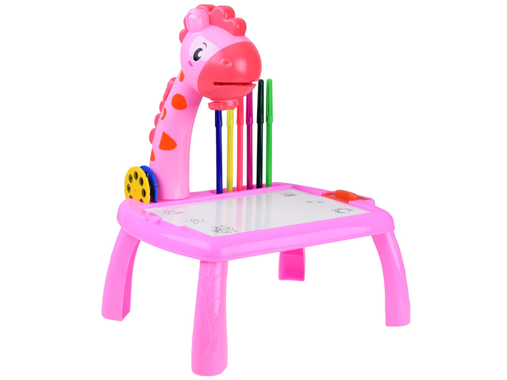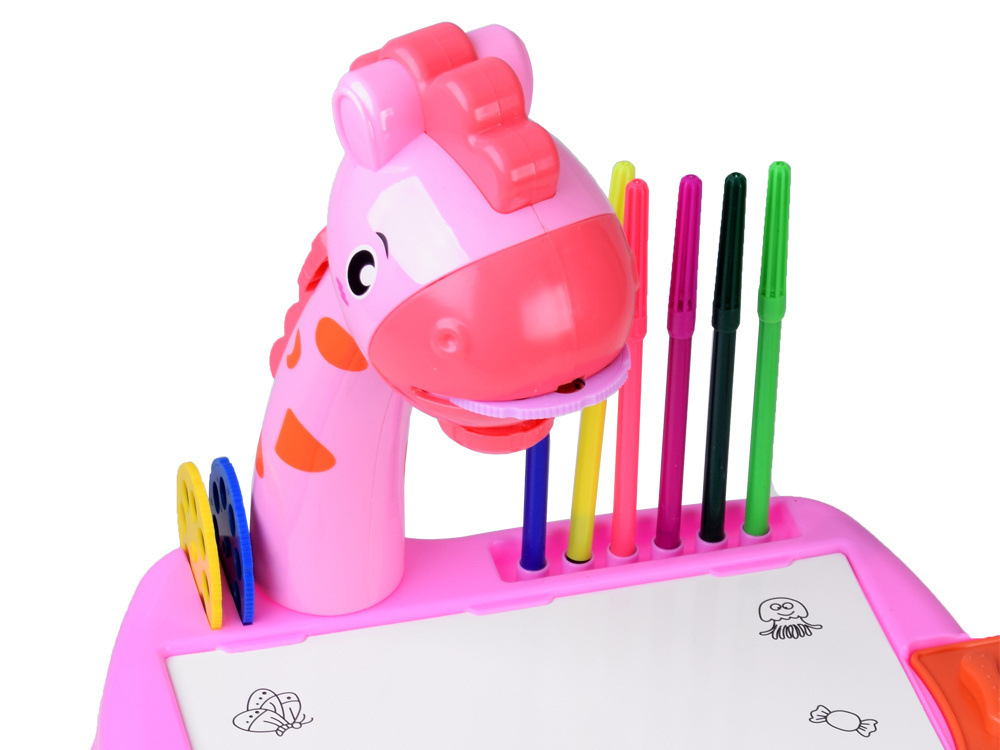 Projektor Žirafa je rozkošná hrací sada pro všechny děti, které rády tvoří, kreslí, malují, prohlížejí si obrázky a vytvářejí vlastní jedinečné příběhy a pohádky. Žirafí projektor má horní část, na kterou může dítě umístit fixy a kreslit nebo obkreslovat promítané obrázky z projektoru. Desku lze položit naplocho na samostatný stůl, stůl nebo k ní lze připojit čtyři nohy a vytvořit tak malý psací stůl. Využití zpětného projektoru je široké, obrázky (zvířata, vozidla, ovoce) můžete zobrazit na papíře, na stole, ale také večer na stěně. Projektor je velmi pěkně zpracovaný a bude s ním spousta zábavy.